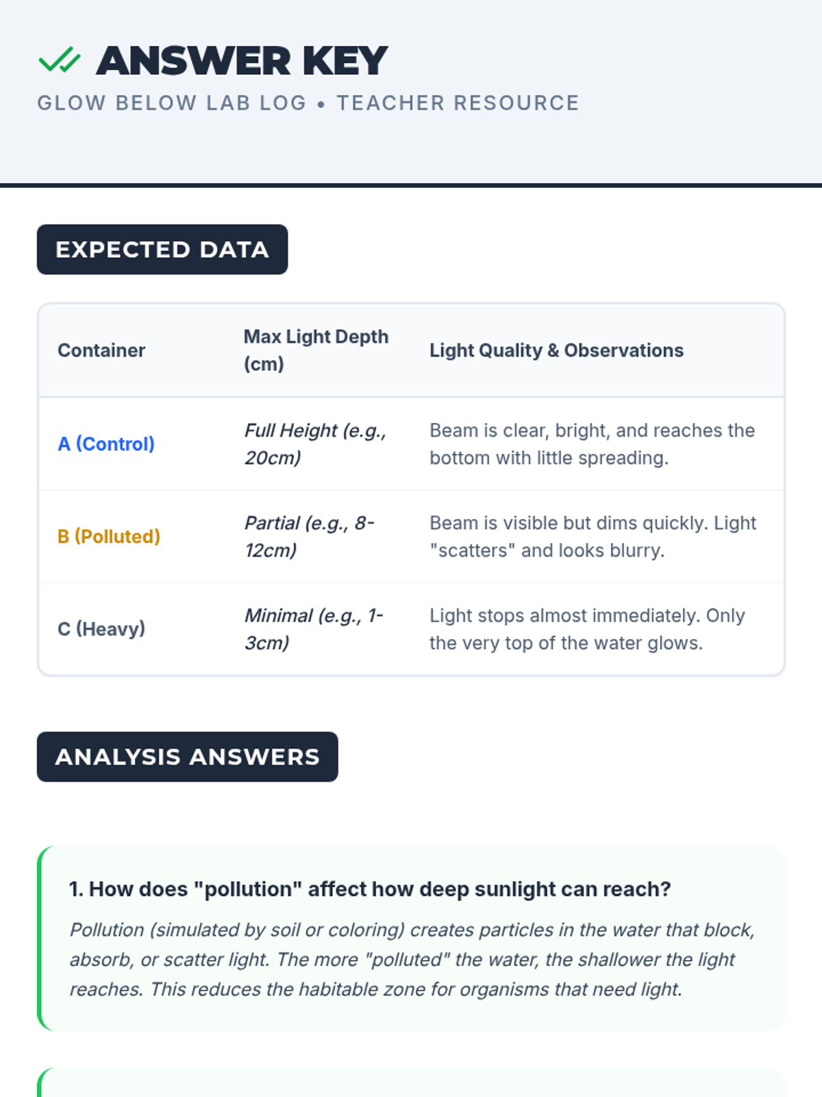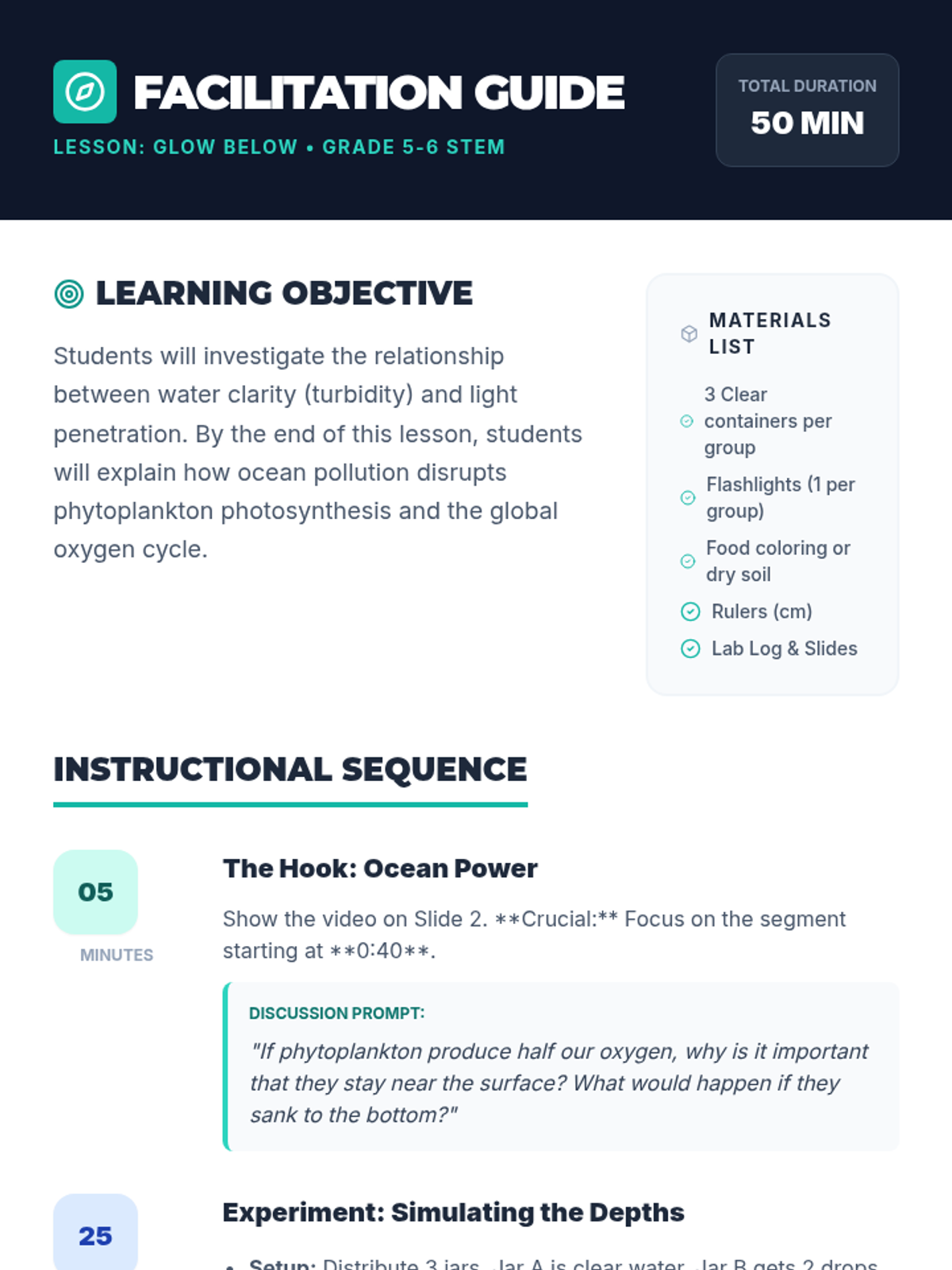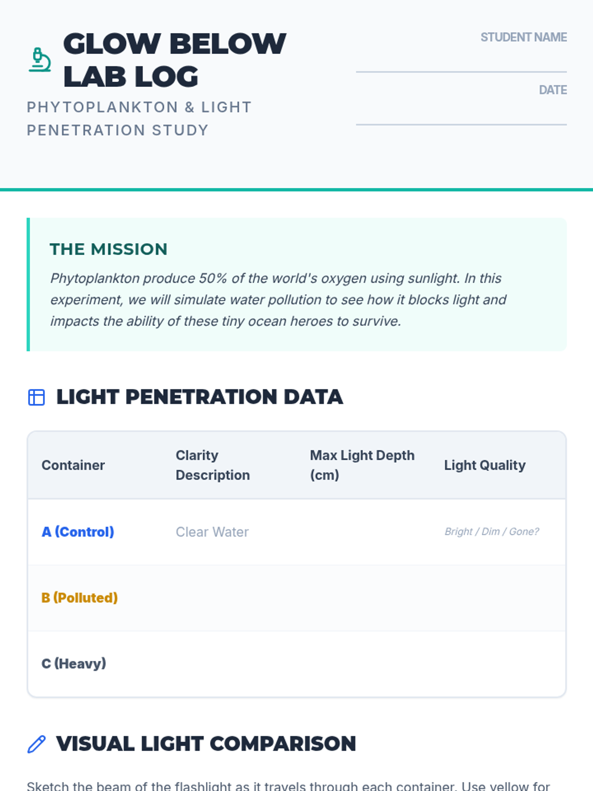 A hands-on STEM lesson exploring how water clarity affects light penetration and the ability of phytoplankton to produce oxygen through photosynthesis. Students simulate water pollution and measure how deep 'sunlight' can reach.