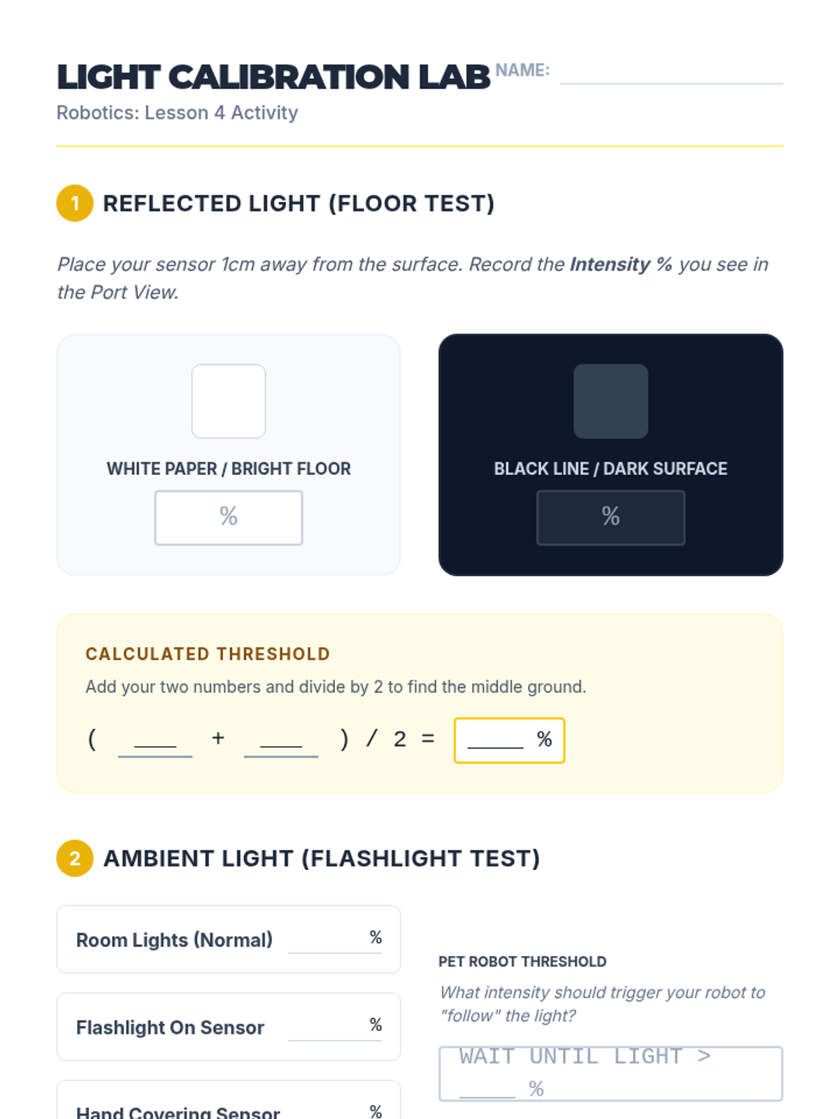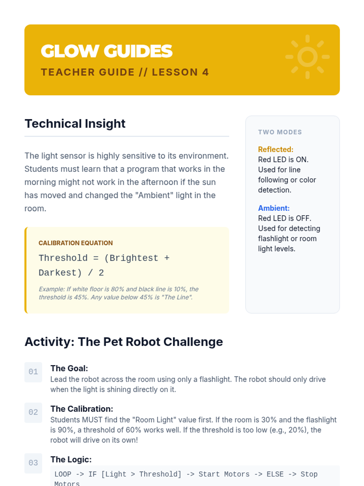 Explores light intensity and color sensors, focusing on calibration and using environmental light levels to trigger specific robot behaviors.