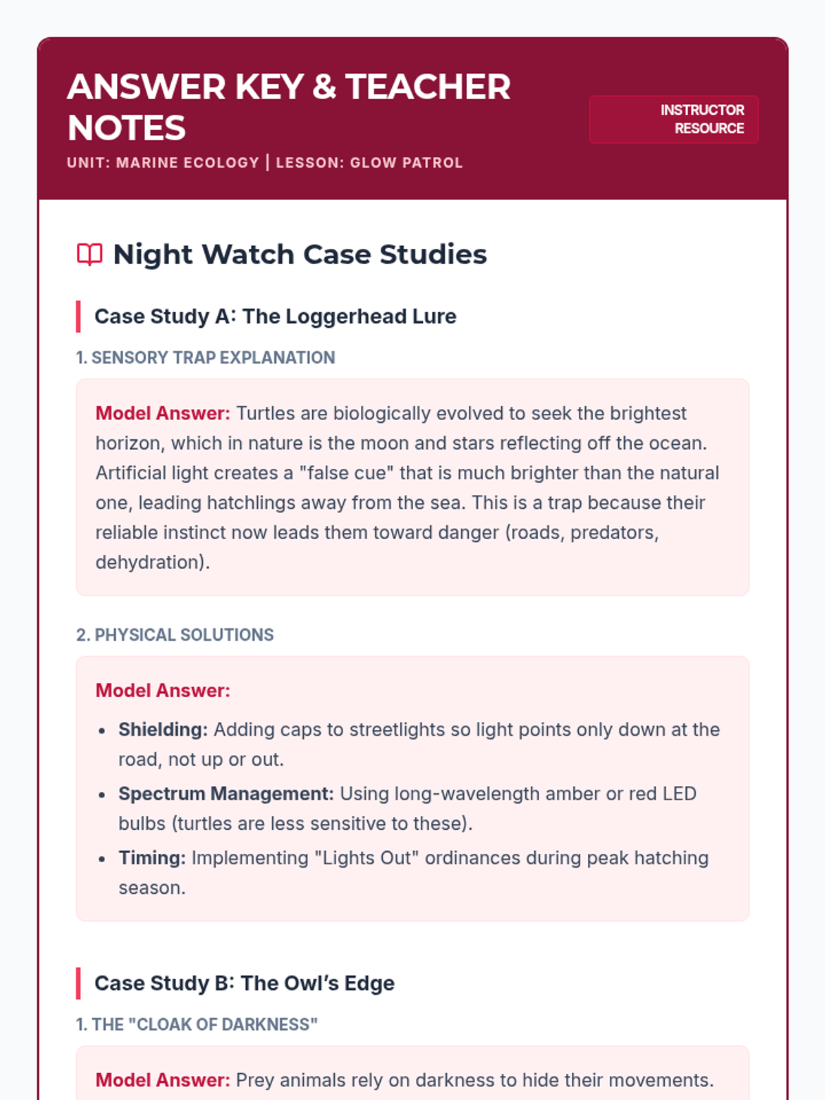 A 45-minute lesson exploring how we measure light pollution and its profound impact on marine ecosystems, habitat connectivity, and predator-prey relationships. Students analyze case studies of sea turtles and nocturnal hunters to understand the ecological cost of a world that never gets dark.