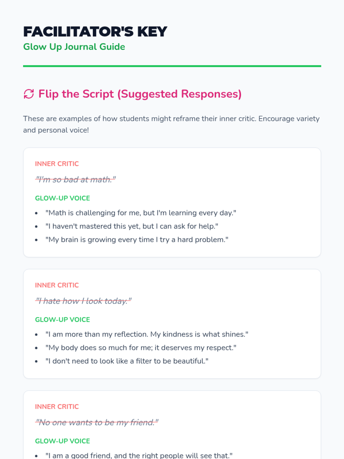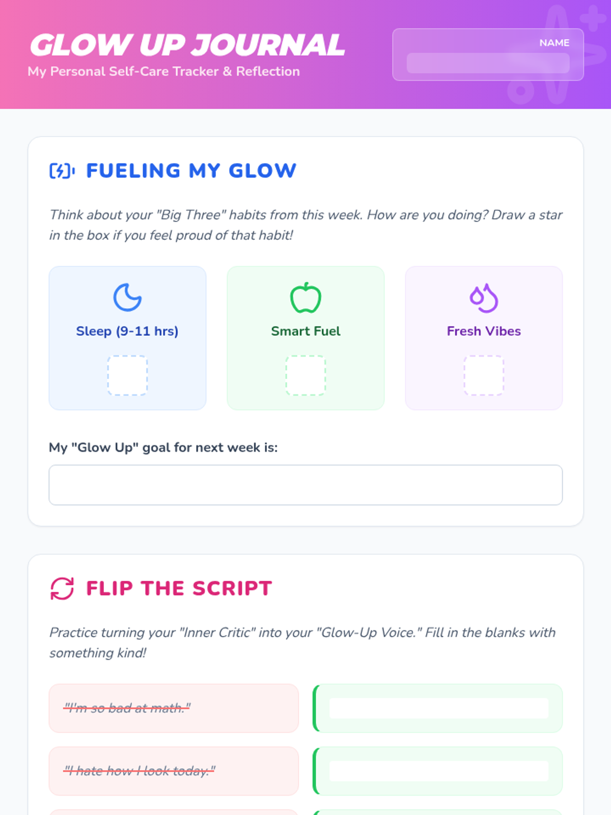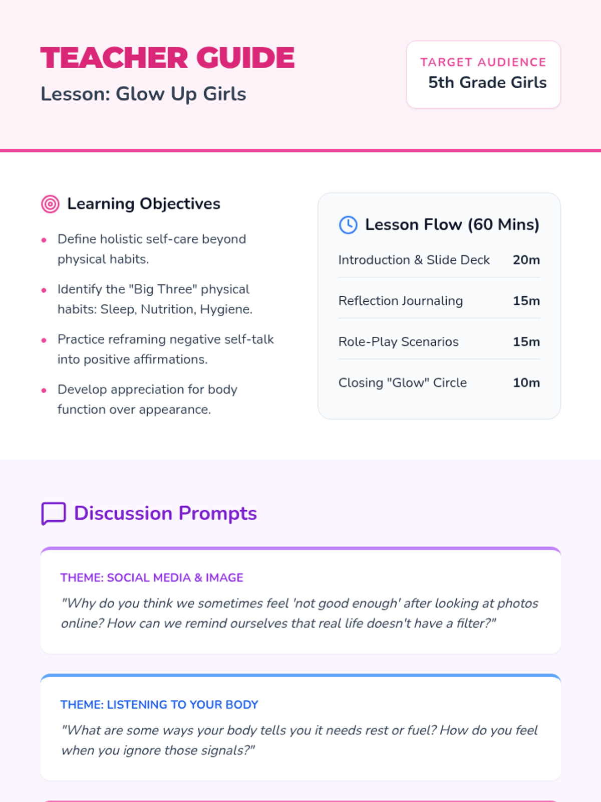 A comprehensive Social Emotional Learning lesson designed for 5th-grade girls focusing on holistic self-care, encompassing physical health habits, positive internal dialogue, and healthy body image.