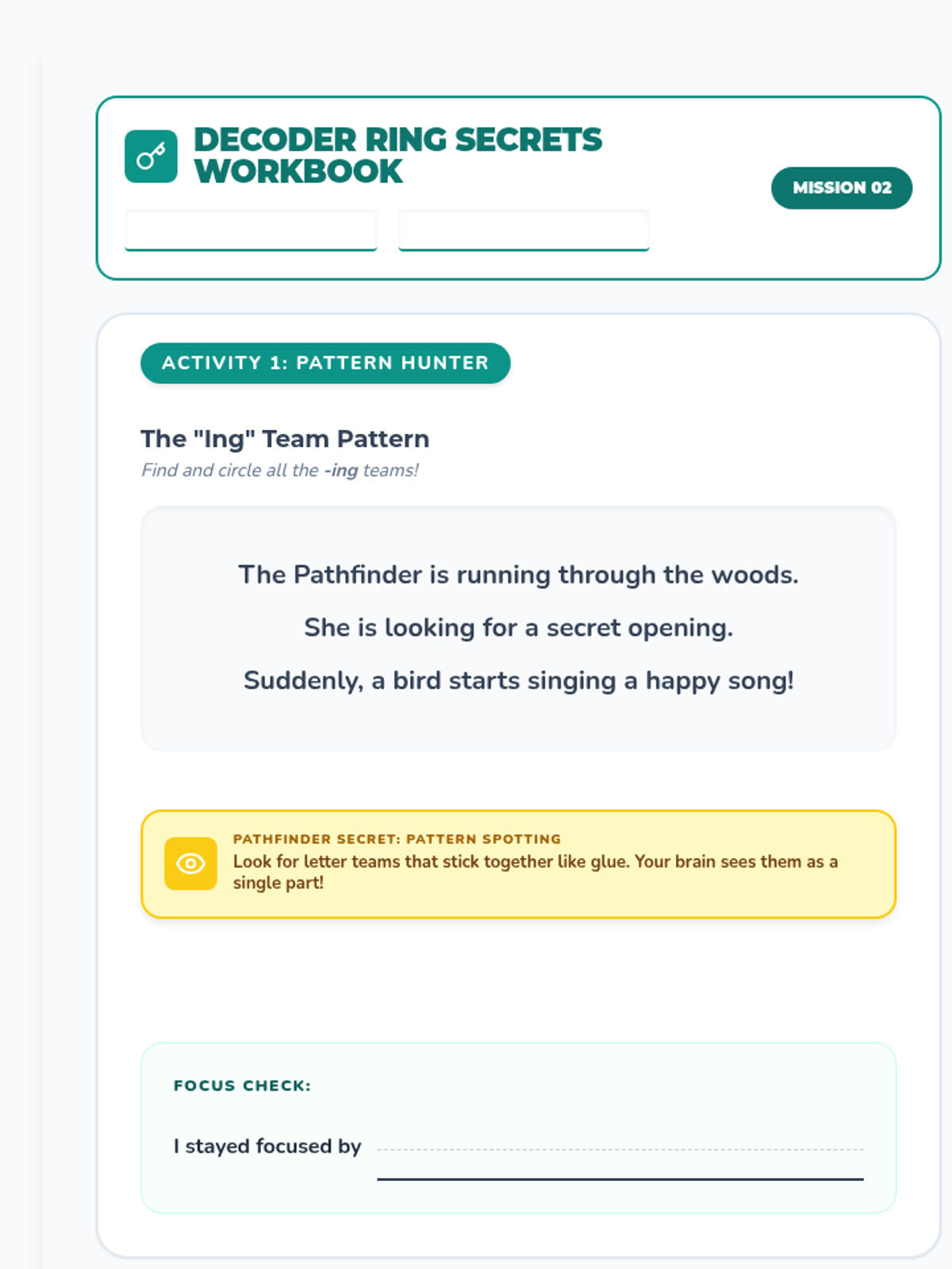 Focuses on phonics and pattern spotting in text, teaching students that reading is a form of detective work where we look for clues to unlock meaning.