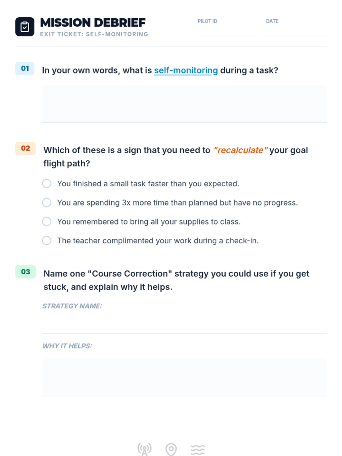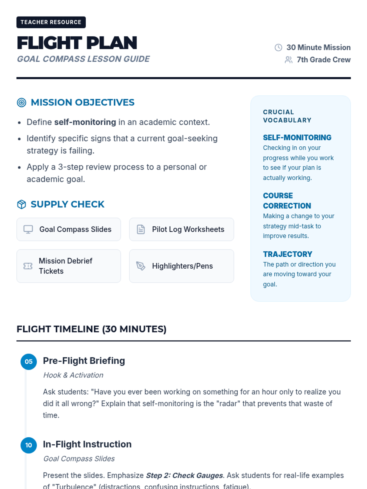 A 30-minute lesson for 7th graders focused on the essential skills of self-monitoring and goal review. Students will learn a 3-step process for checking their progress and adjusting their strategies to stay on course toward their objectives.