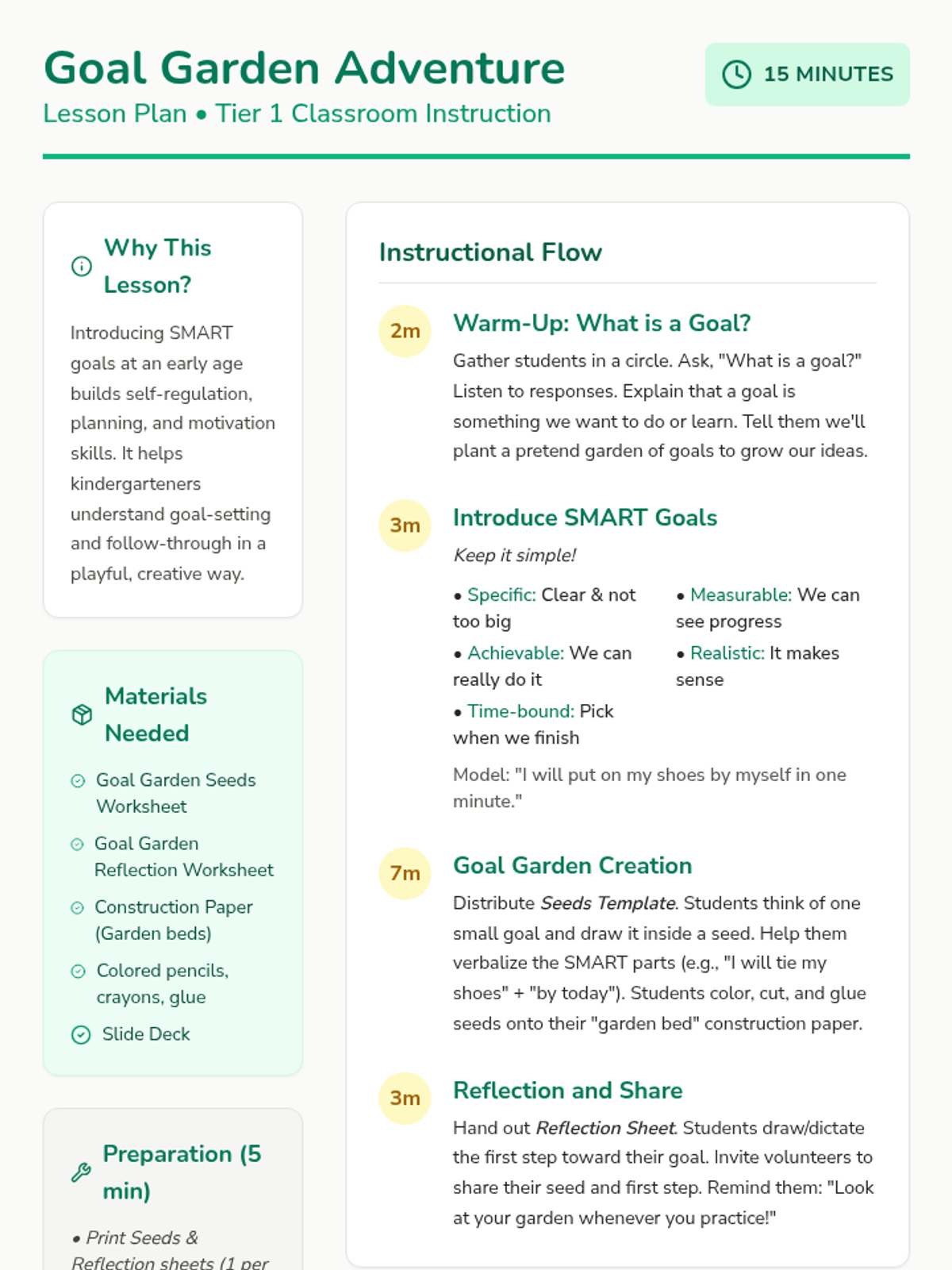 A whimsical, 15-minute kindergarten lesson on SMART goals using a garden theme to help students plan specific and achievable tasks.