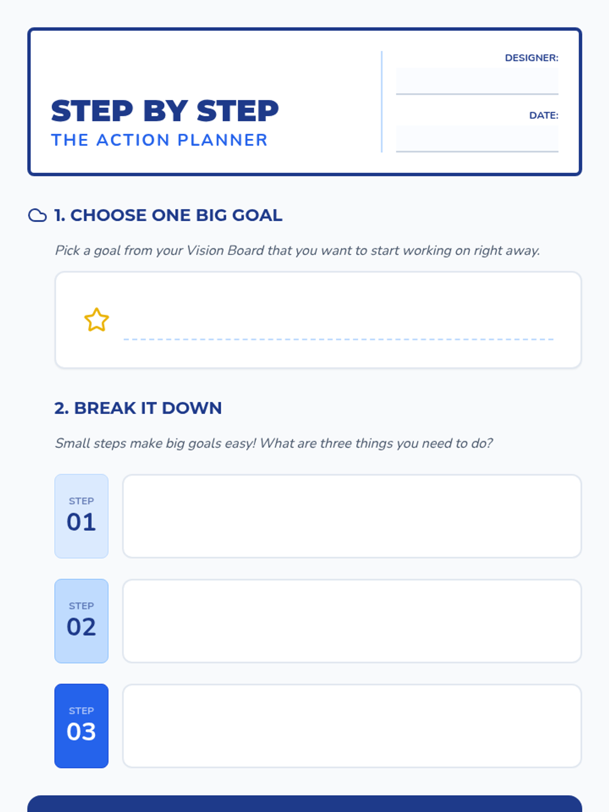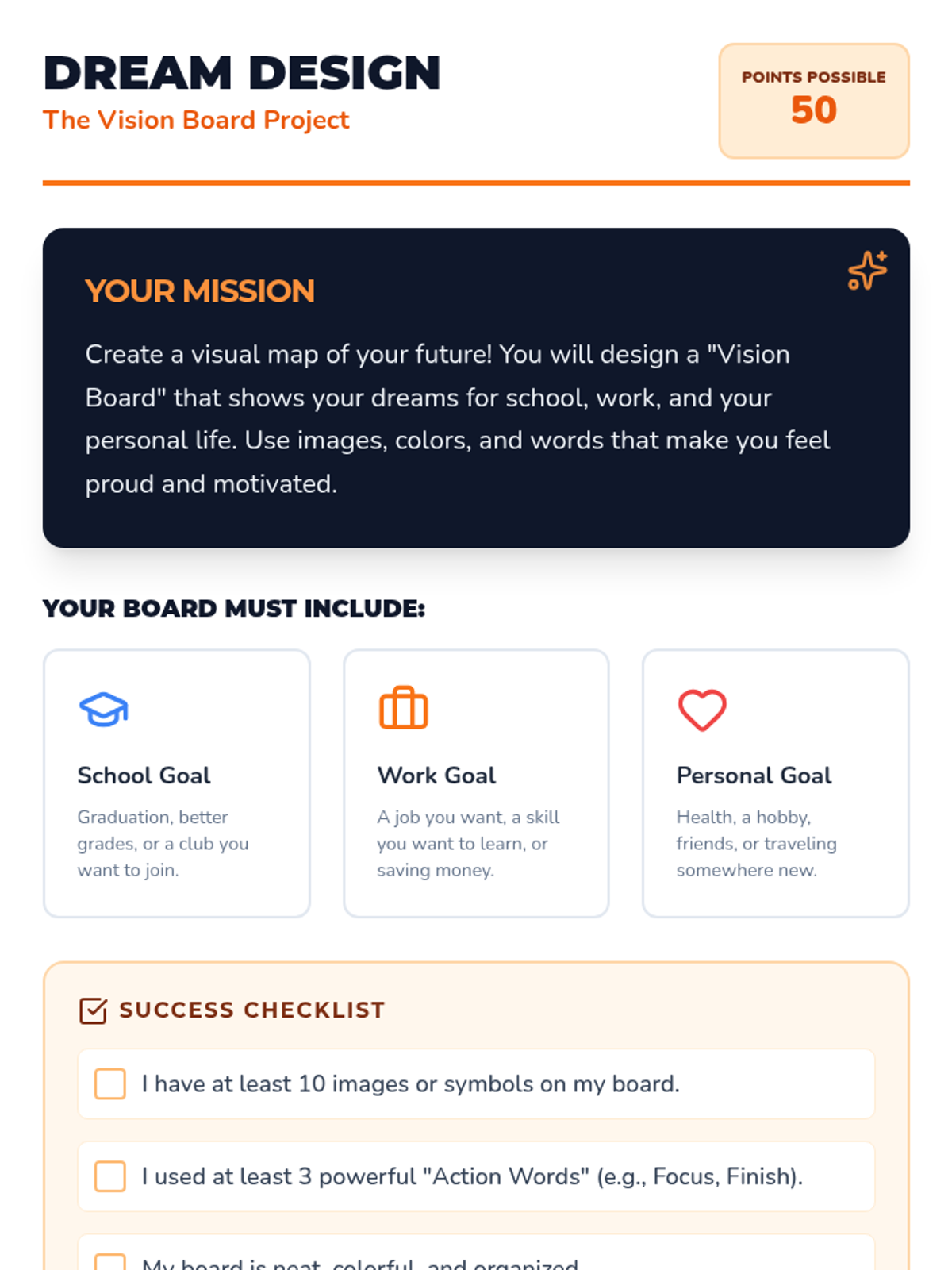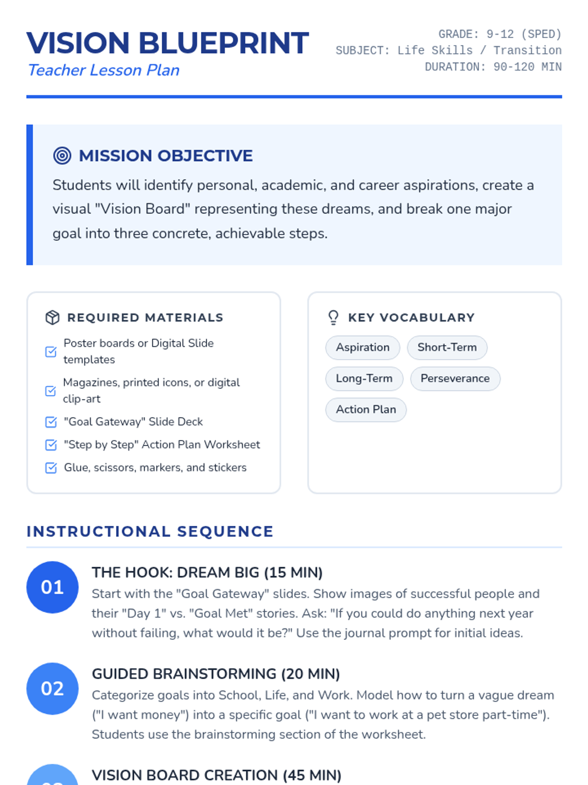 A high school special education lesson focused on visualizing personal aspirations and creating actionable steps through vision boards and goal-setting activities. Students will explore academic, personal, and career goals while learning about perseverance and celebrating milestones.
