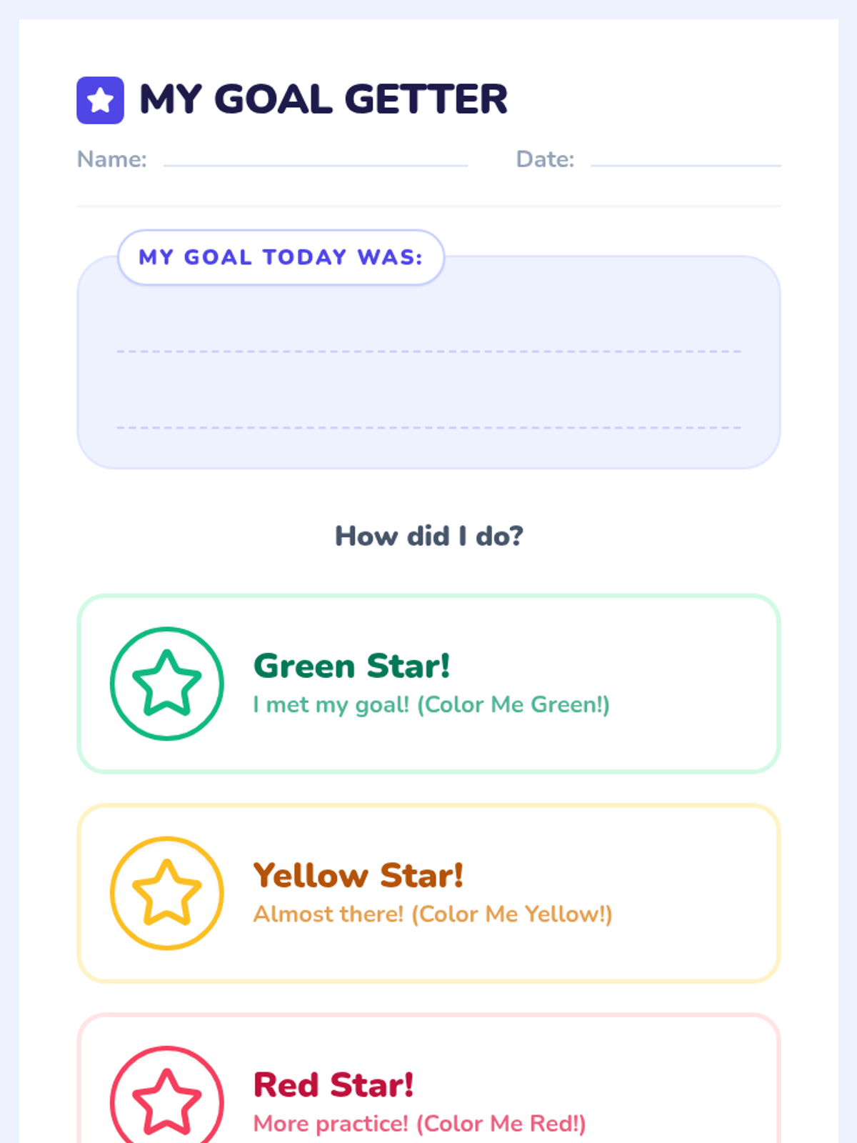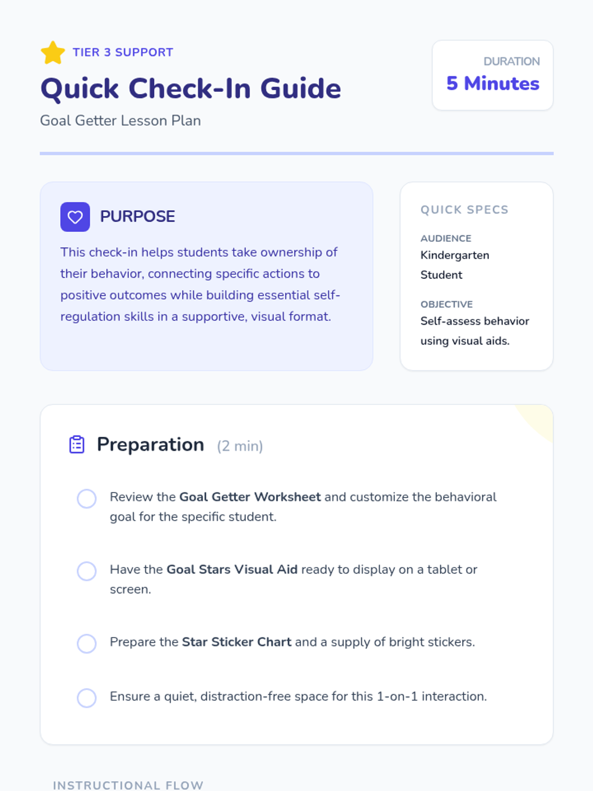 A quick, visual behavior check-in for kindergarteners to review progress, connect actions to outcomes, and receive immediate reinforcement.