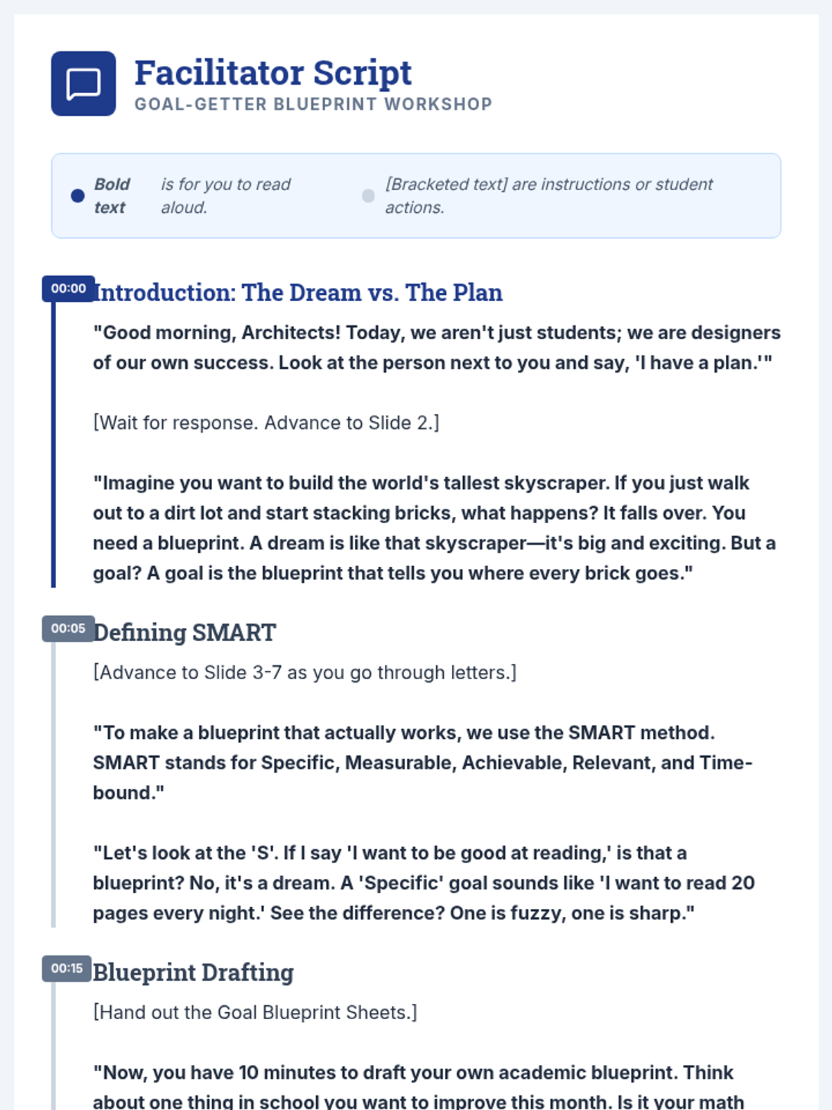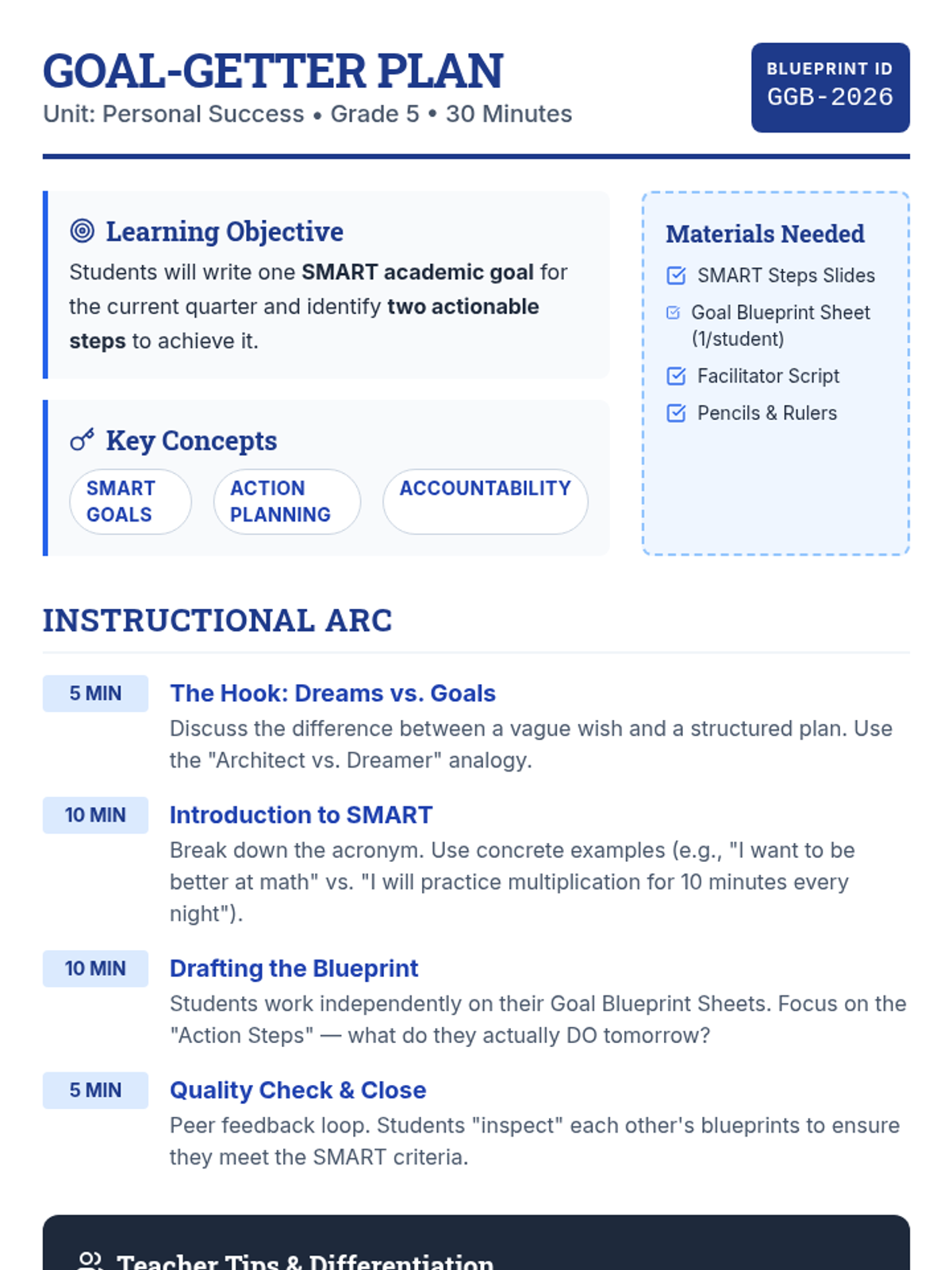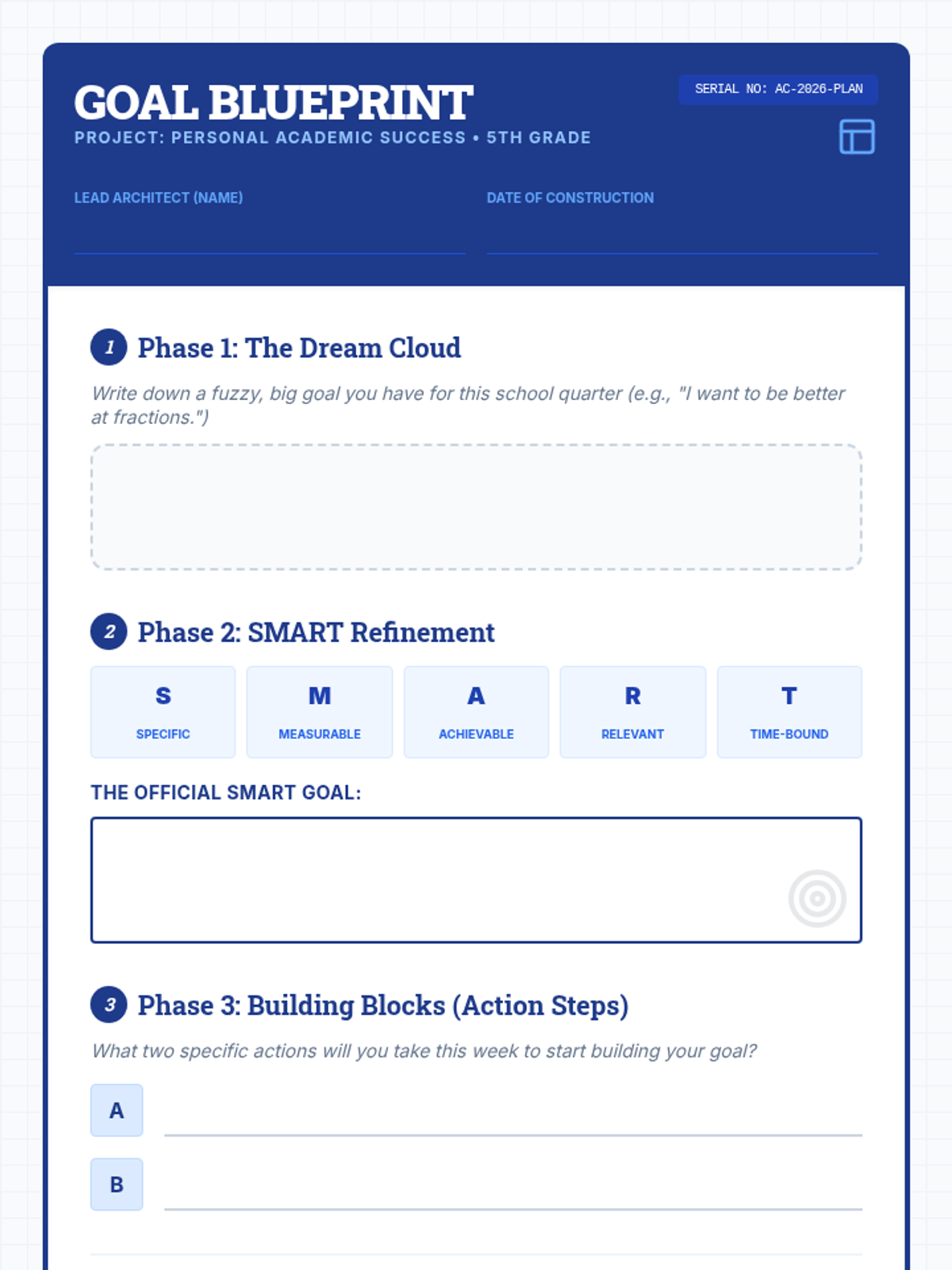 A 30-minute goal-setting workshop for 5th graders using the blueprint metaphor to transform vague dreams into SMART academic goals with actionable steps.