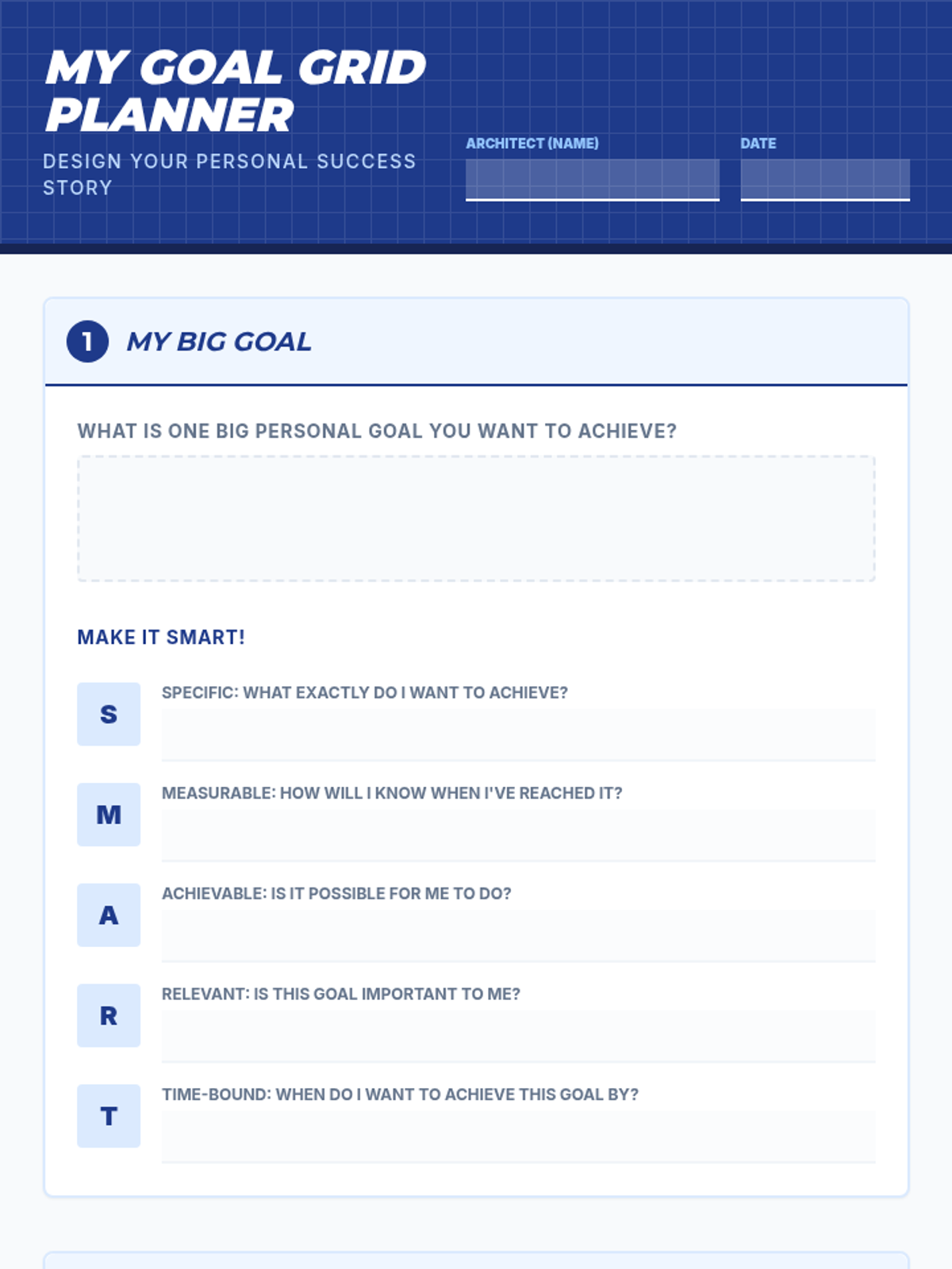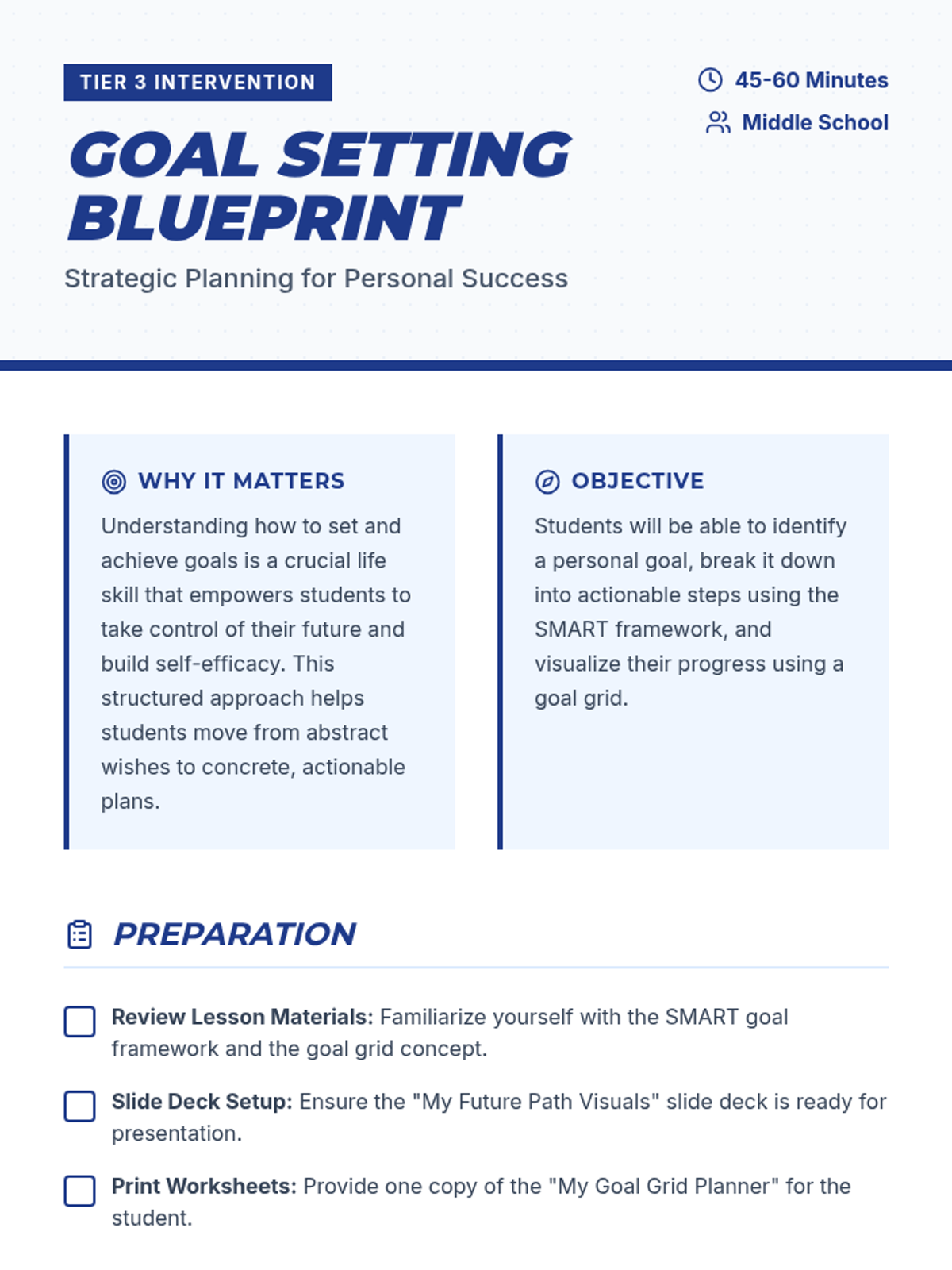 An individual Tier 3 lesson focused on helping students set SMART goals and break them down into actionable steps using a visual planning grid. Students will reflect on their aspirations and create a concrete roadmap for success.