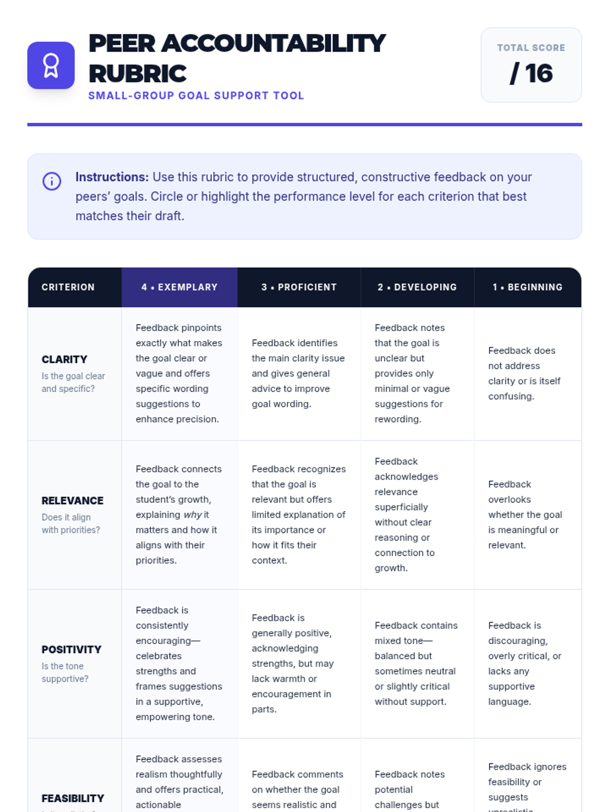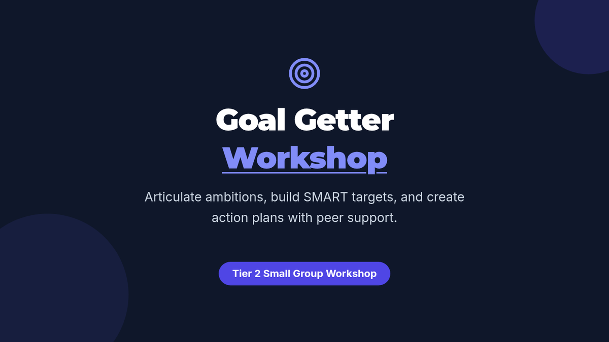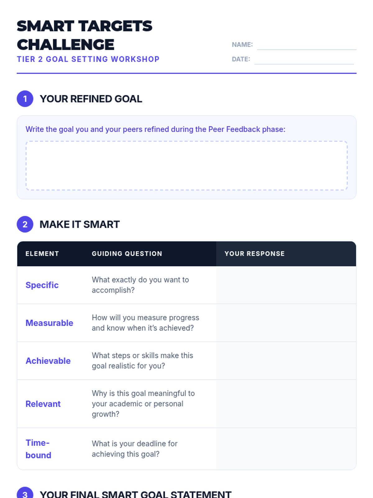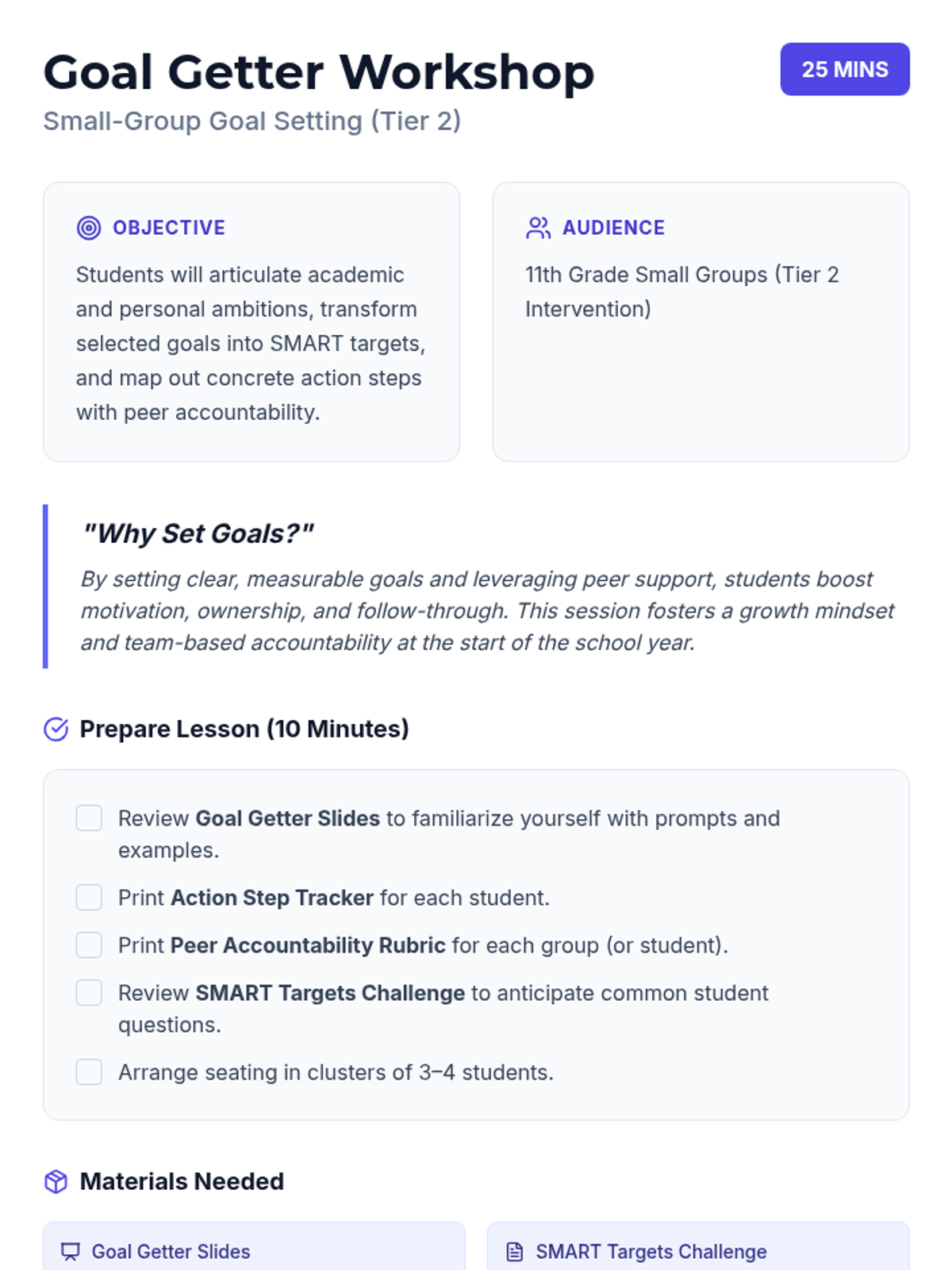 A 25-minute Tier 2 workshop for 11th grade students focused on articulating academic and personal ambitions, breaking them into SMART targets, and creating actionable plans with peer support.