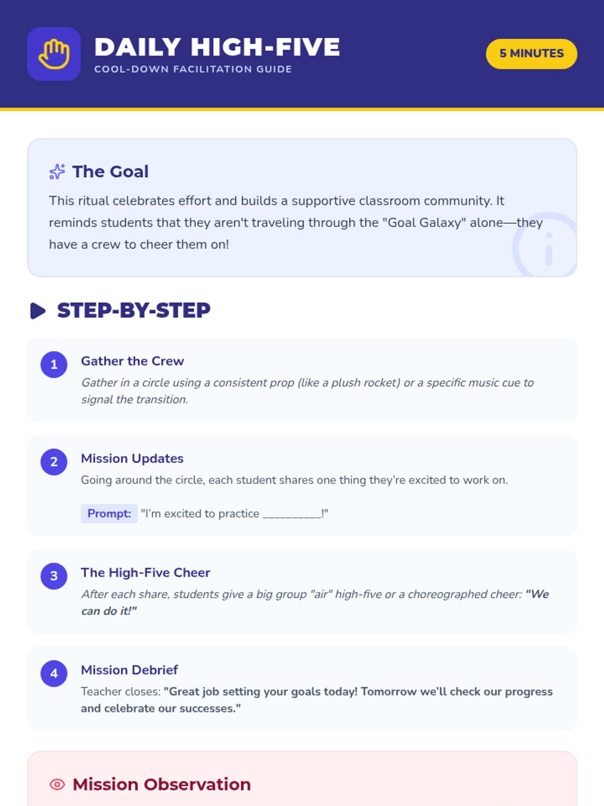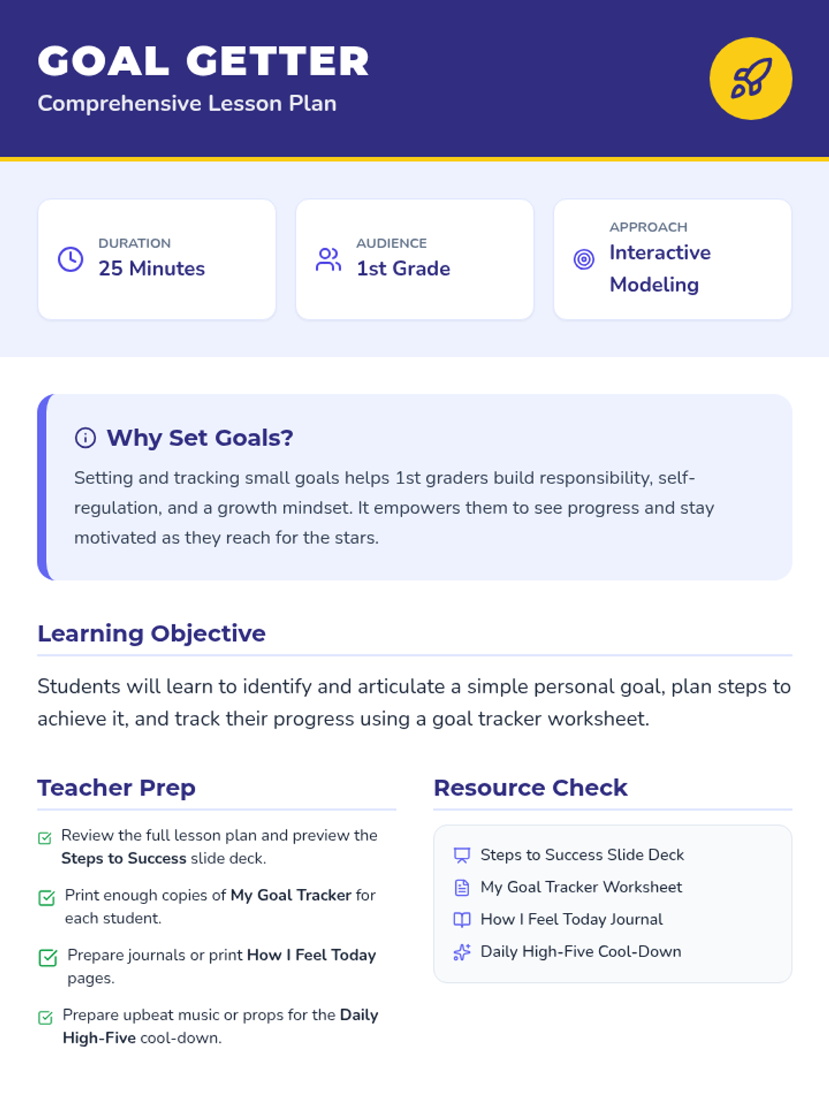 A 25-minute lesson for 1st graders to learn how to set simple personal goals, plan steps for success, and track their progress using a 'Goal Galaxy' theme.