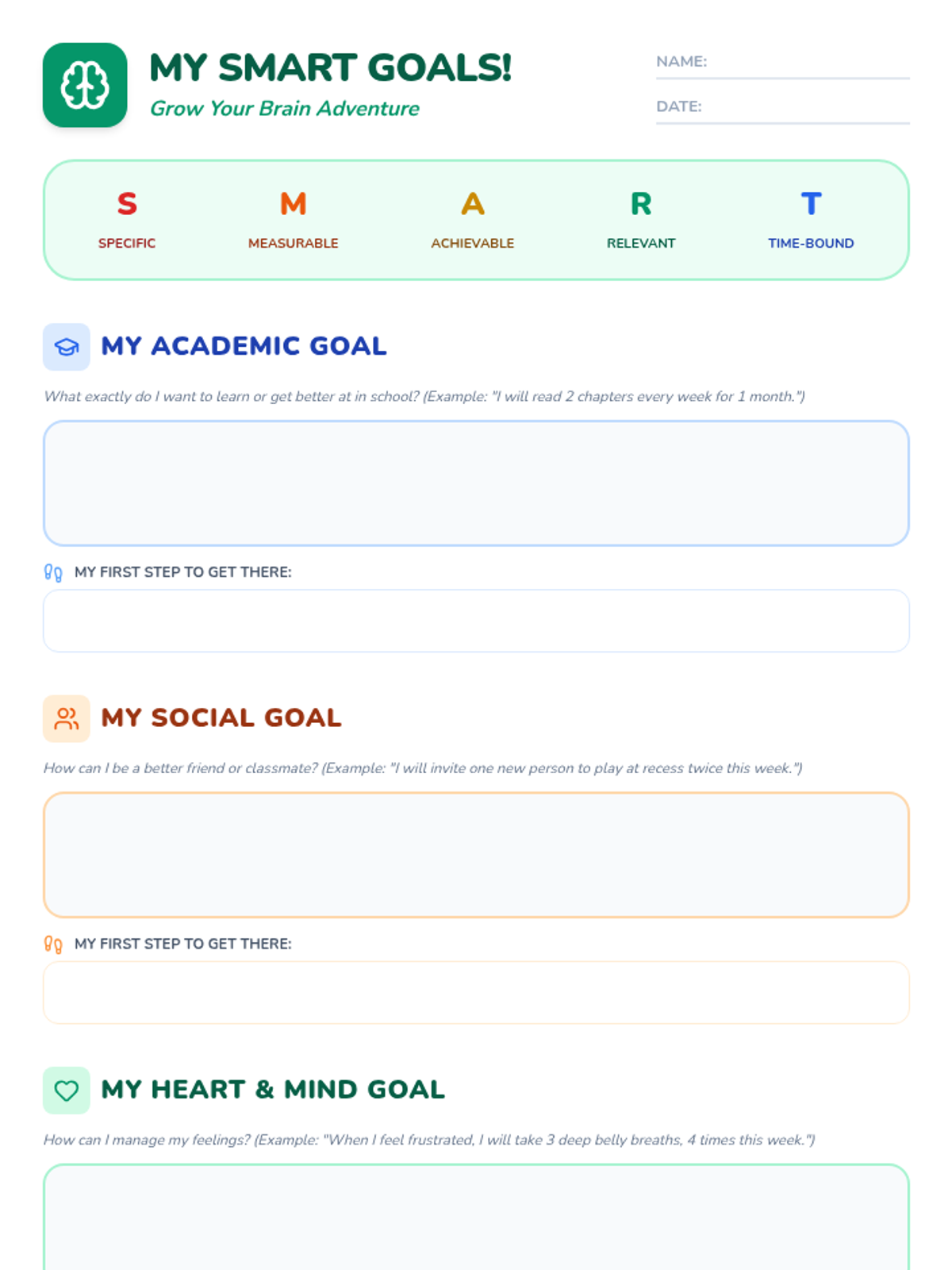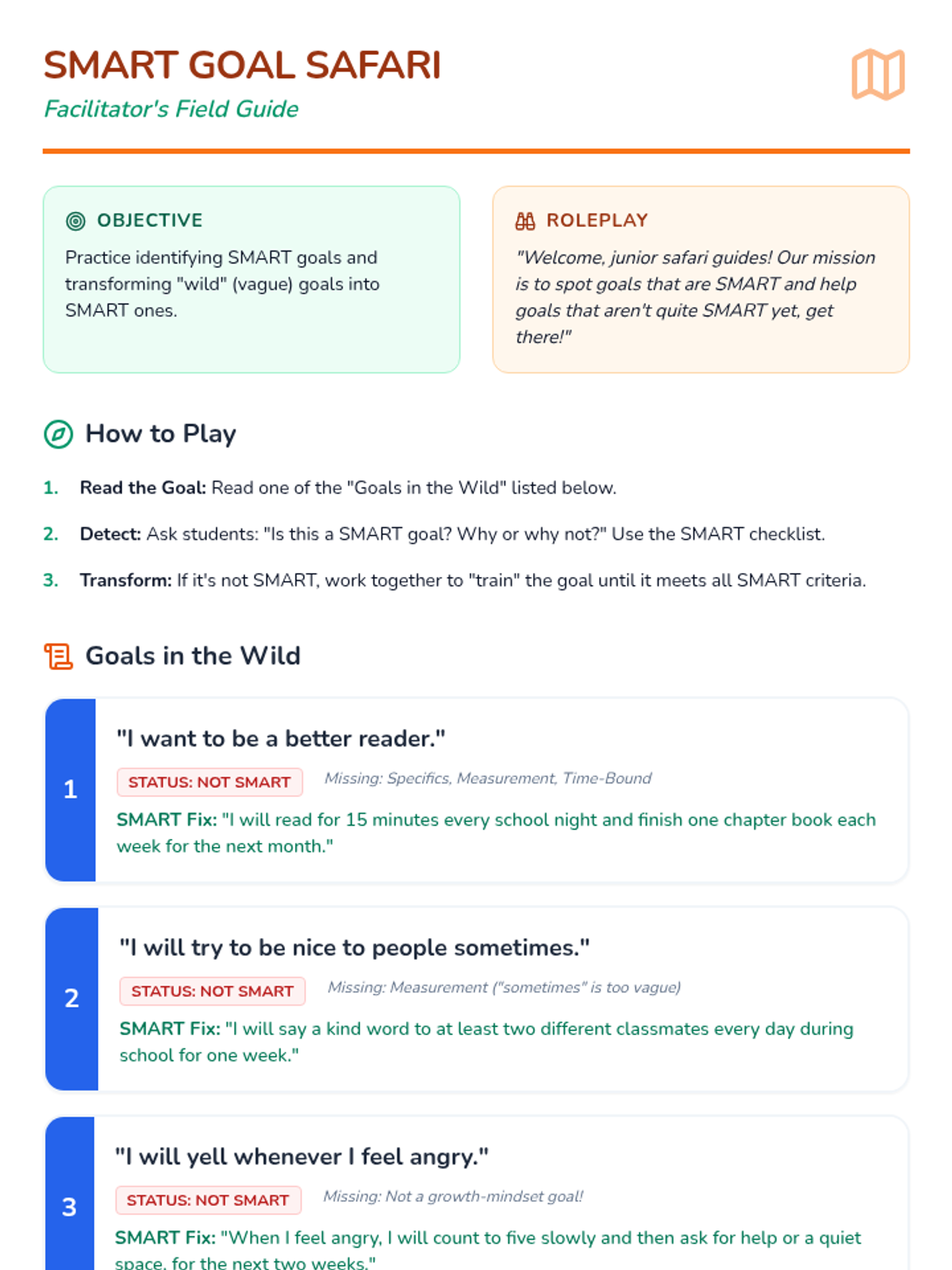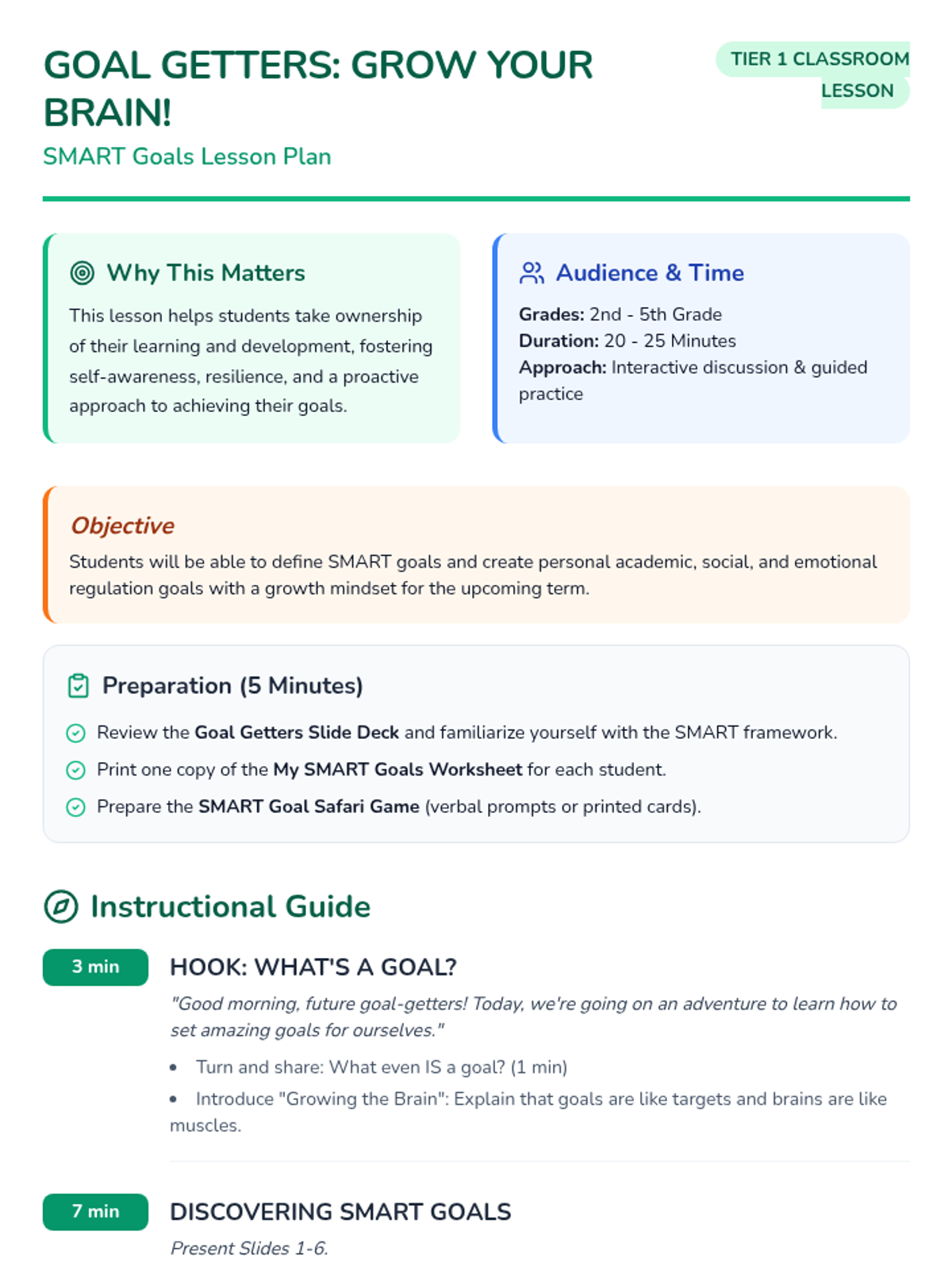 This interactive lesson empowers students in grades 2-5 to set SMART goals (Specific, Measurable, Achievable, Relevant, Time-bound) using a growth mindset approach. Through a safari-themed game and guided practice, students create personal academic, social, and emotional regulation goals to strengthen their 'brain muscles.'