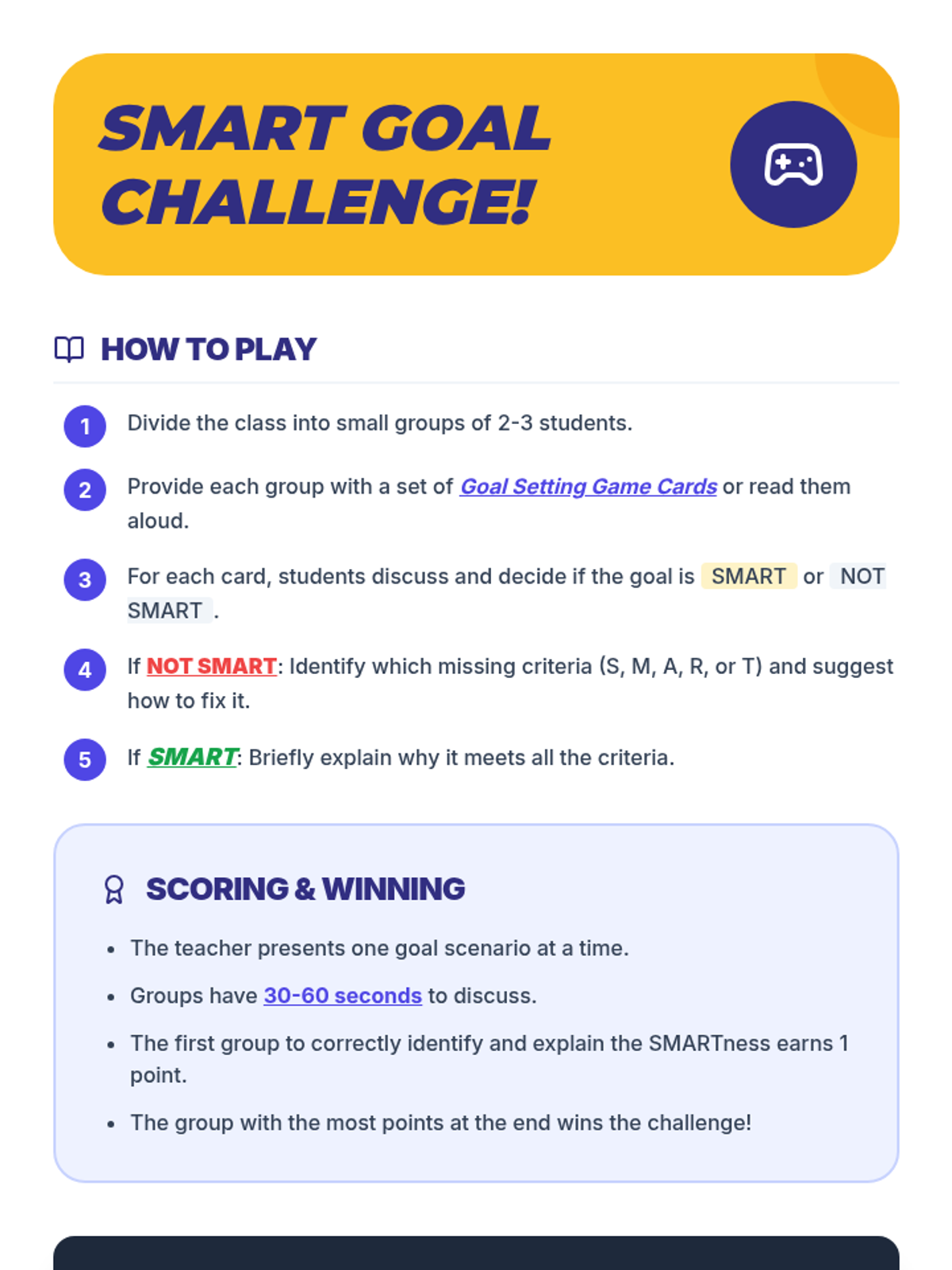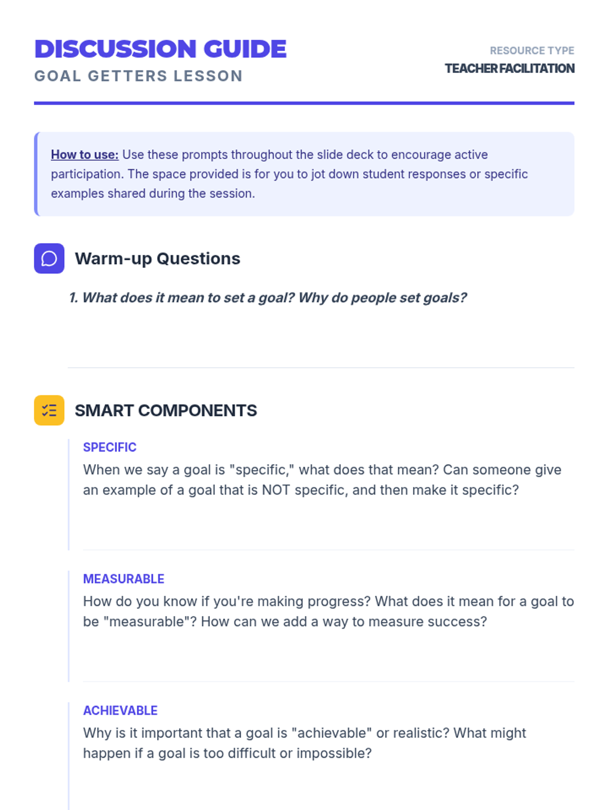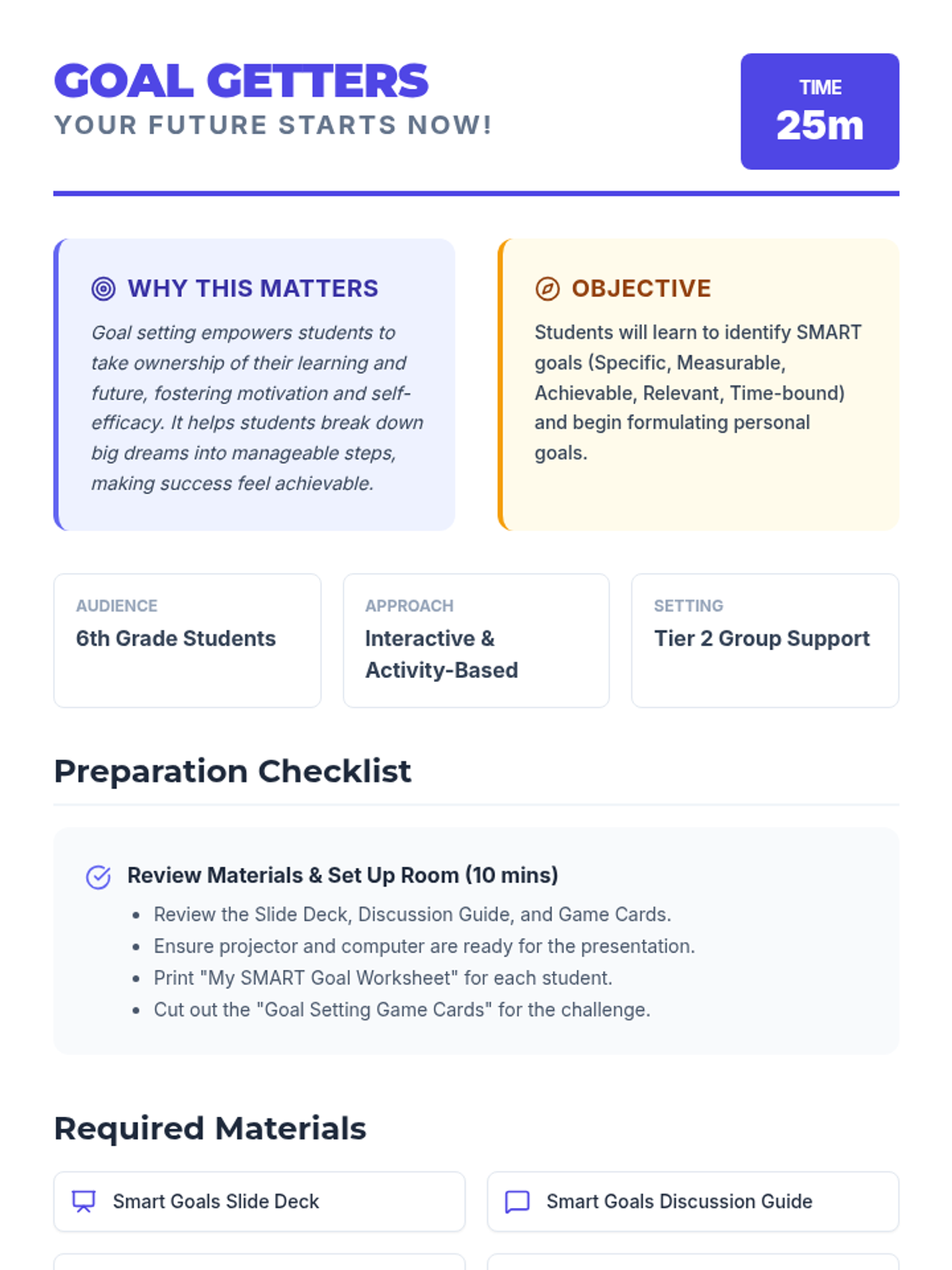 A 25-minute Tier 2 group support lesson for 6th graders to learn and practice setting SMART goals for personal and academic growth.