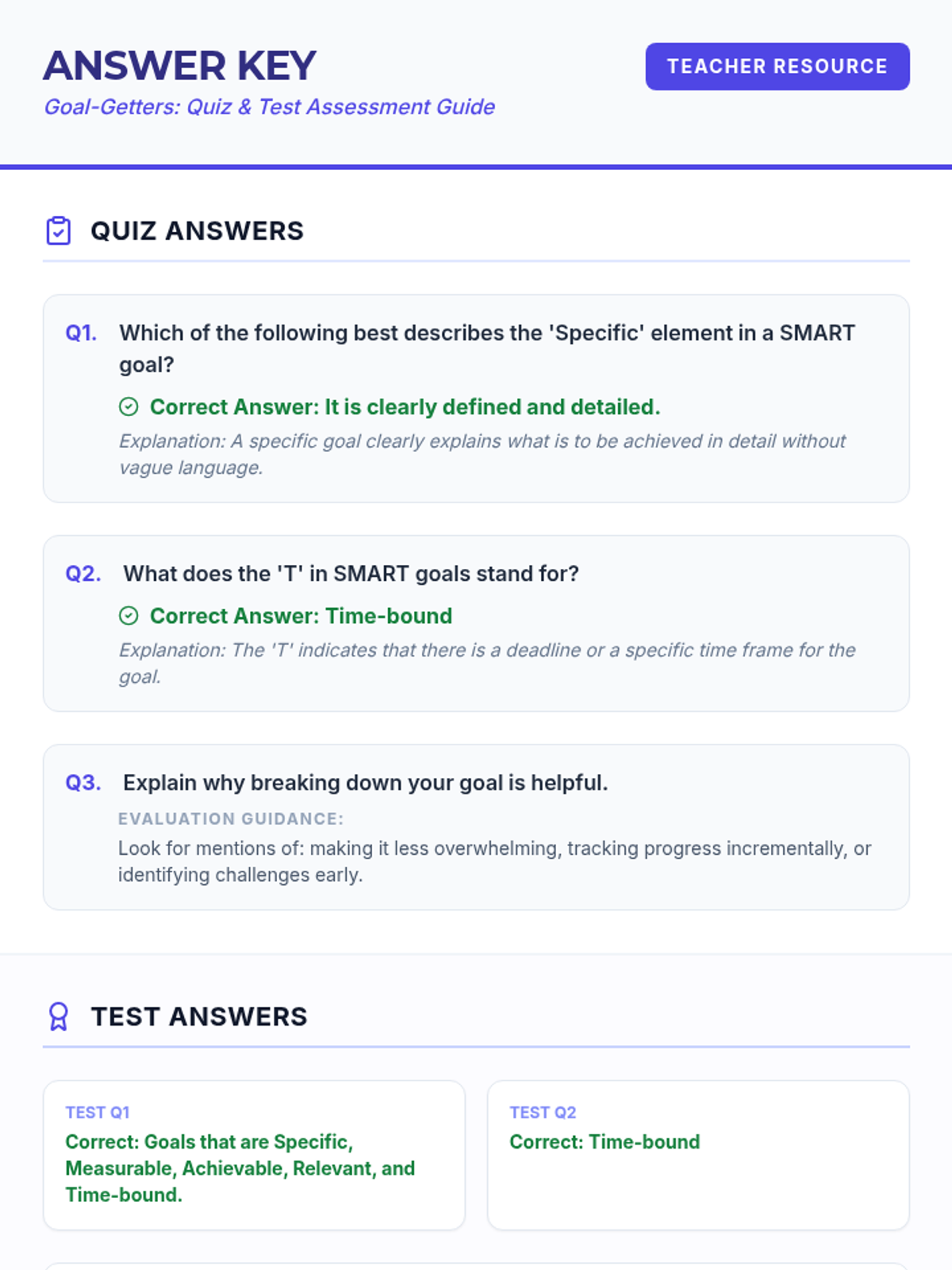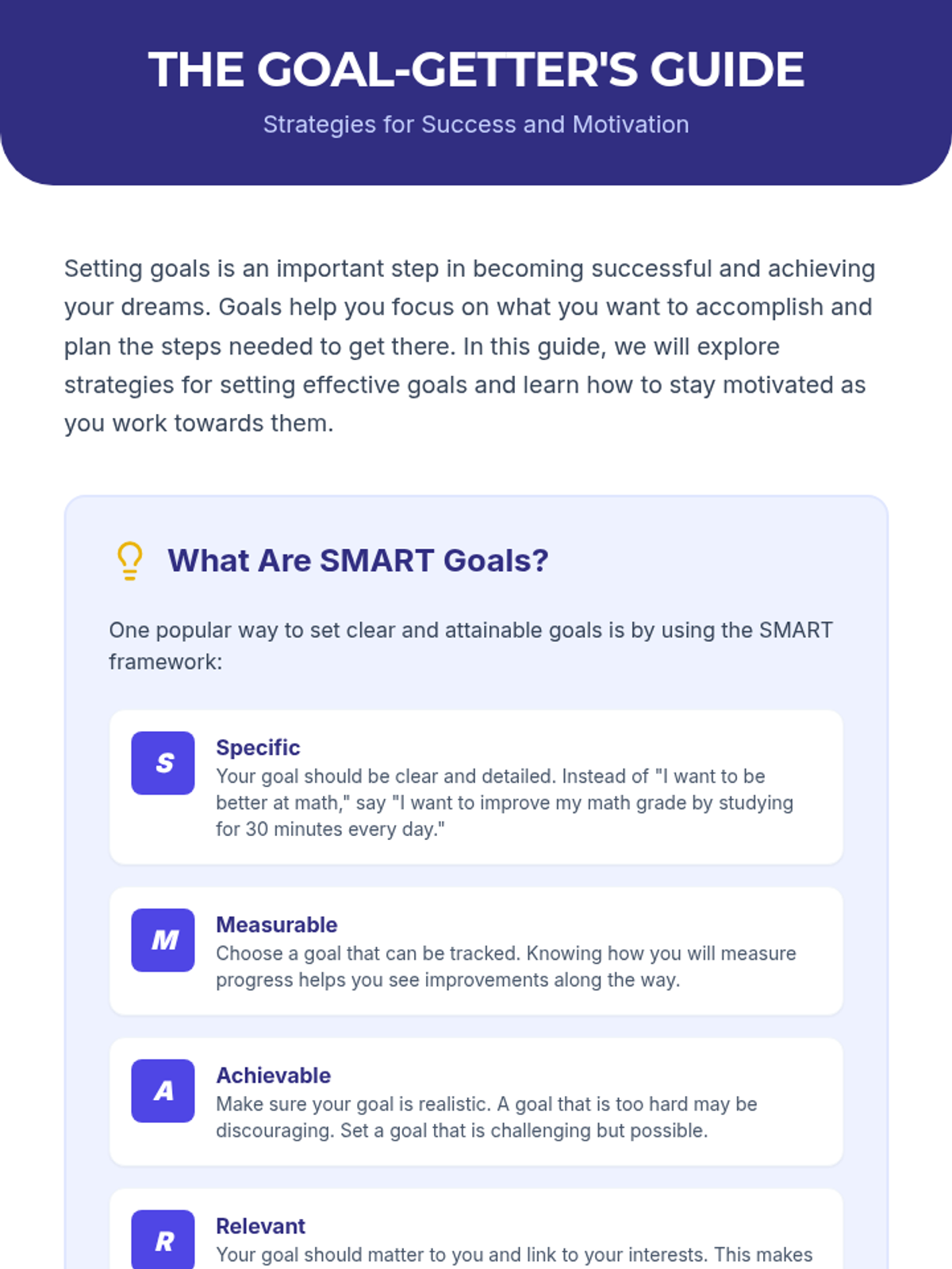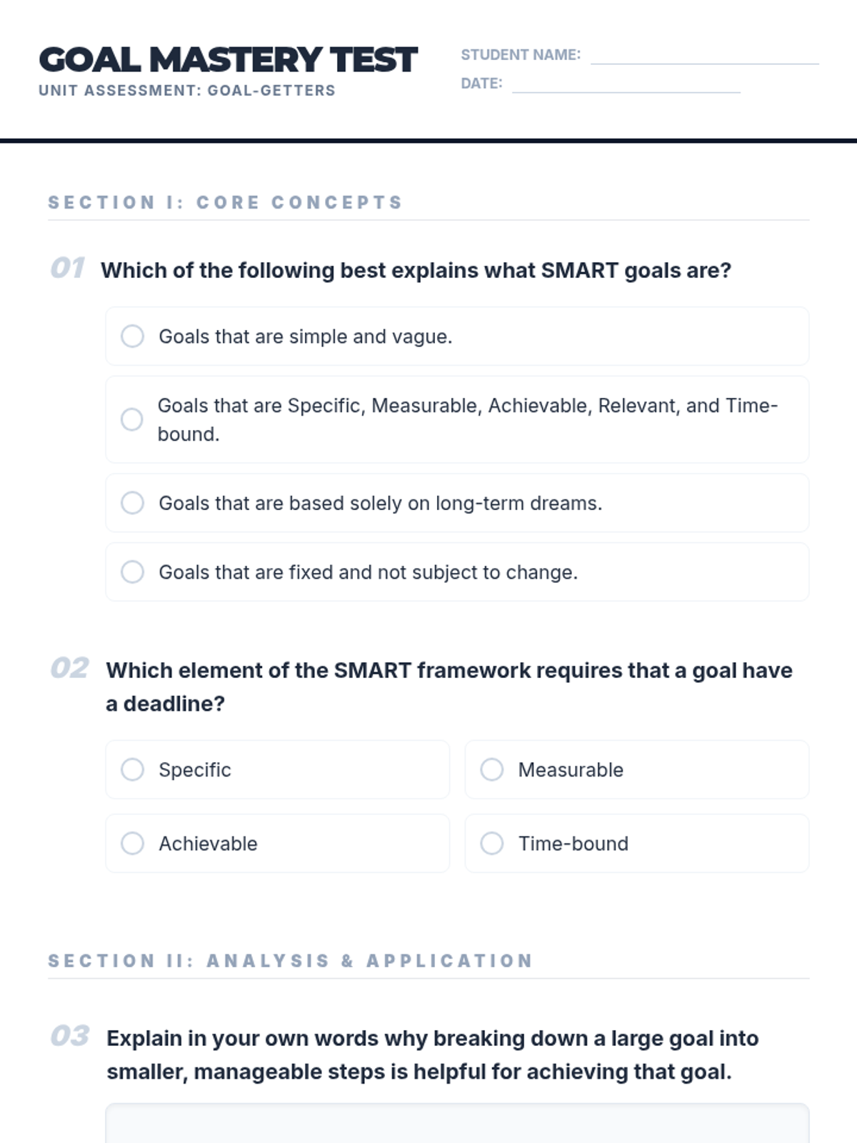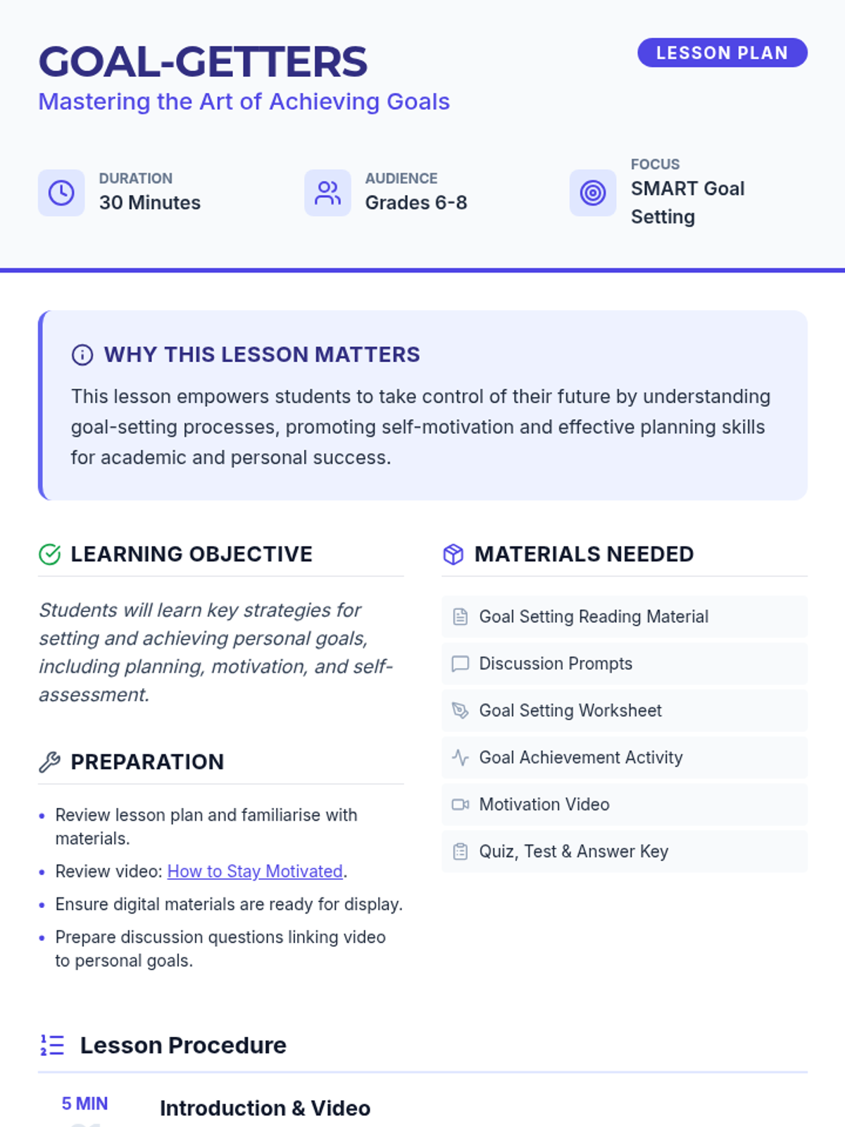 This engaging middle school lesson teaches students how to set and achieve personal and academic goals using the SMART framework and persistence strategies. Students will explore motivation, create actionable plans, and learn to overcome obstacles through interactive discussions and hands-on activities.