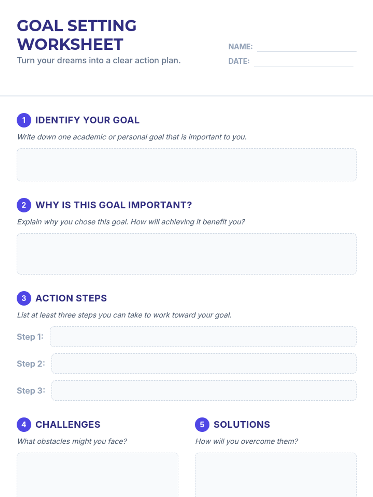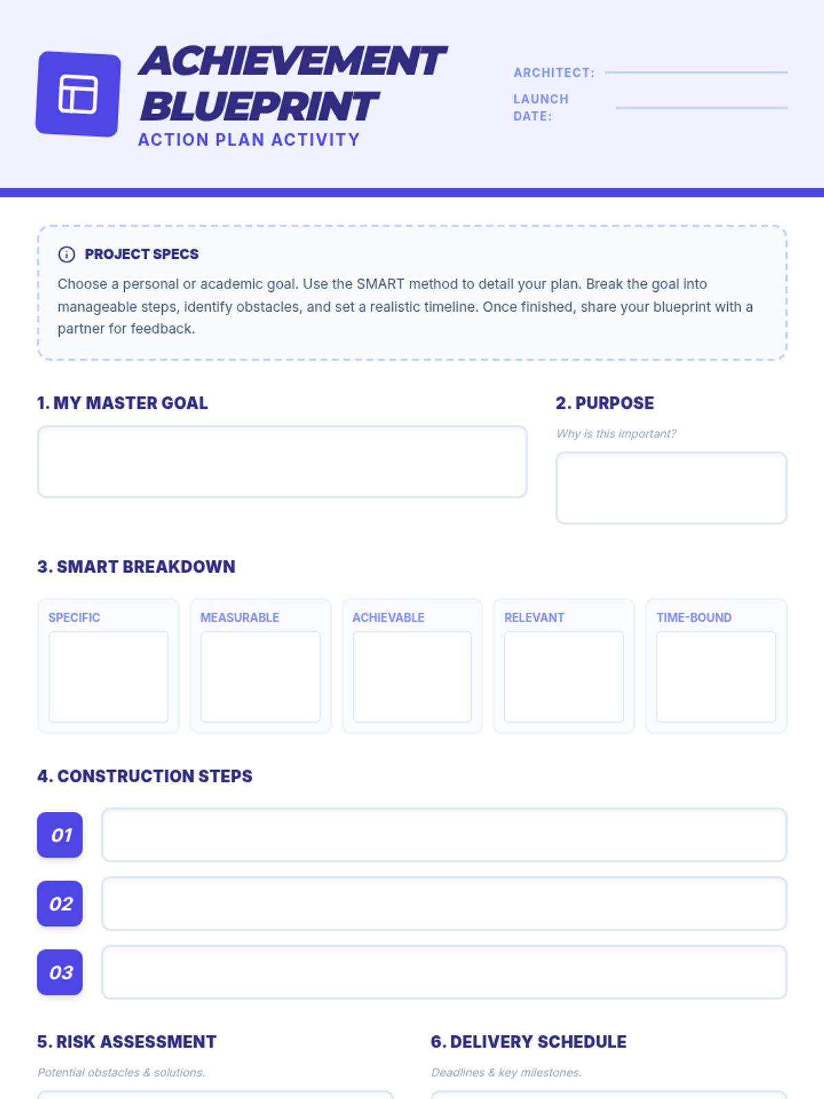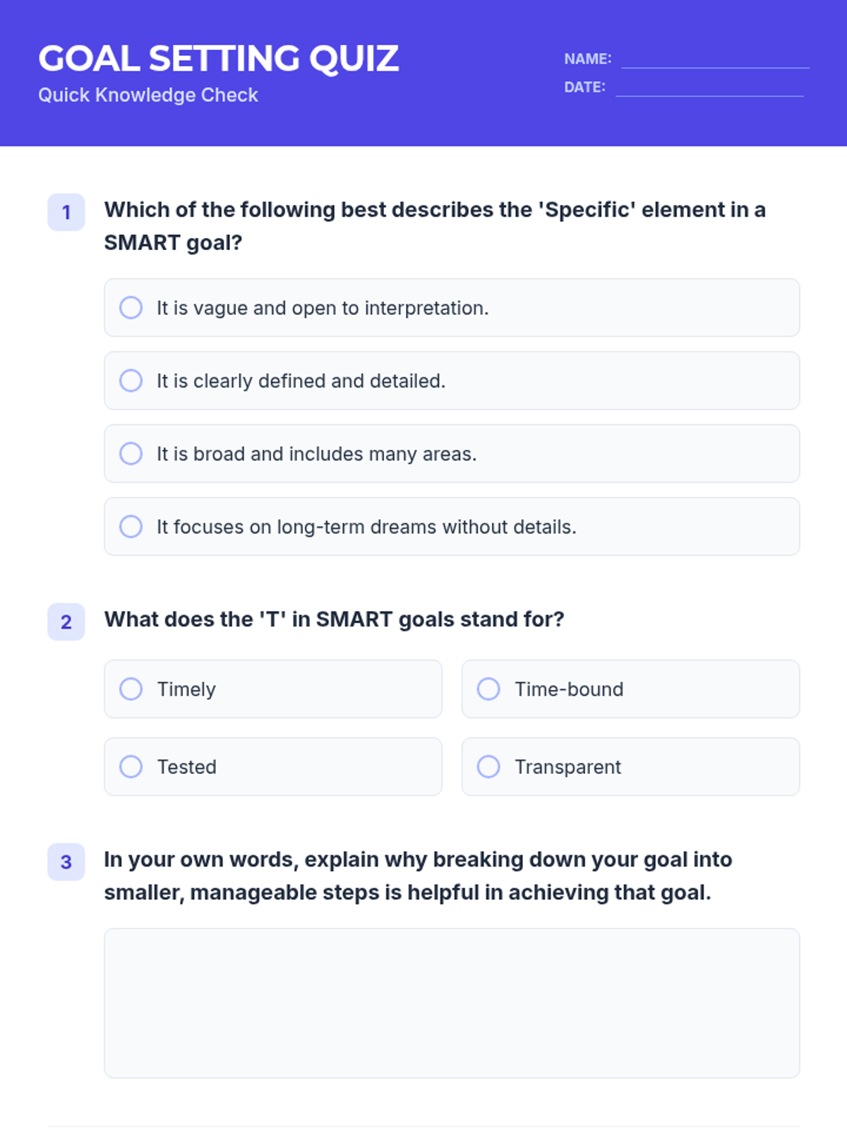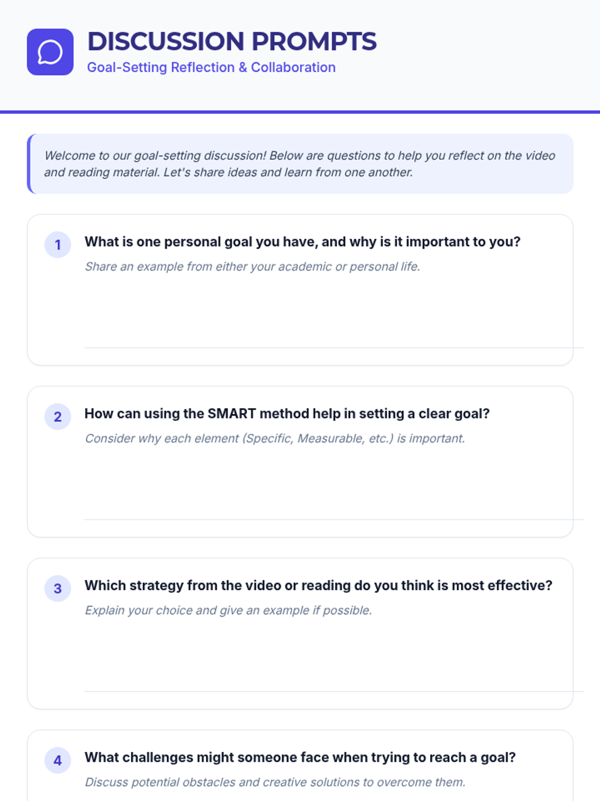 This engaging middle school lesson teaches students how to set and achieve personal and academic goals using the SMART framework and persistence strategies. Students will explore motivation, create actionable plans, and learn to overcome obstacles through interactive discussions and hands-on activities.