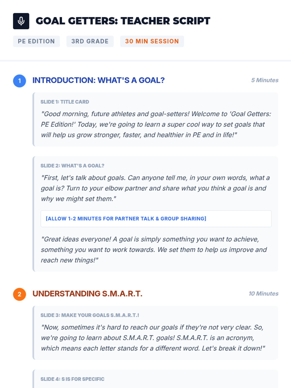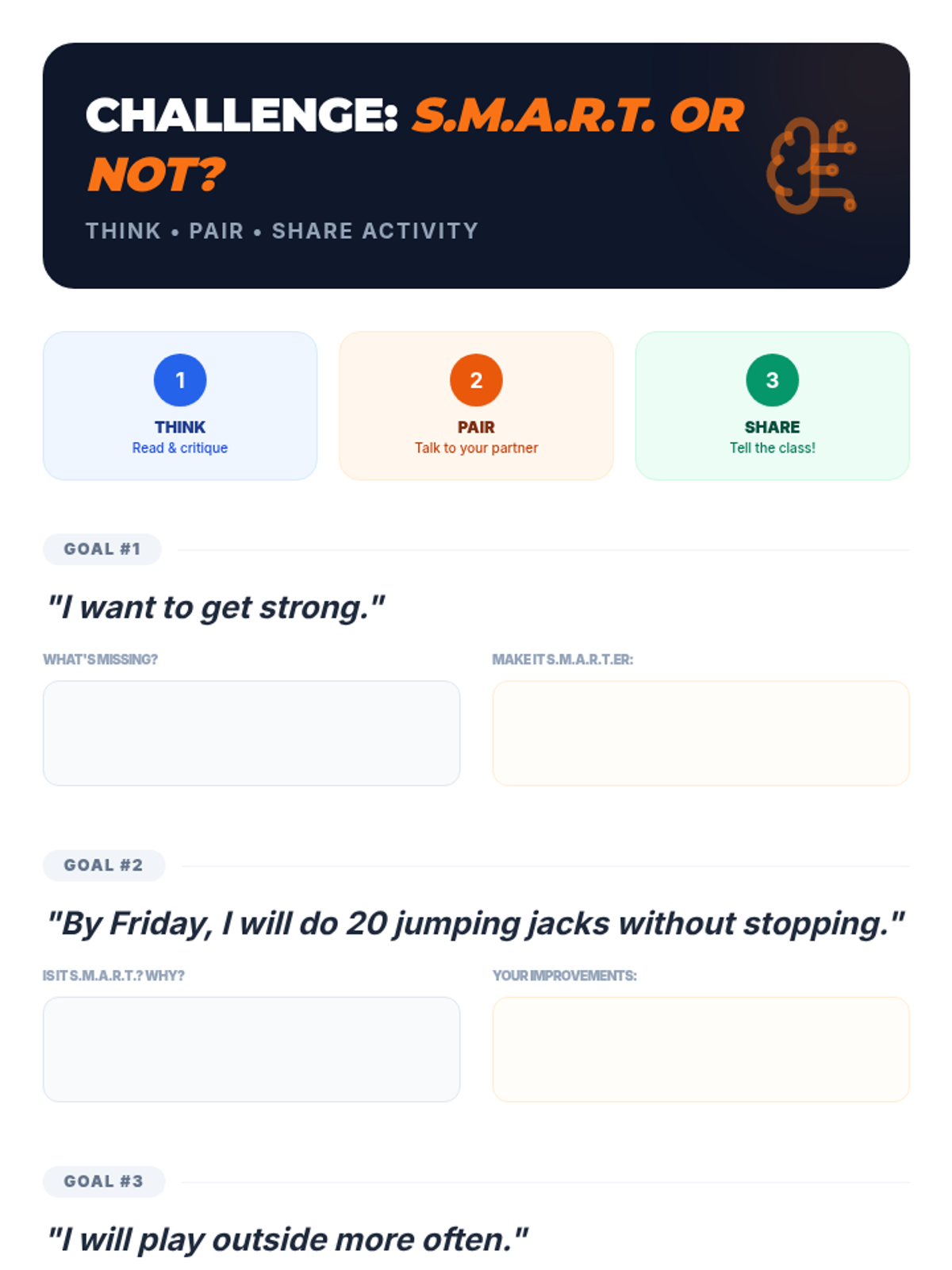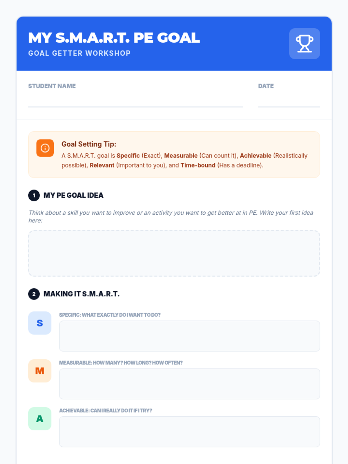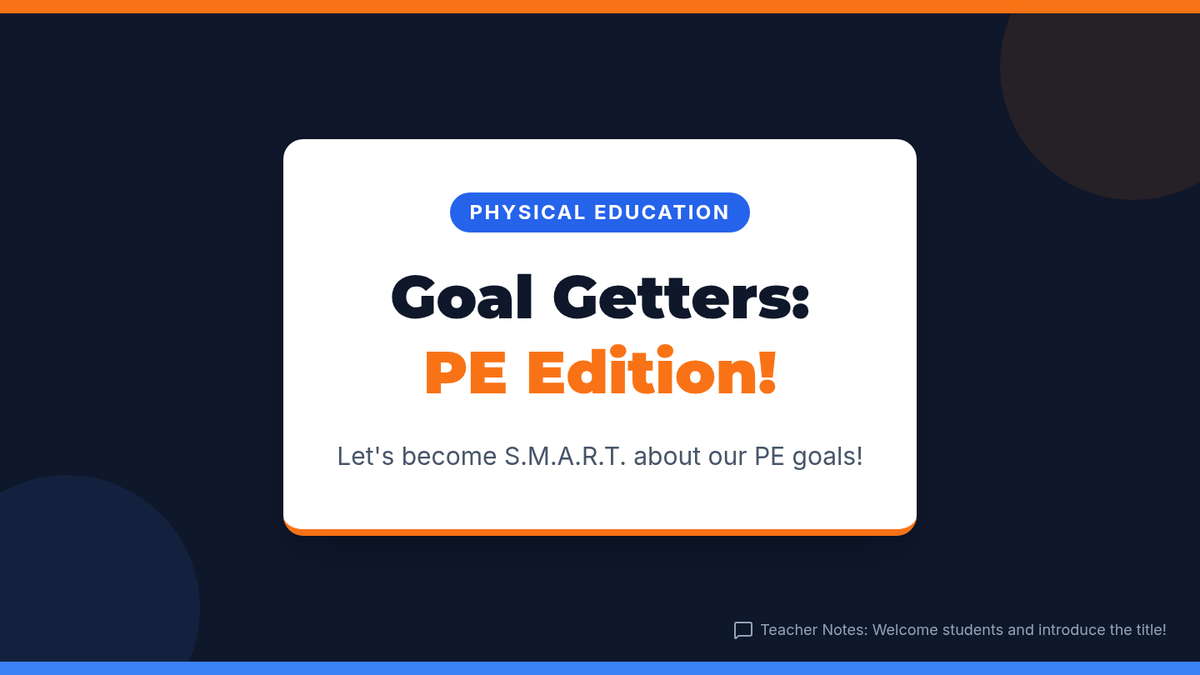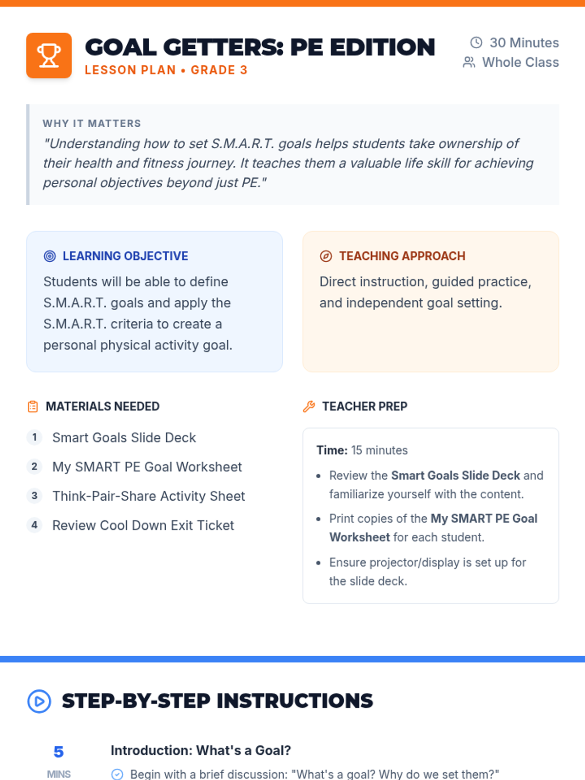 A 30-minute lesson for 3rd graders on setting S.M.A.R.T. goals for Physical Education, helping them build self-awareness and accountability in their fitness journey.