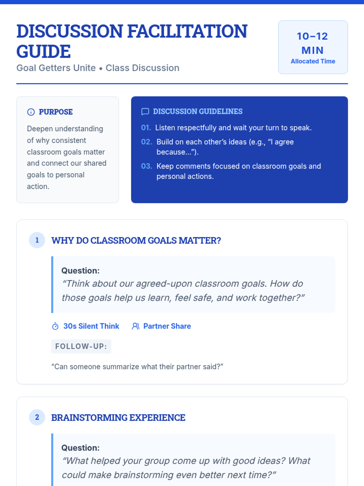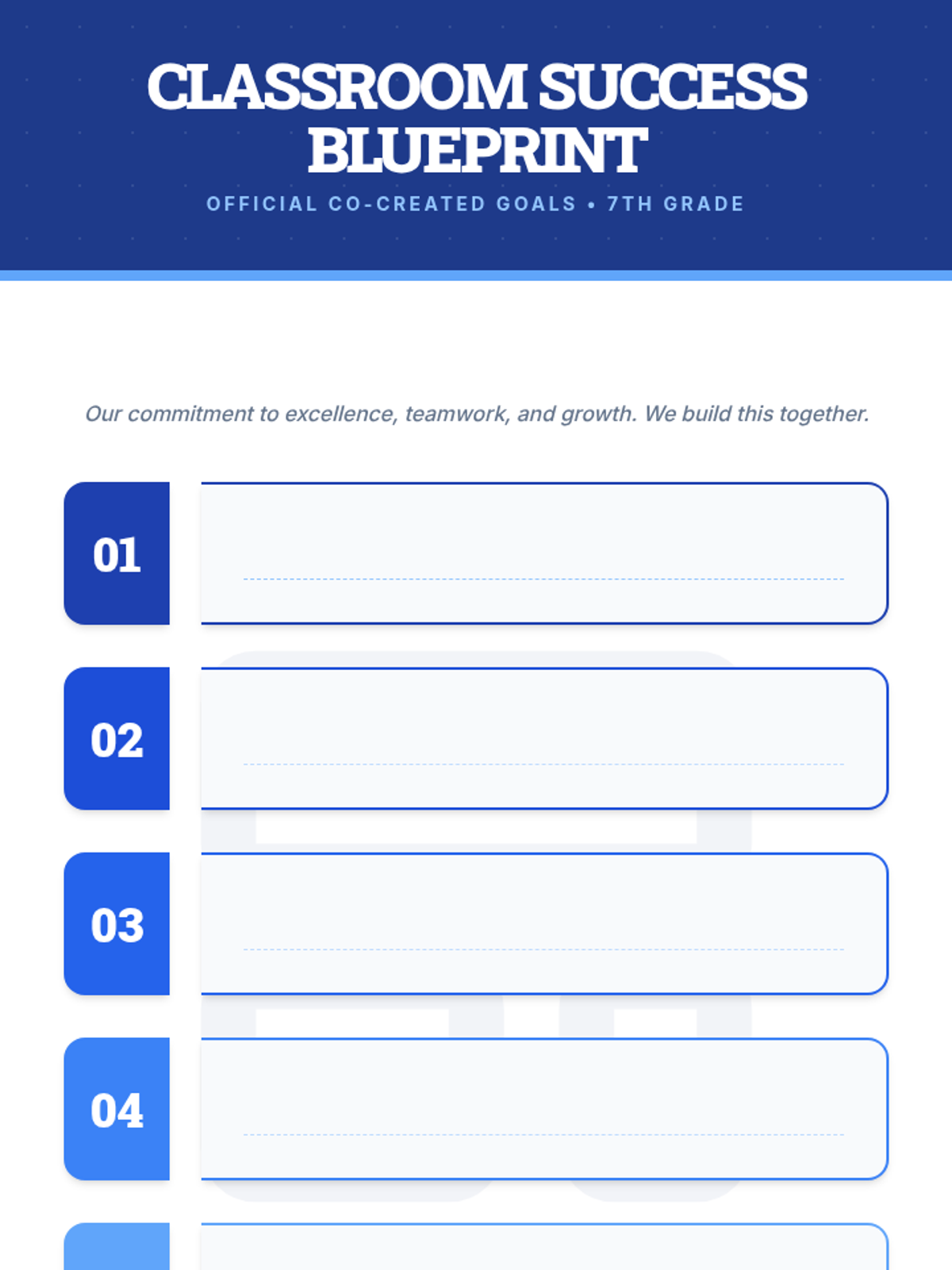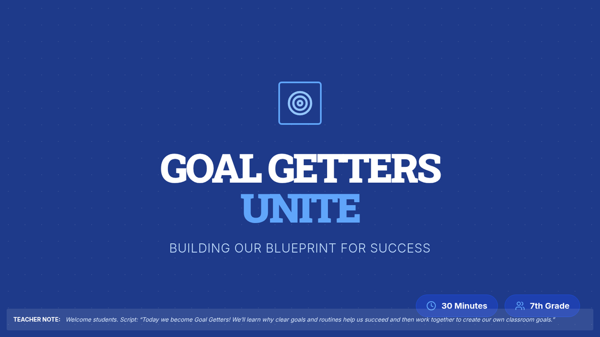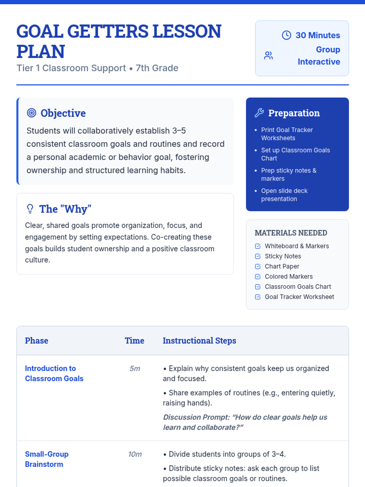 A 30-minute Tier 1 lesson for 7th graders focused on establishing classroom-wide routines and co-creating shared goals to build ownership and focus.