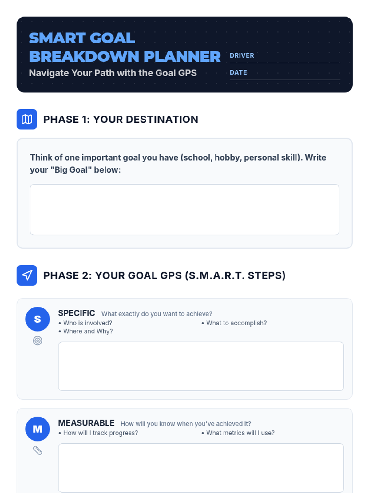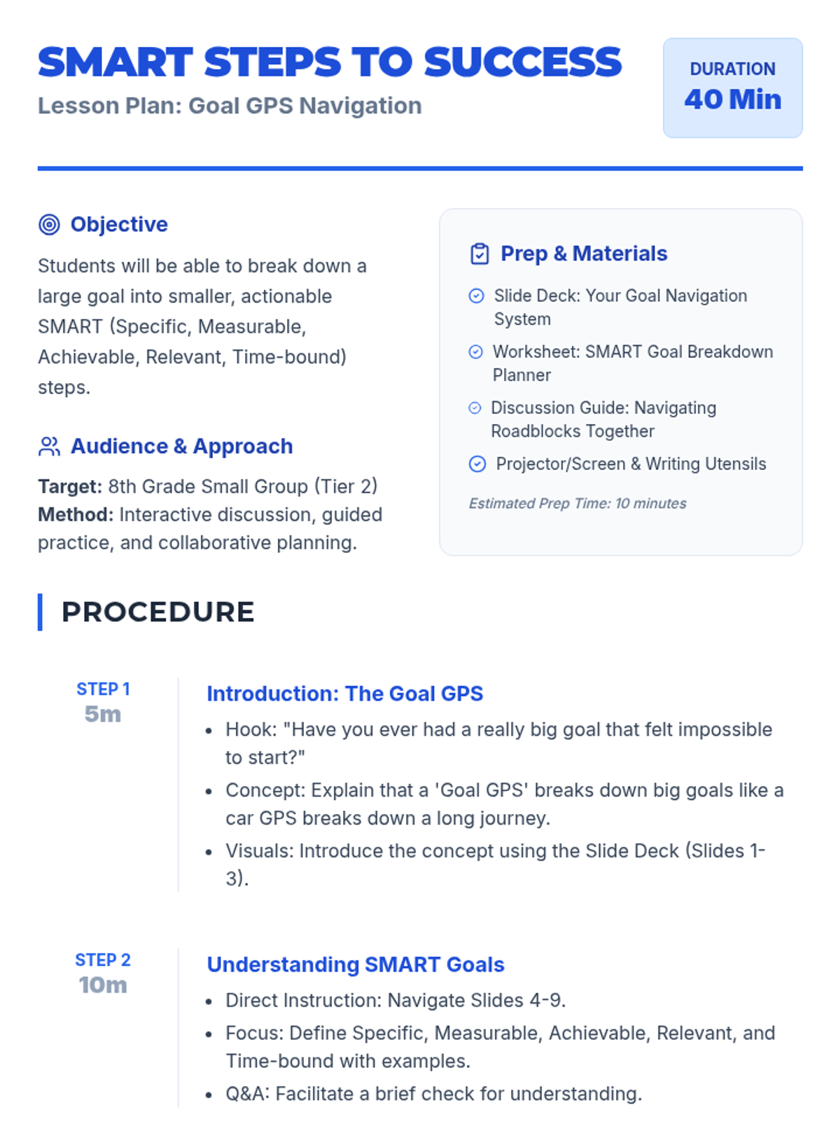 A 40-minute Tier 2 small group lesson for 8th graders focused on breaking down large goals into manageable SMART steps using a GPS metaphor.