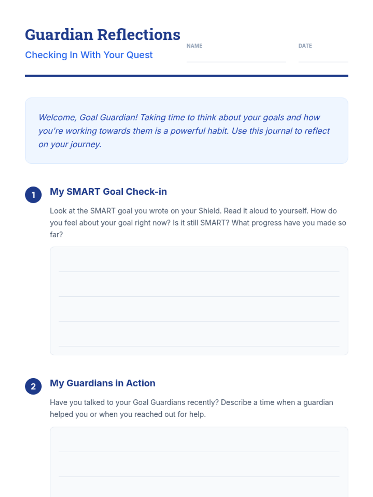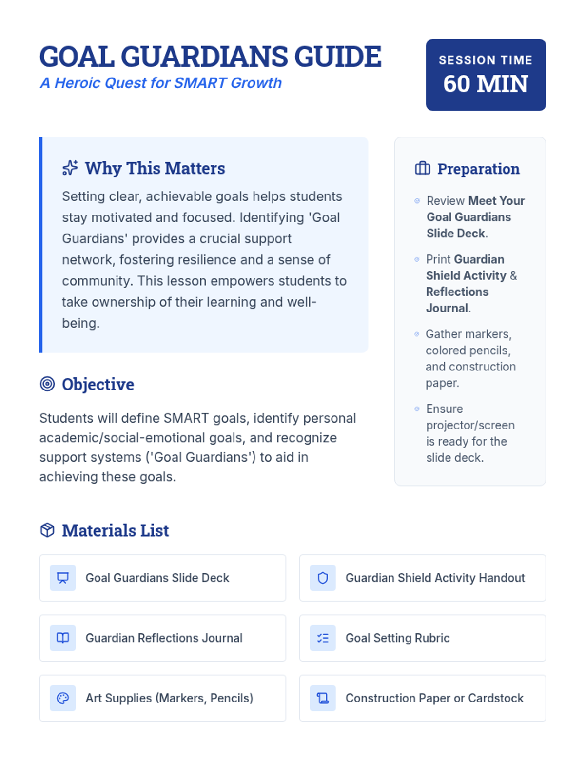 A 60-minute session for 6th graders to master SMART goal setting and identify their support network of 'Goal Guardians'. Through creative shield-making and reflection, students build accountability and community support.