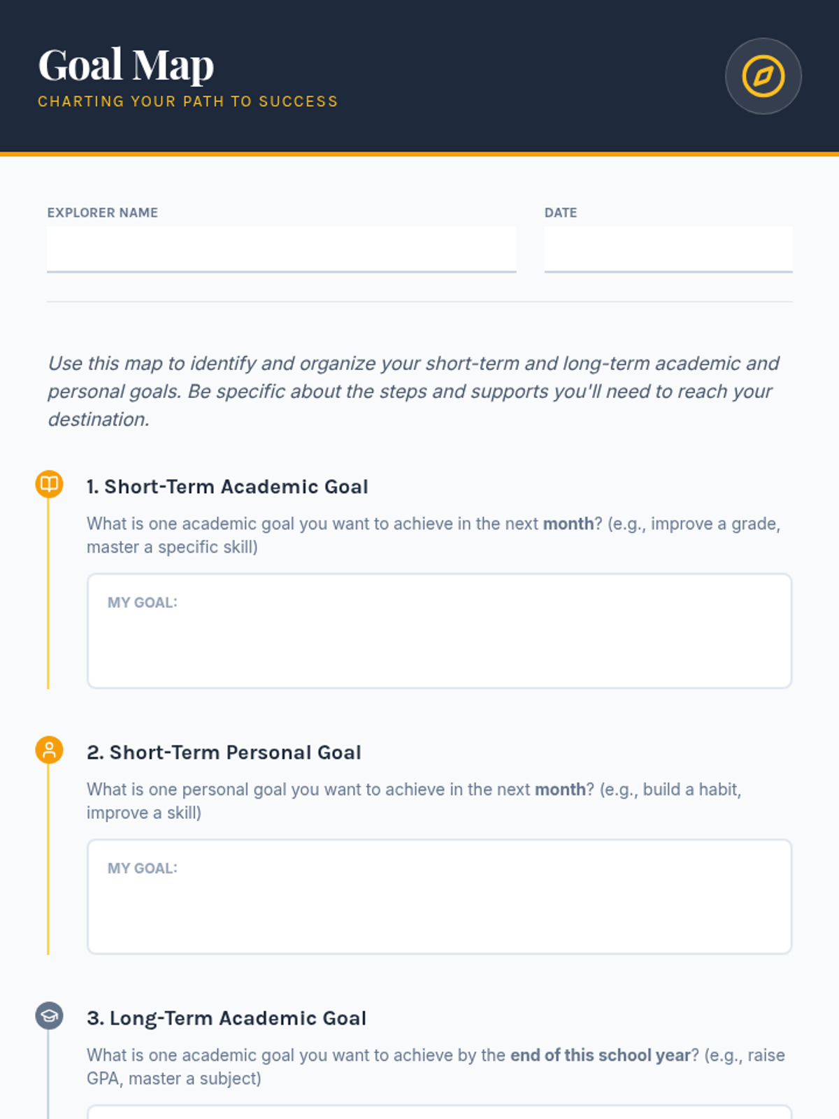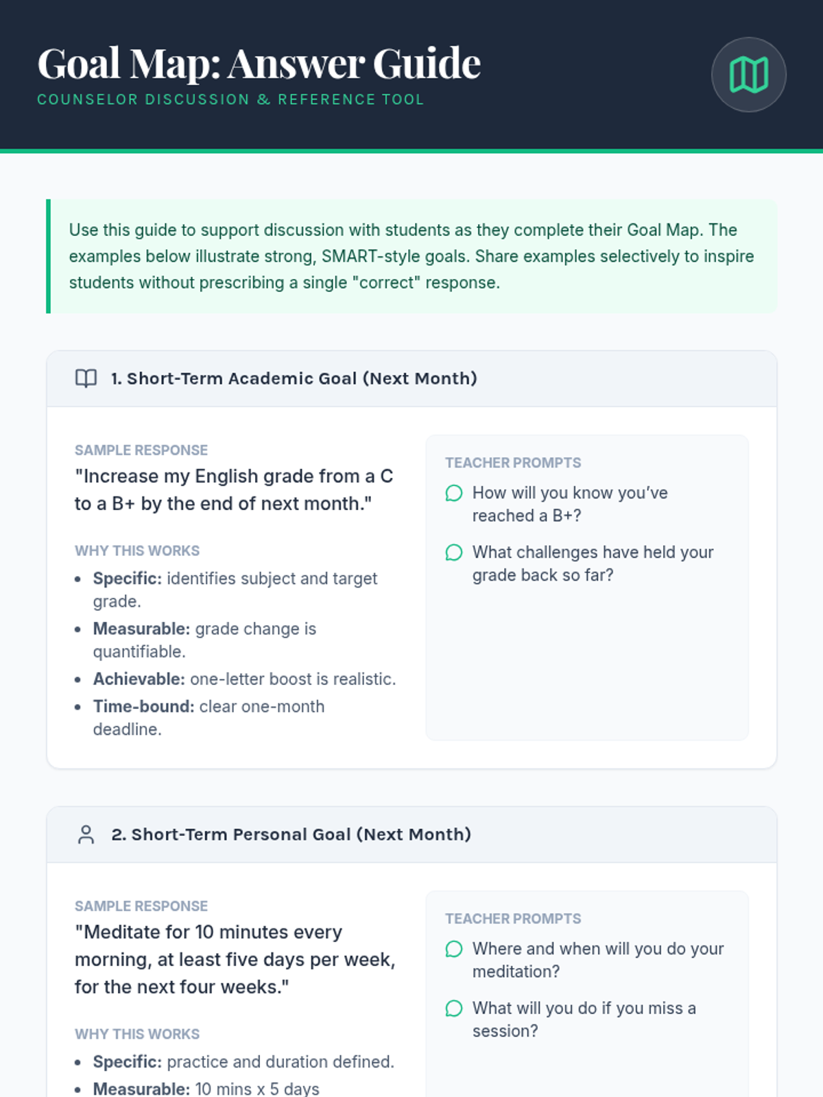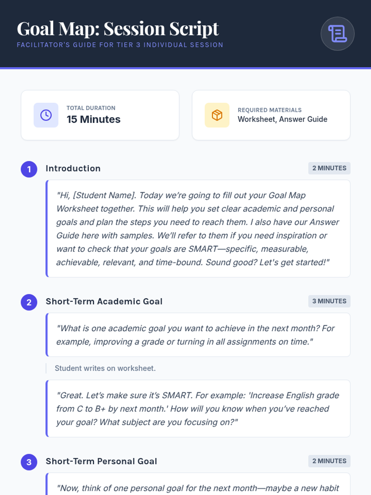 A 15-minute Tier 3 individual counseling session for 9th-grade students to identify and organize short-term and long-term academic and personal goals using a map-themed framework.