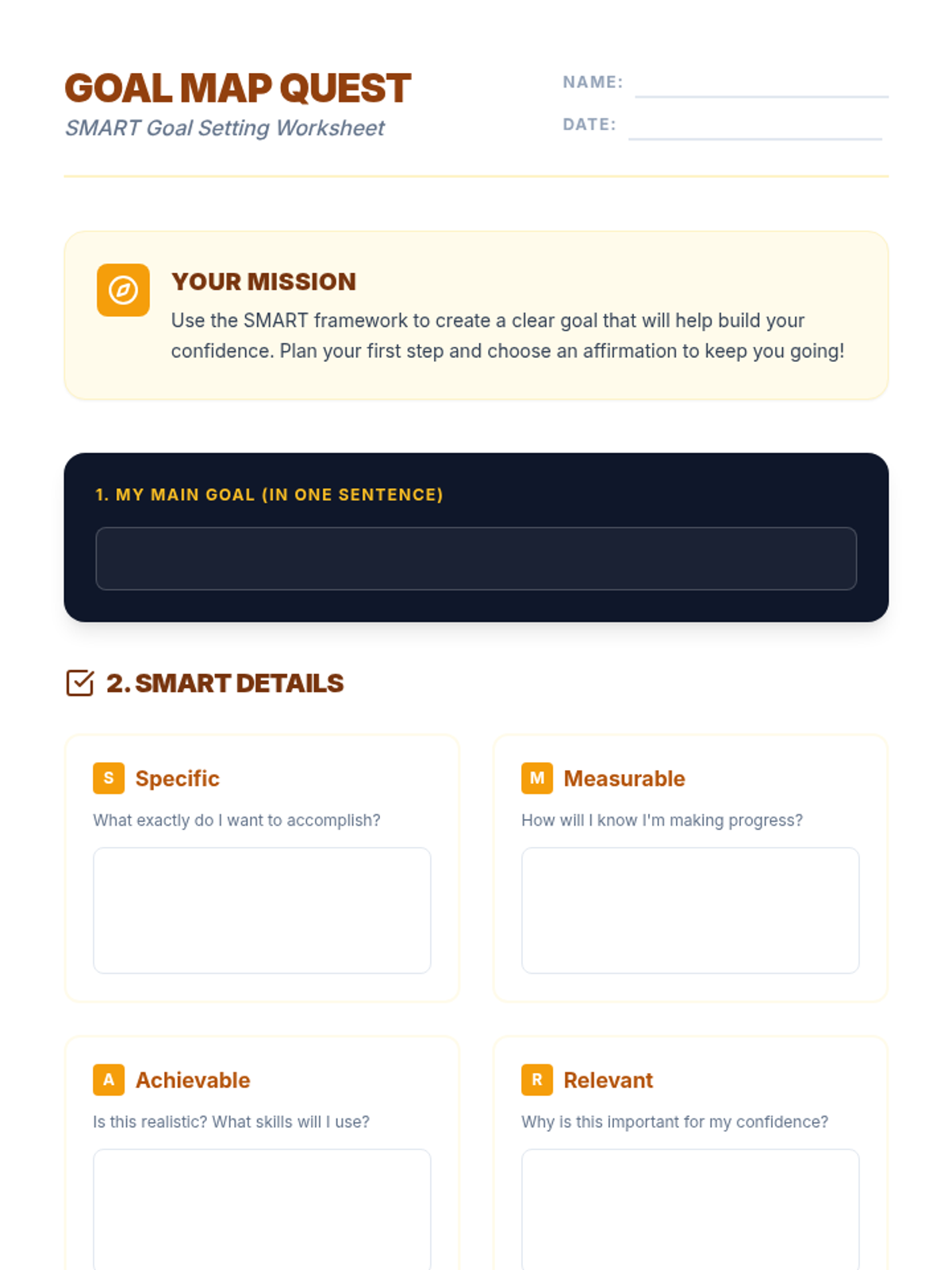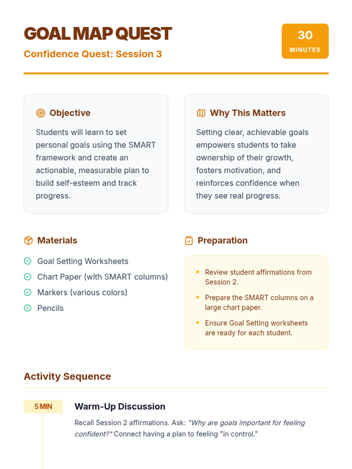 Students learn to set personal goals using the SMART framework and create an actionable, measurable plan to build self-esteem.