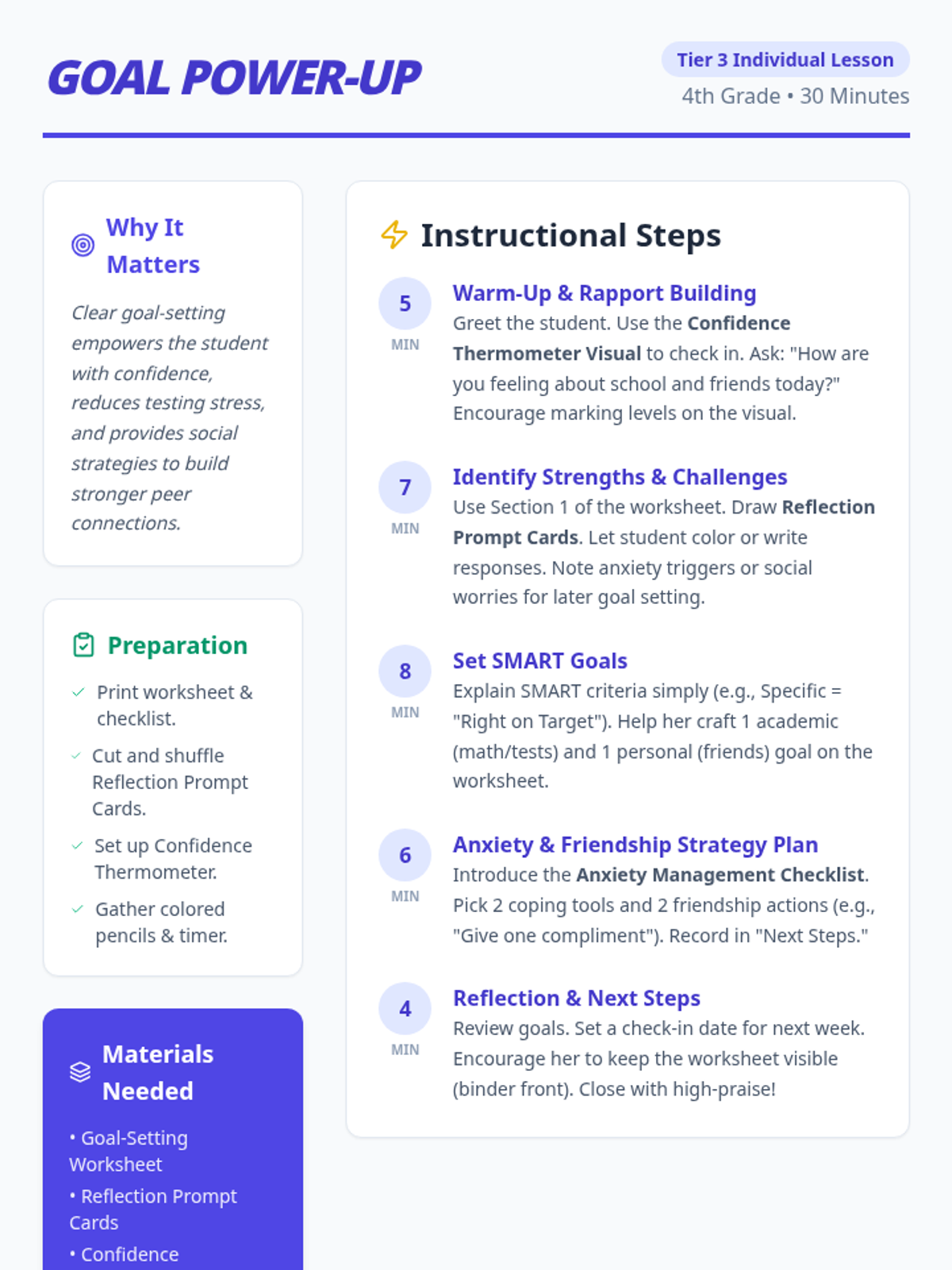 A 30-minute individual Tier 3 counseling session for 4th graders to set academic and personal goals, manage test anxiety, and improve social skills through a 'Power-Up' theme.