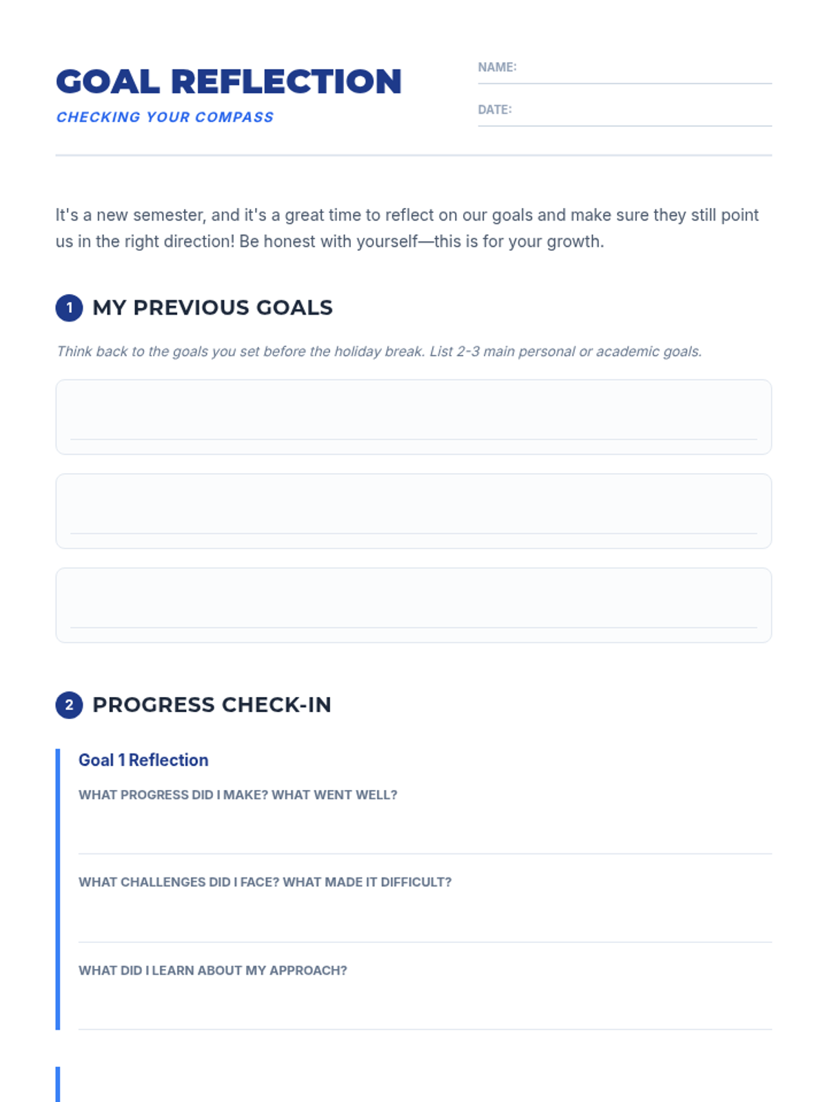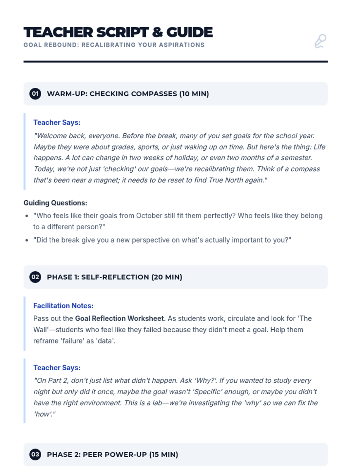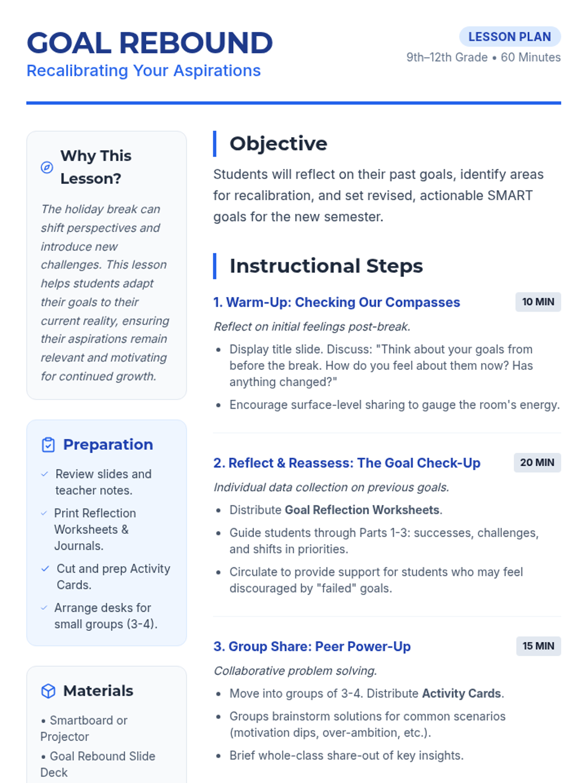 A comprehensive 60-minute lesson for high school students to revisit, reflect upon, and recalibrate their personal and academic goals following a break. Students will use structured reflection and peer discussion to transform outdated goals into actionable SMART plans for the new semester.