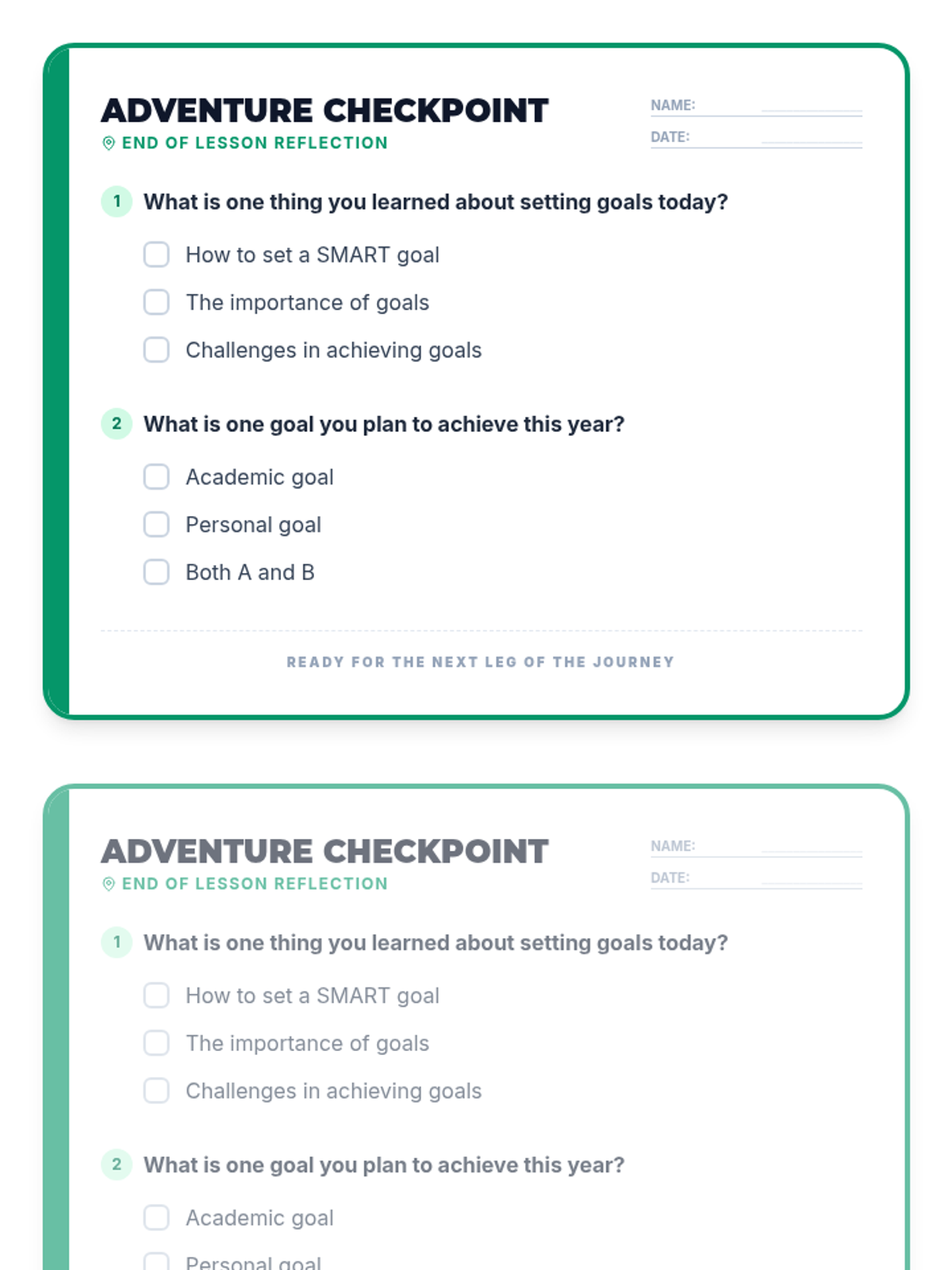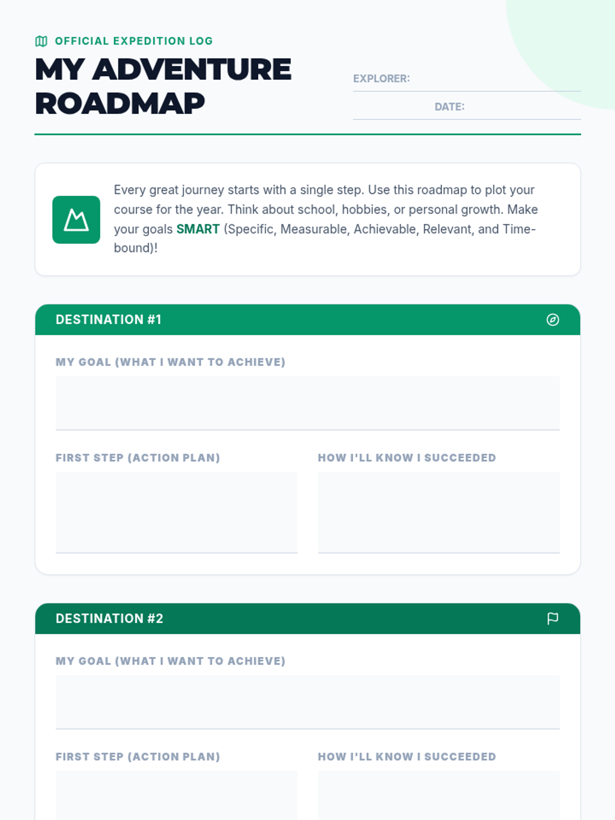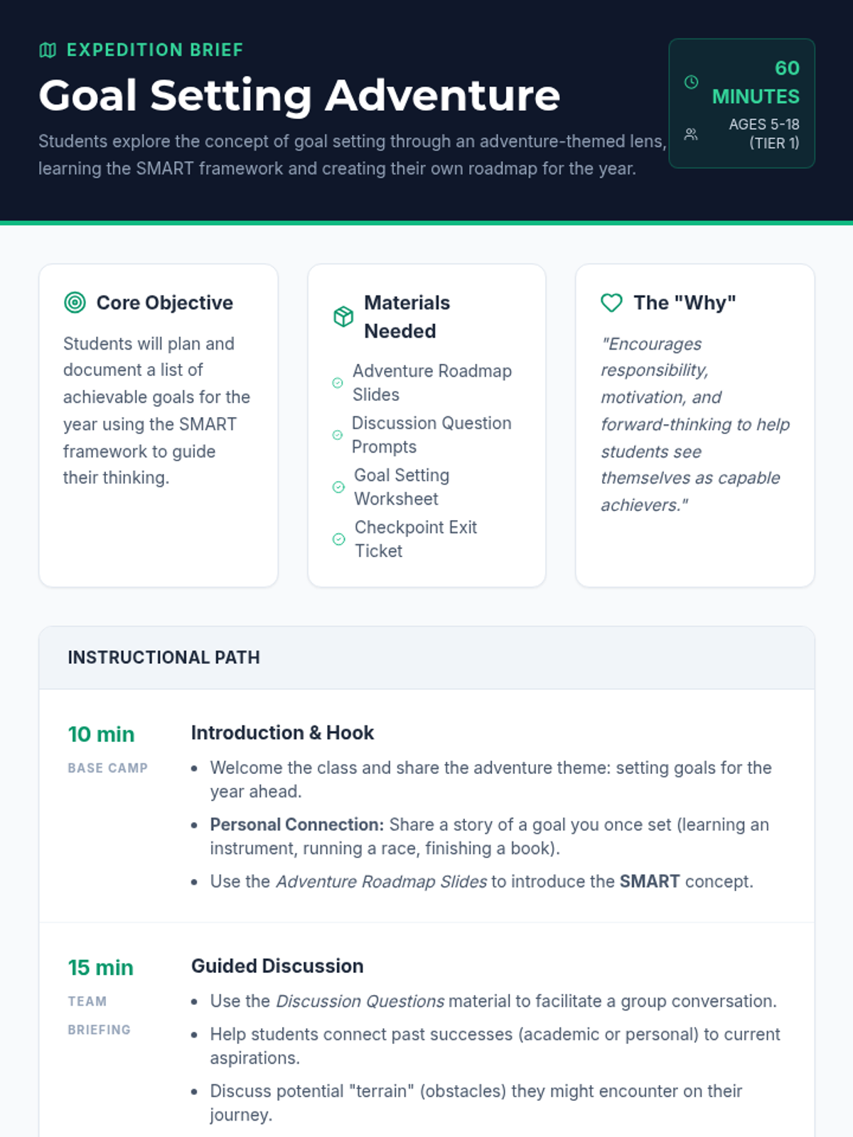 Students explore goal setting through an adventure-themed lesson, learning the SMART framework and creating their own roadmap for the year.
