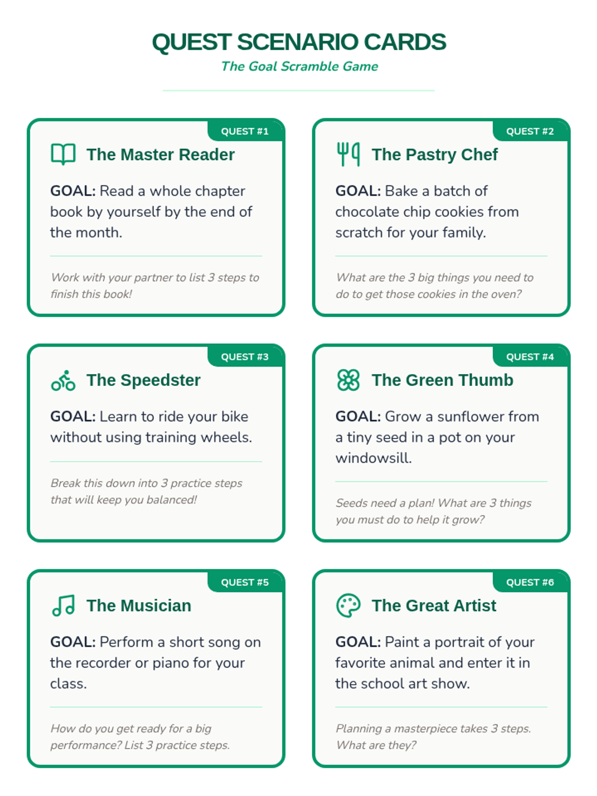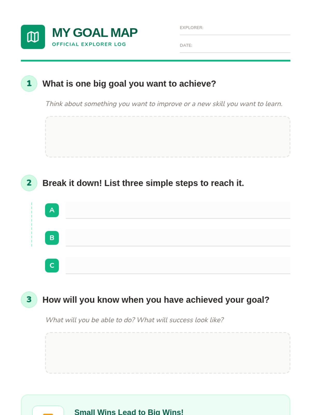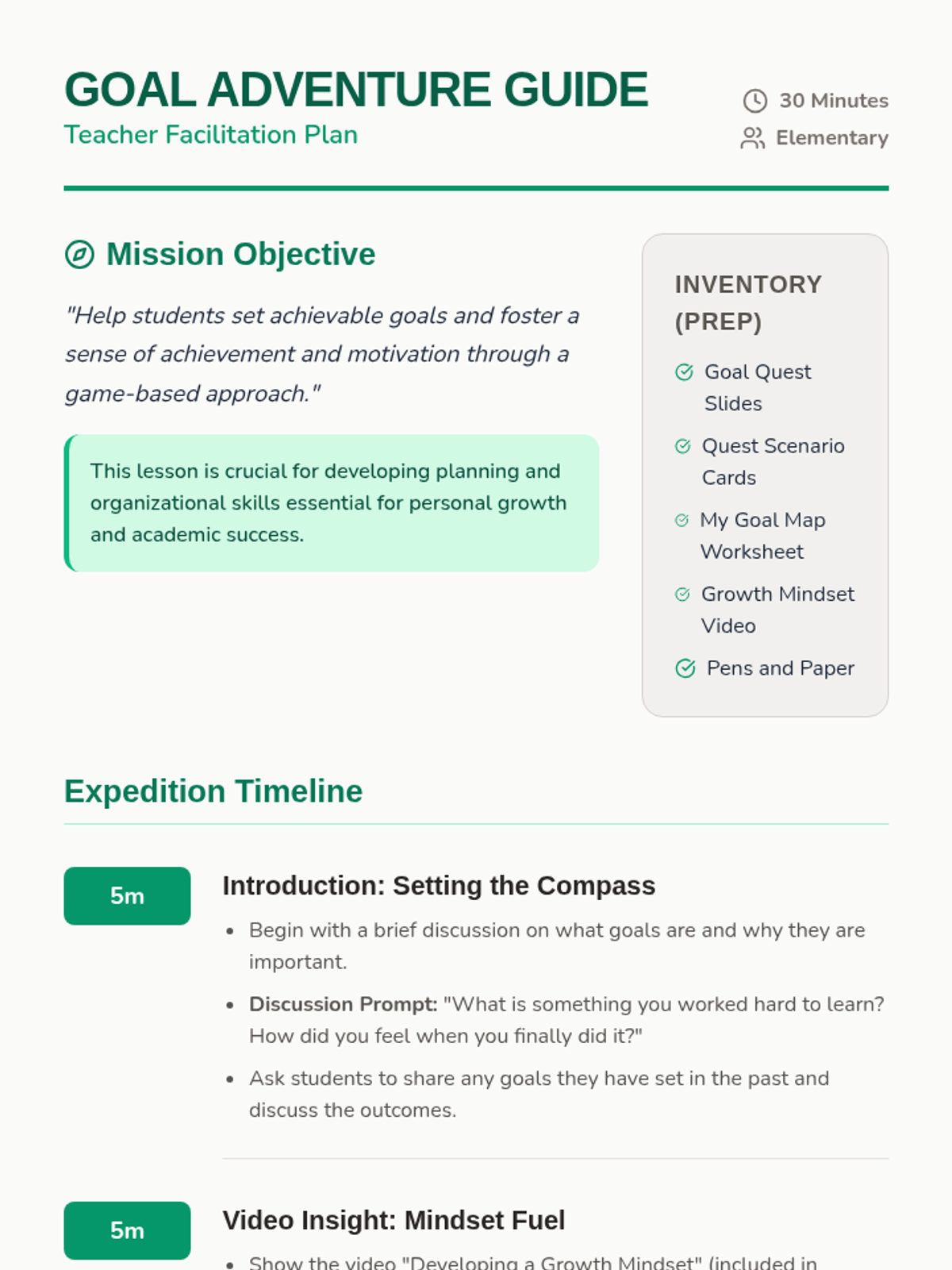 This lesson introduces students to the concept of setting attainable goals through an explorer-themed adventure. Students will learn to break down large ambitions into manageable steps and develop a growth mindset through interactive games and personal reflection.