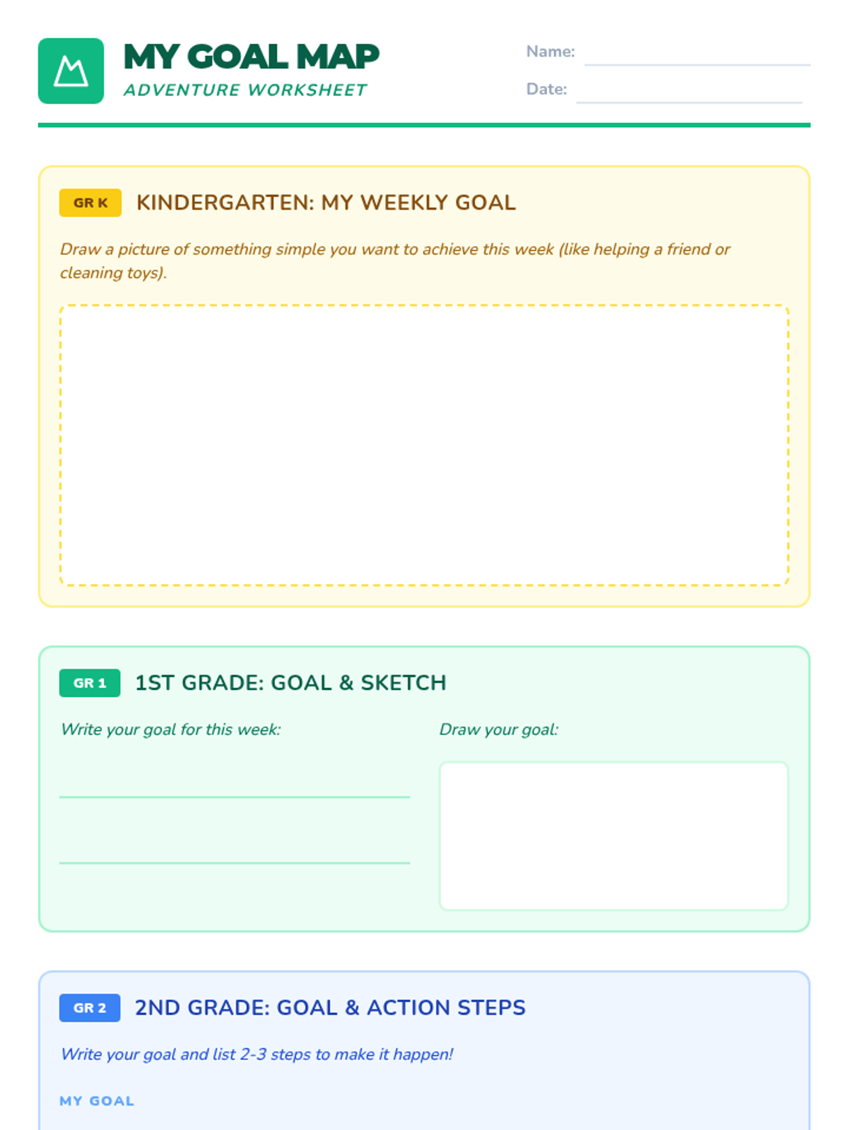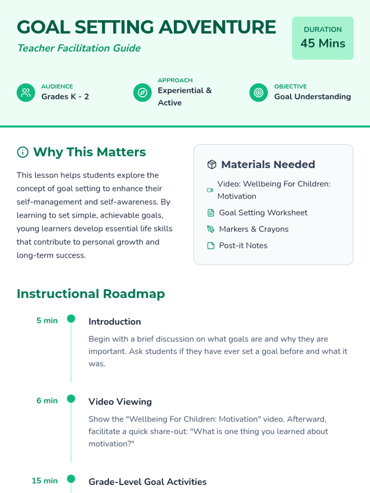 Students explore goal setting, self-management, and self-awareness through an adventure-themed lesson featuring videos, interactive drawing, and writing activities designed for K-2 learners.