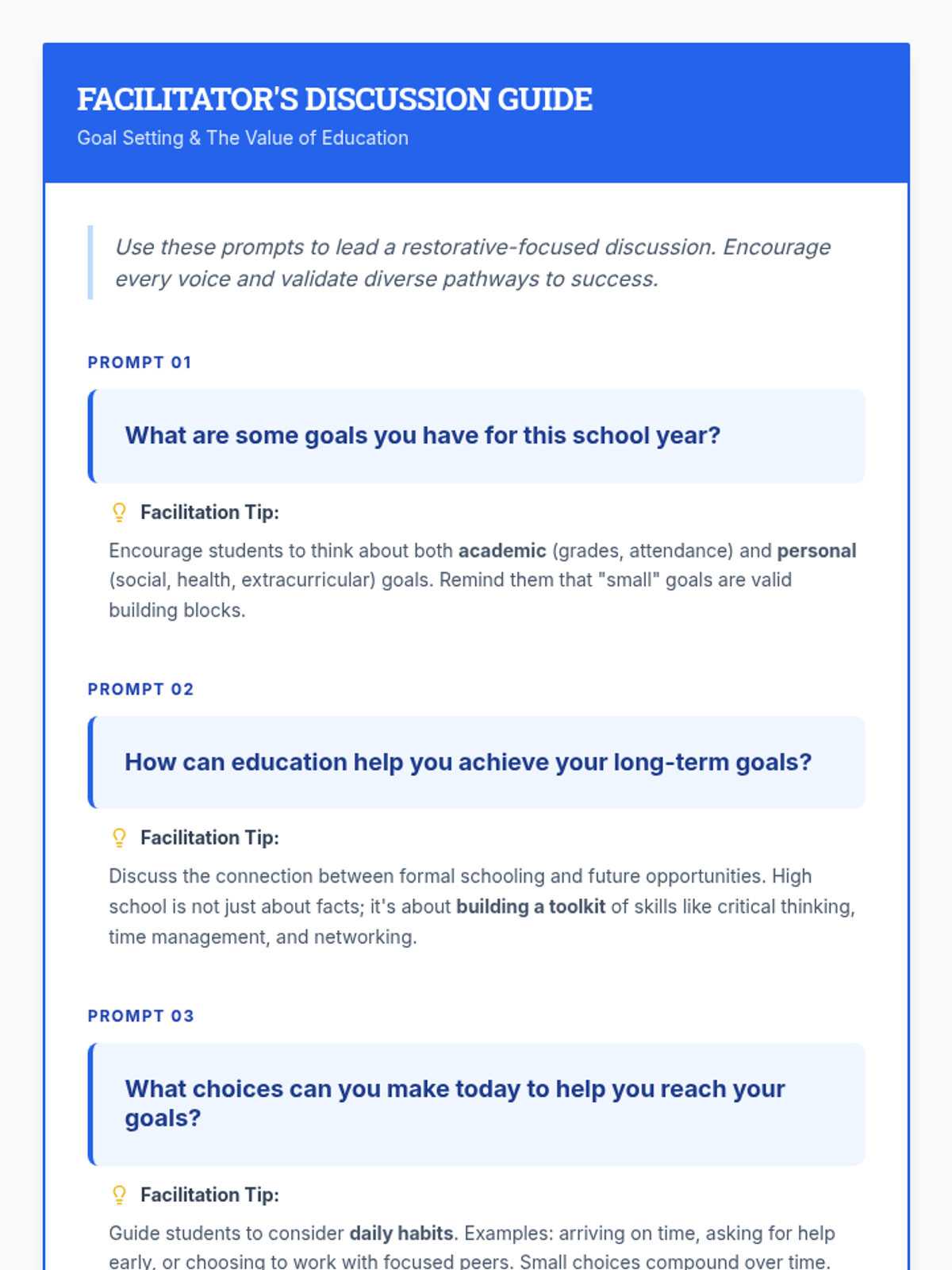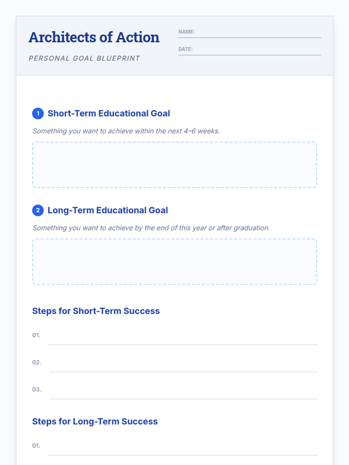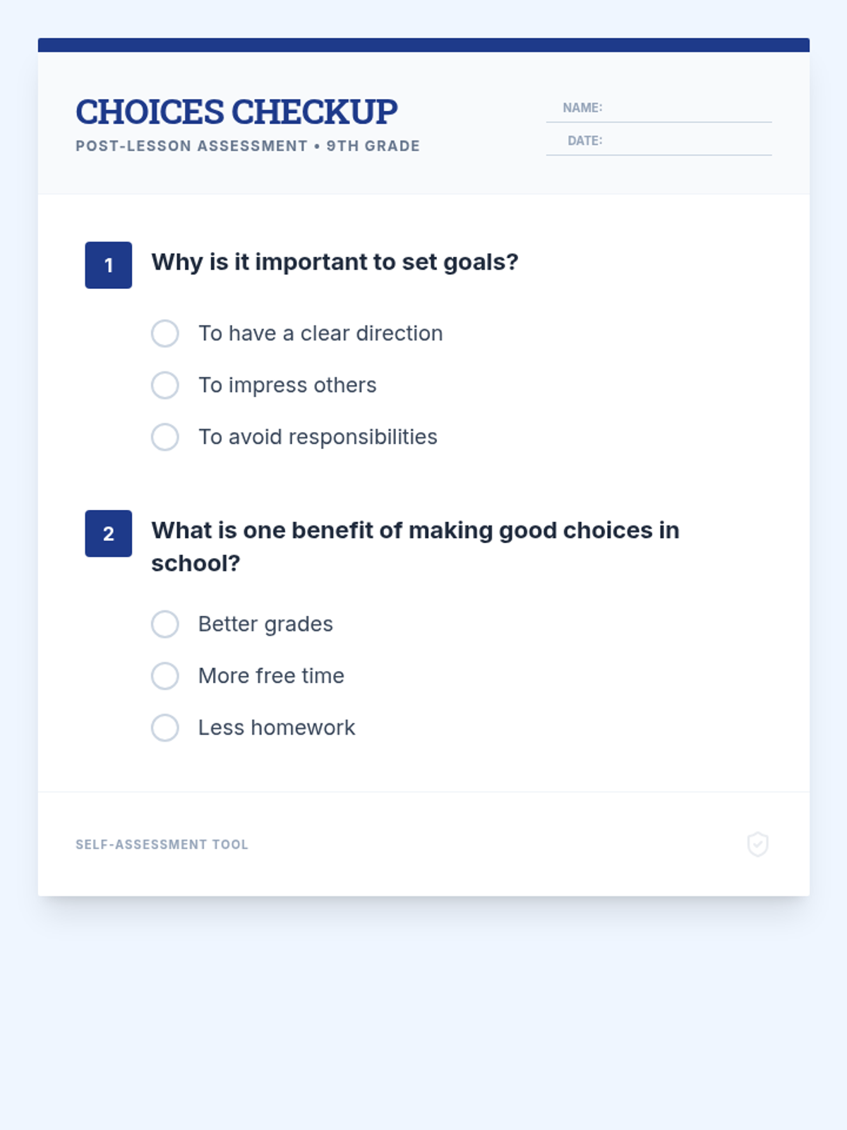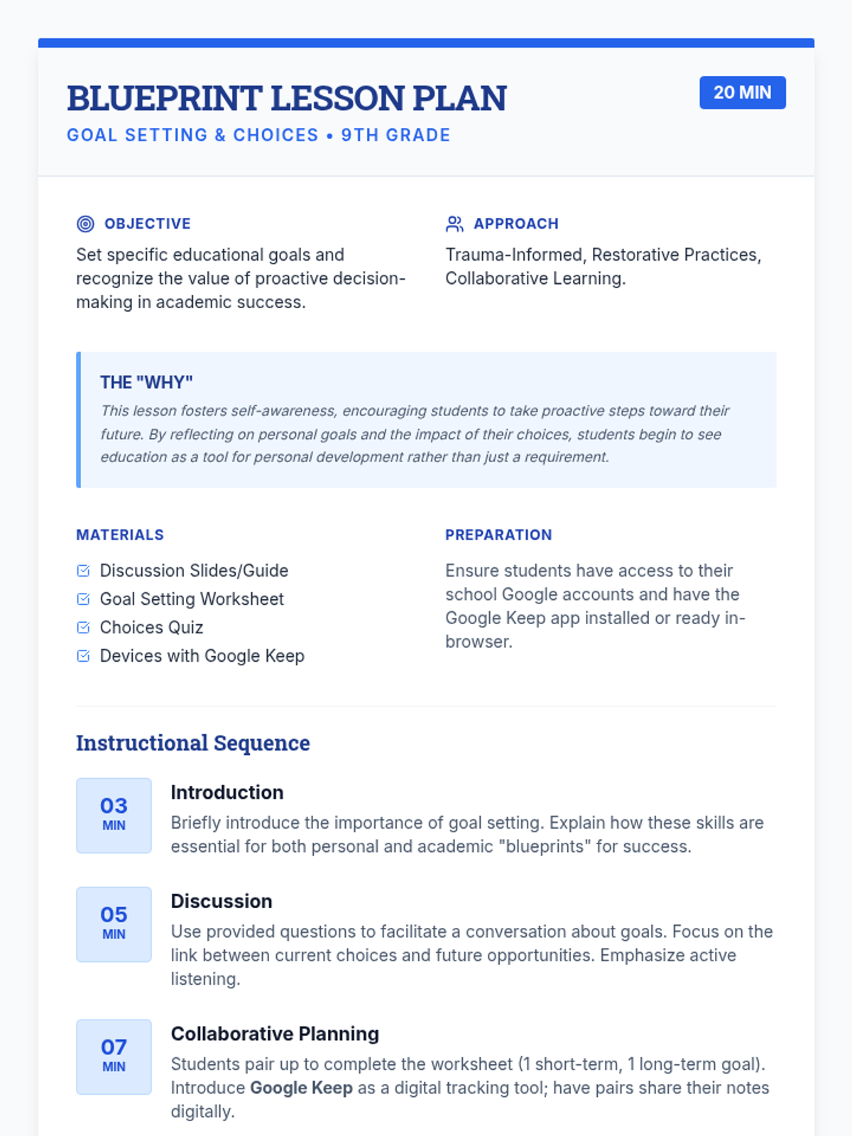 A 20-minute Tier 1 lesson for 9th graders focused on self-awareness, goal setting, and the impact of educational choices. Students will engage in collaborative planning and digital goal tracking.