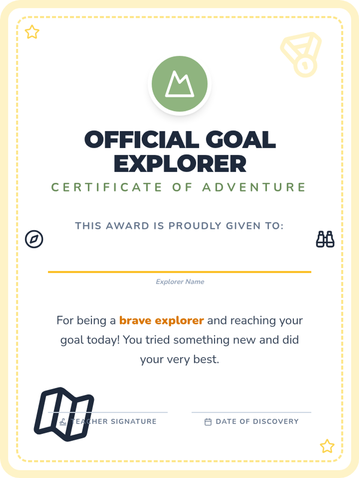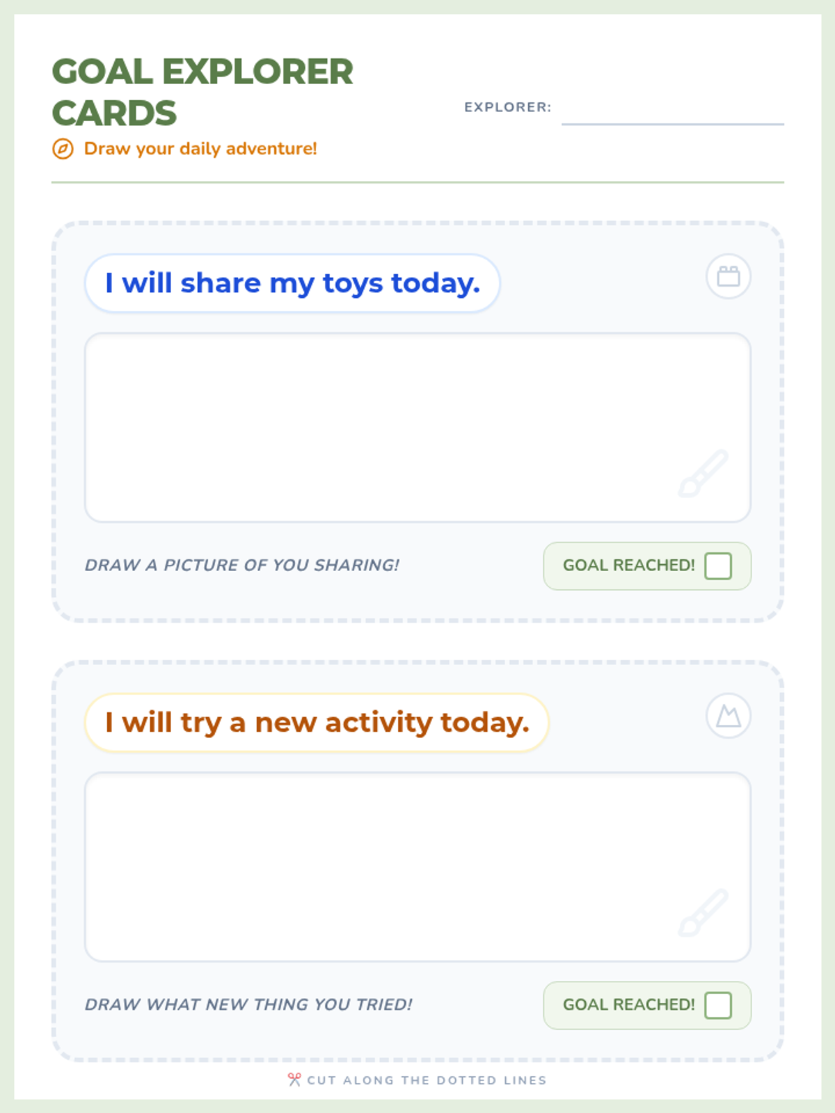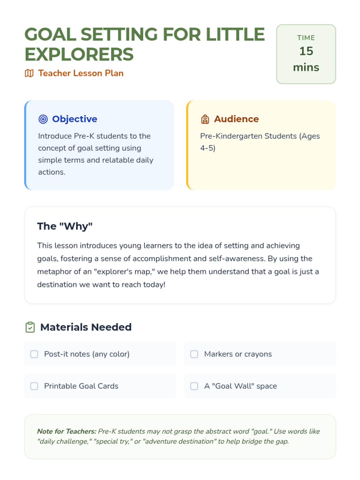 A gentle introduction to goal setting for Pre-K students, using the metaphor of an adventure to help them understand and set simple daily goals.