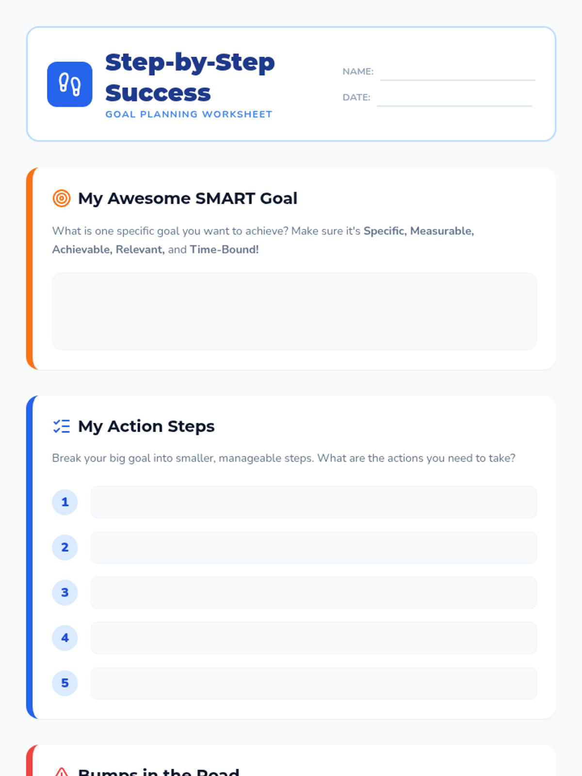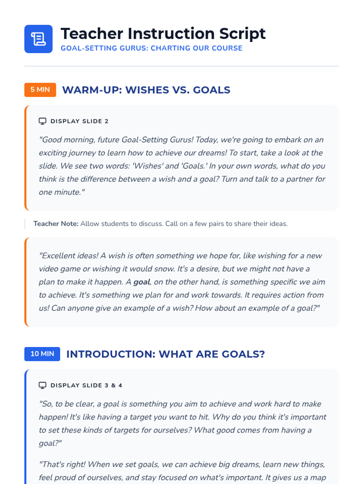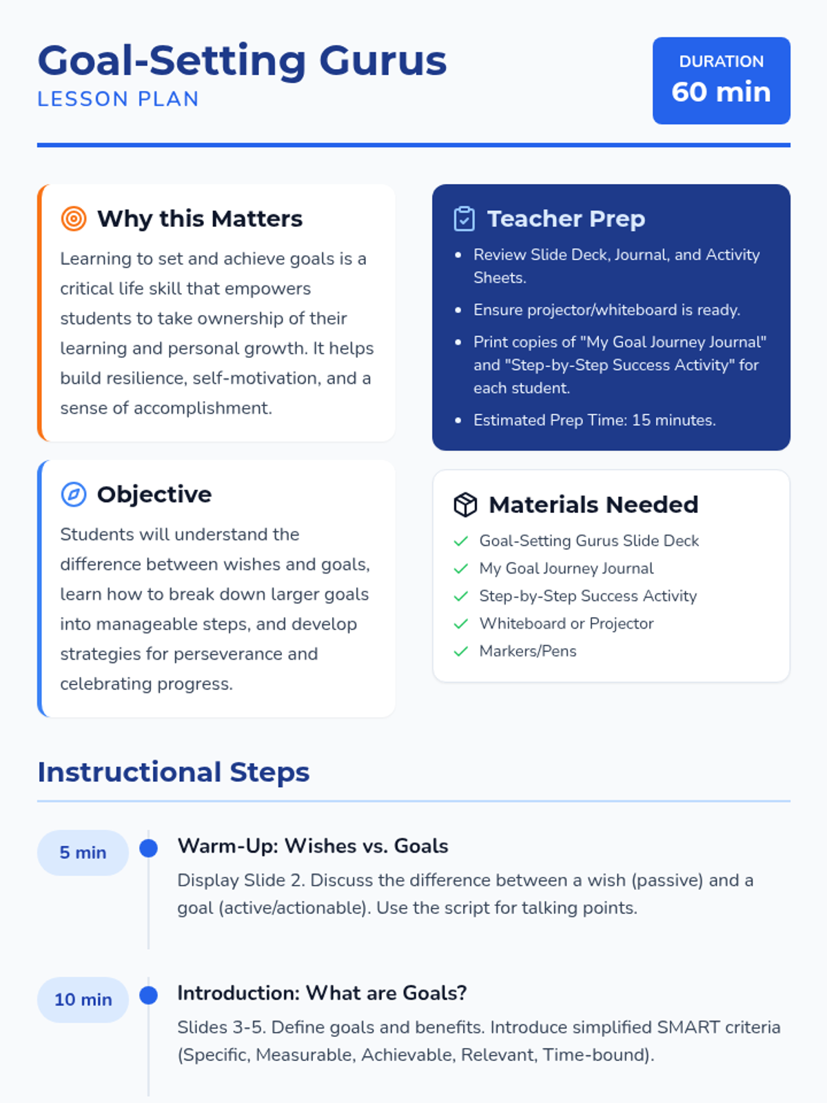 A comprehensive 60-minute lesson for 4th and 5th graders on the fundamentals of setting and achieving goals using the SMART framework and a step-by-step planning approach.