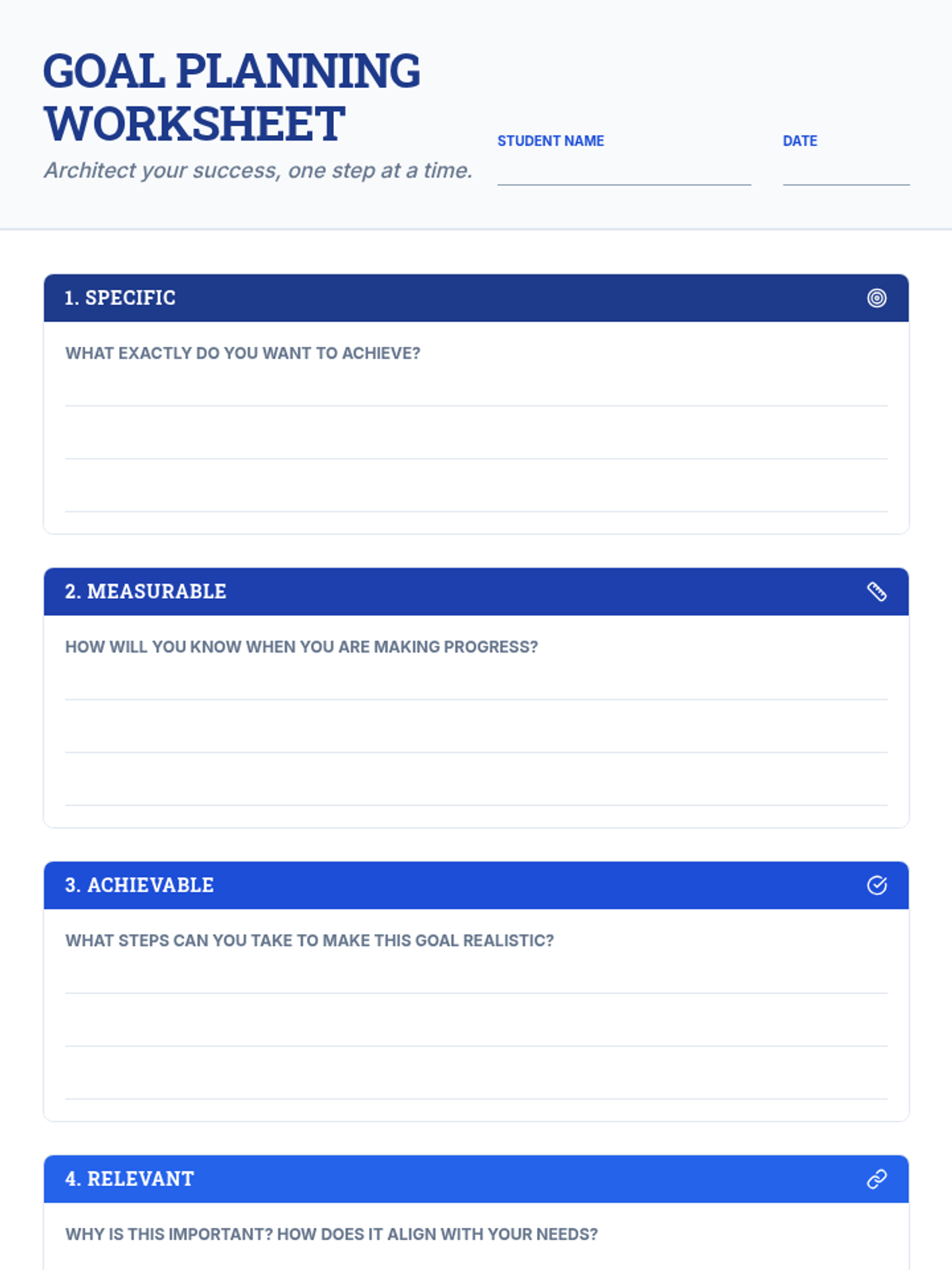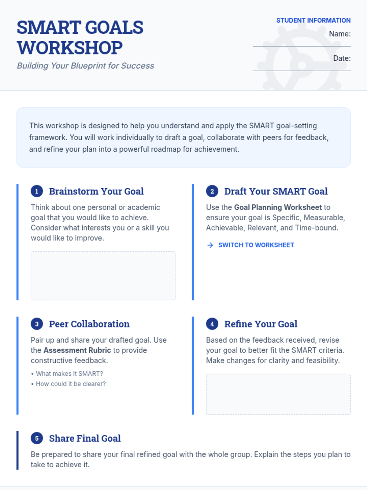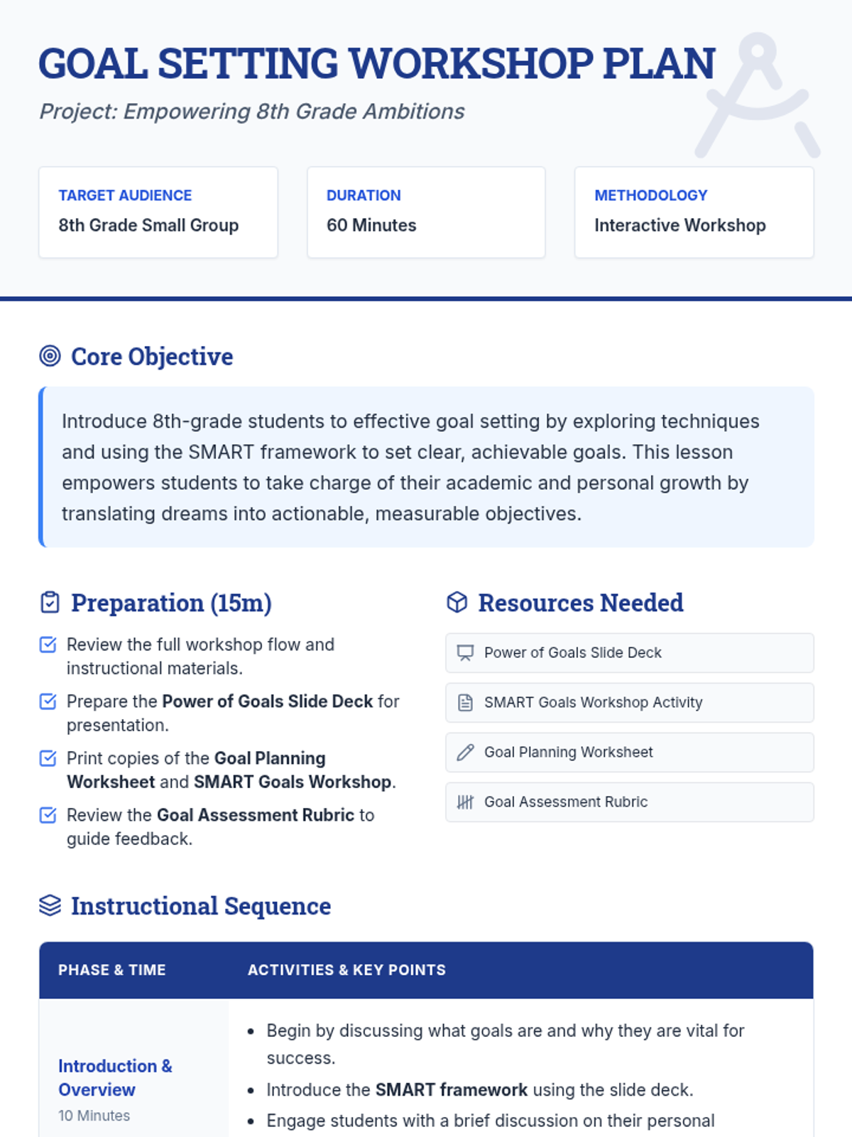 A comprehensive 60-minute workshop designed for 8th-grade small groups to master the SMART framework and create actionable personal or academic goals. Students engage in discussions, hands-on drafting, and peer feedback sessions to transform aspirations into reality.