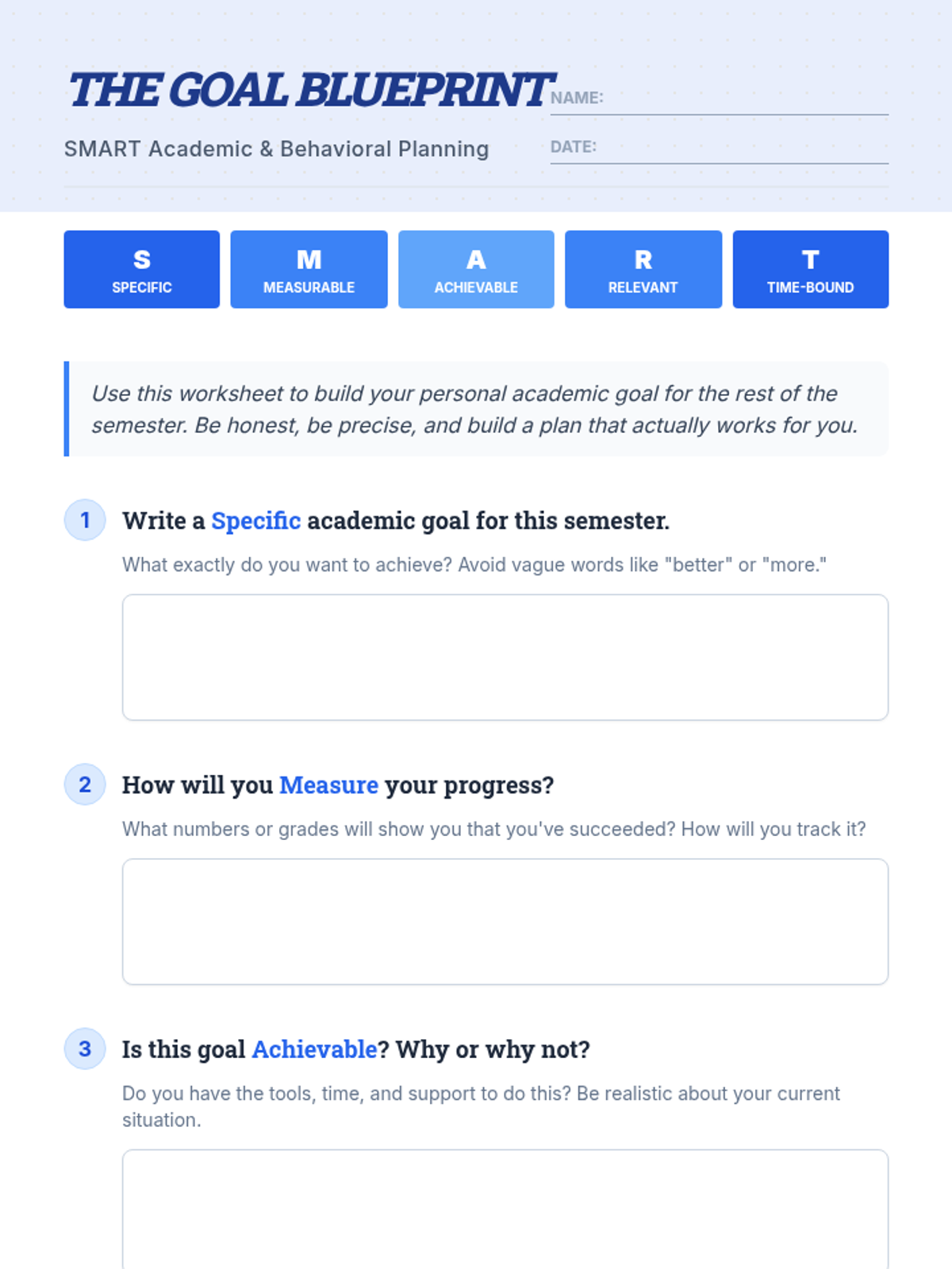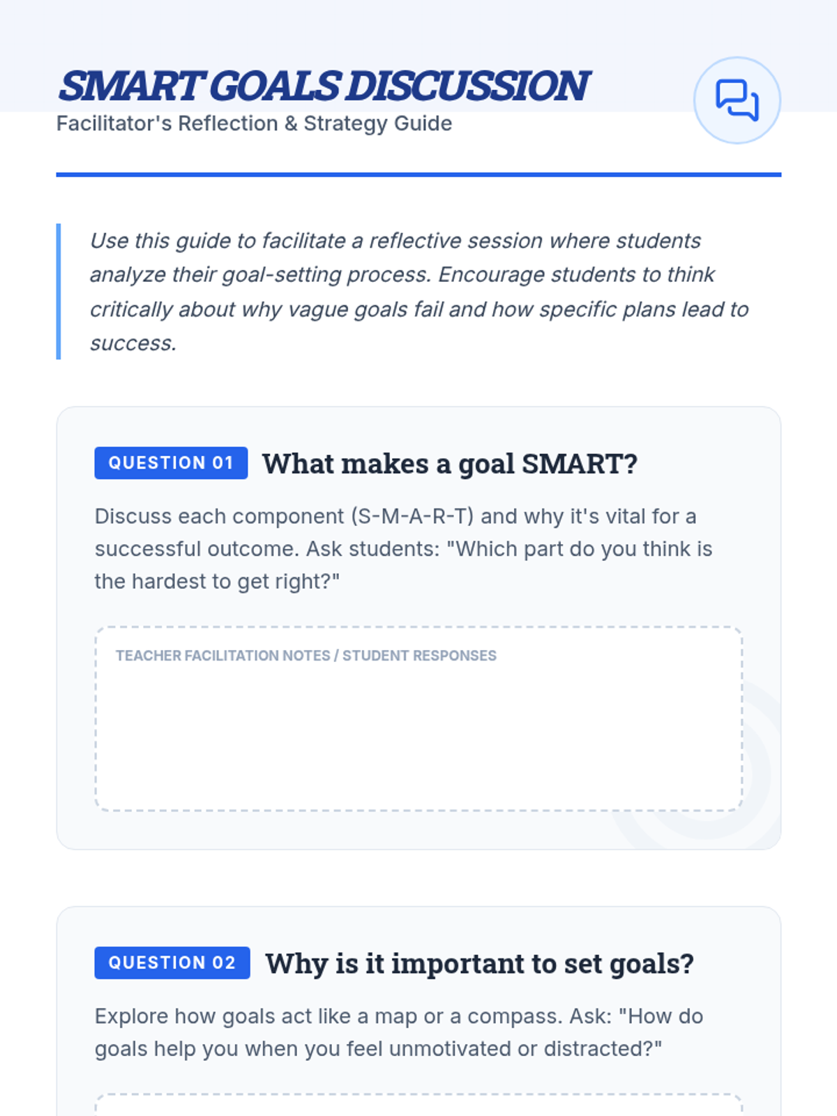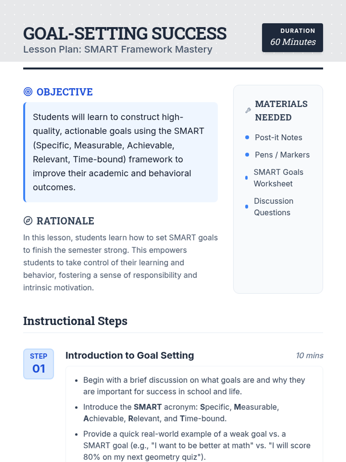 A comprehensive lesson designed for middle school students to master the SMART goal-setting framework. Students will develop specific academic and behavioral plans to improve their performance and take ownership of their success.