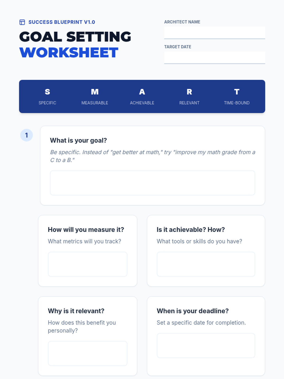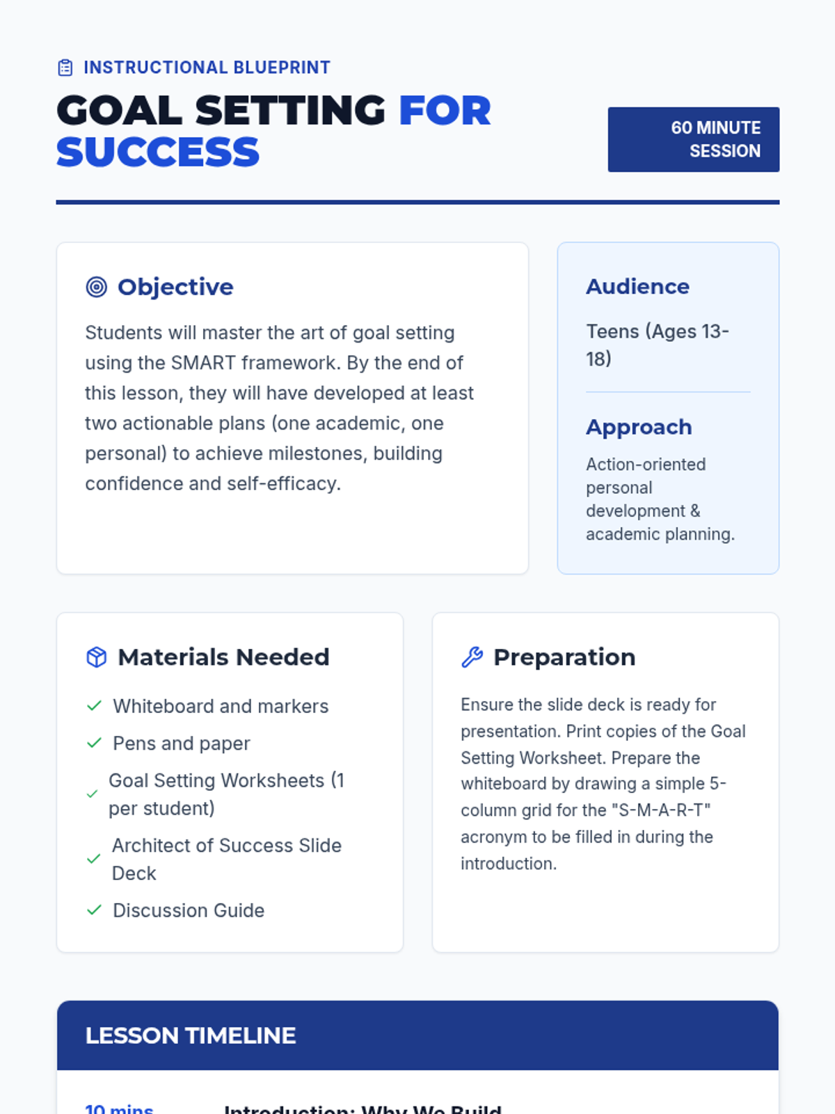 A comprehensive lesson designed for teenagers to master the art of goal setting using the SMART framework. Students will develop actionable plans to achieve personal and academic milestones, building confidence and self-efficacy.