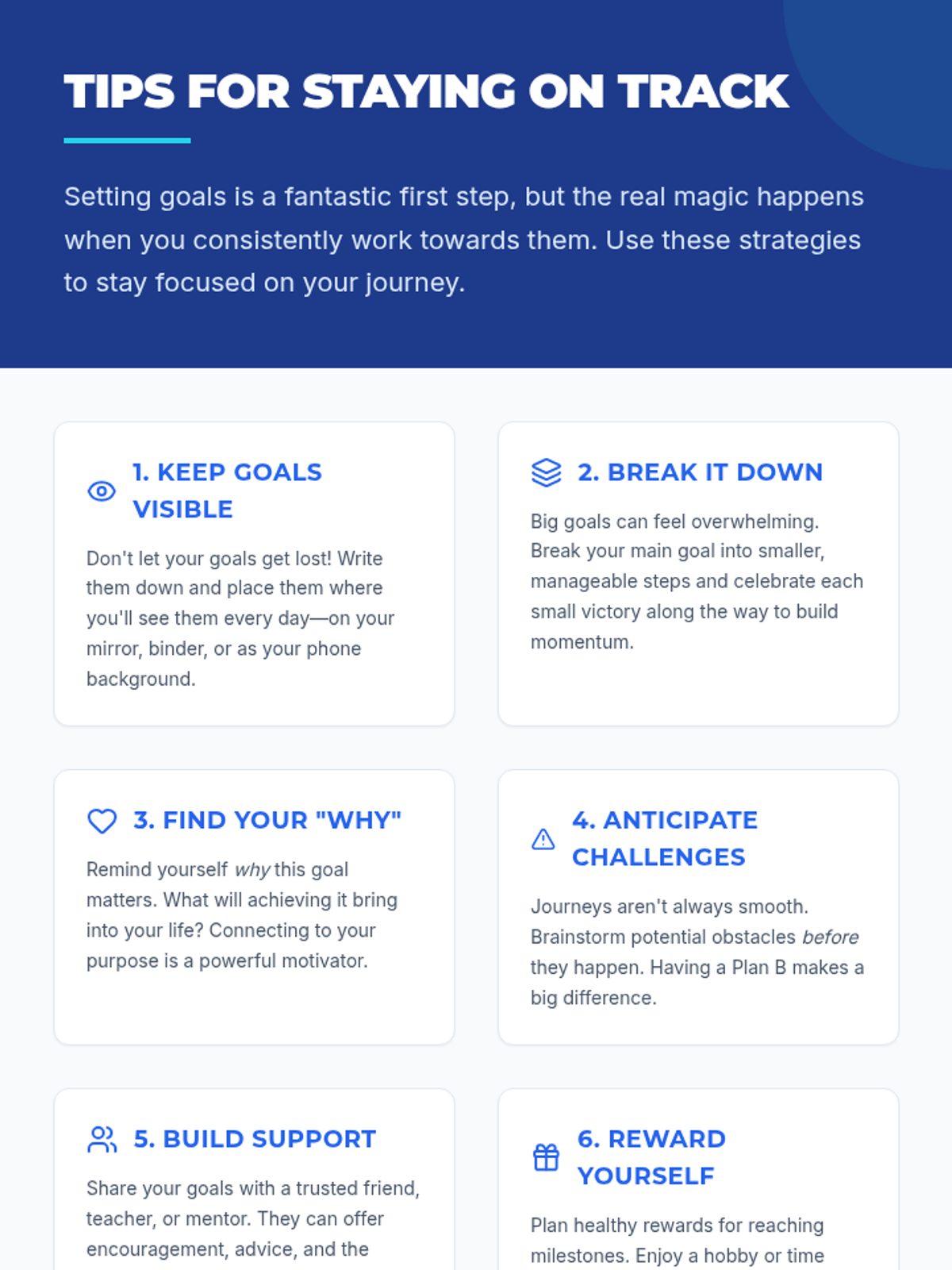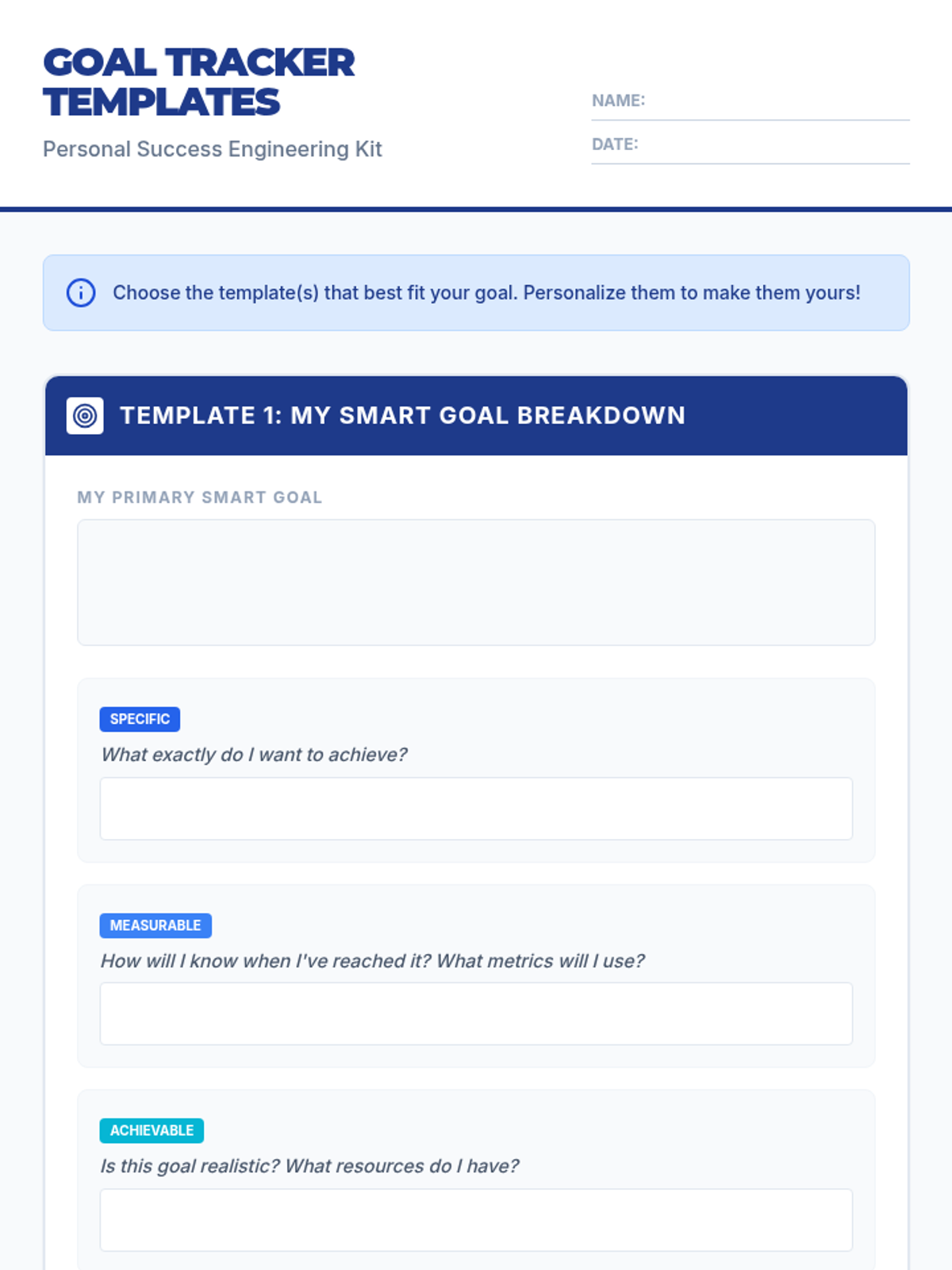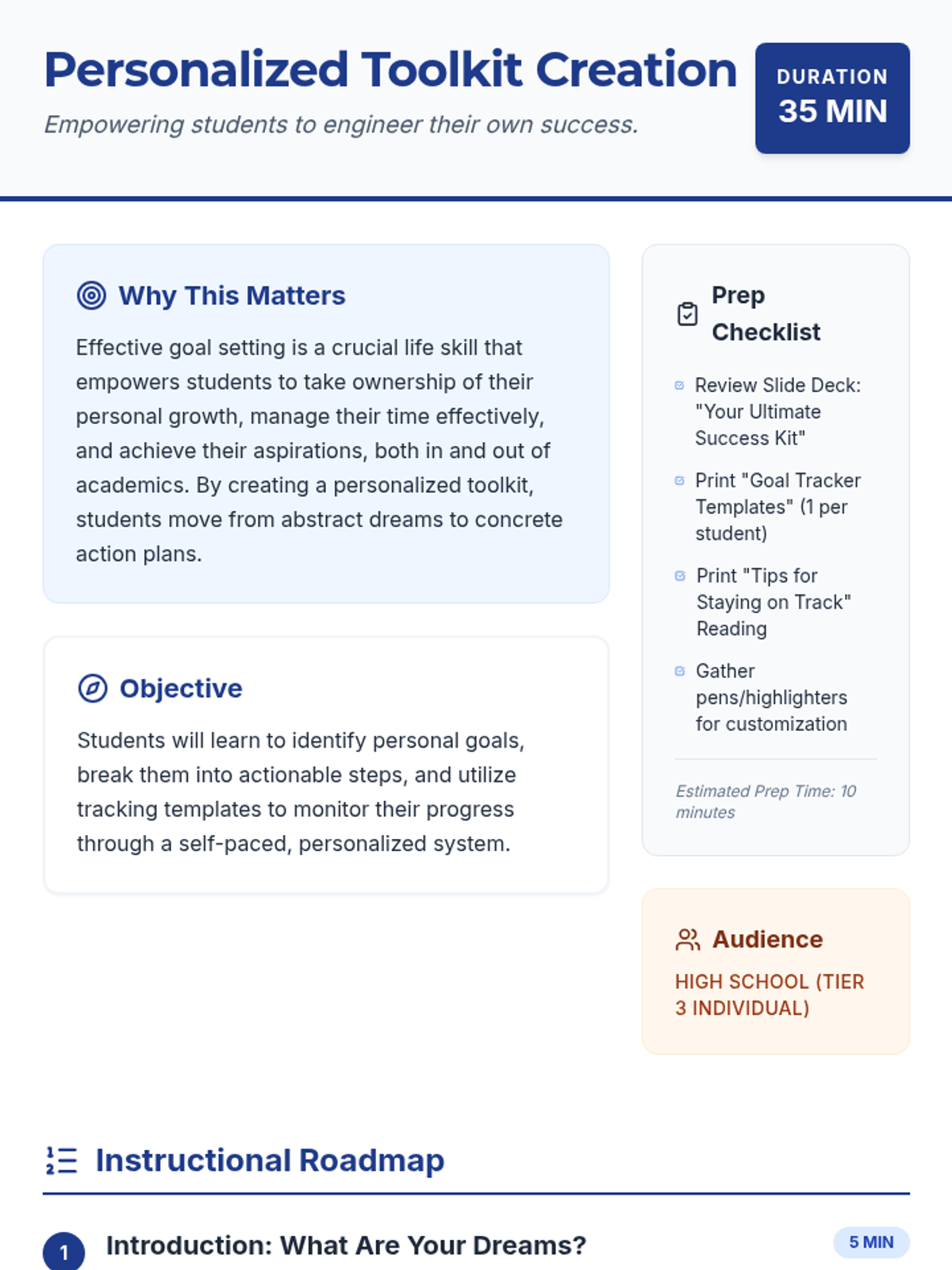 A comprehensive session equipping students with a personalized toolkit for setting, tracking, and achieving SMART goals through guided templates and strategic advice.