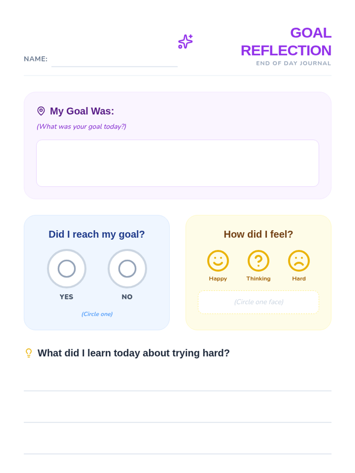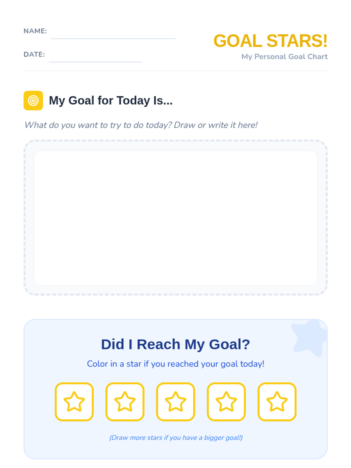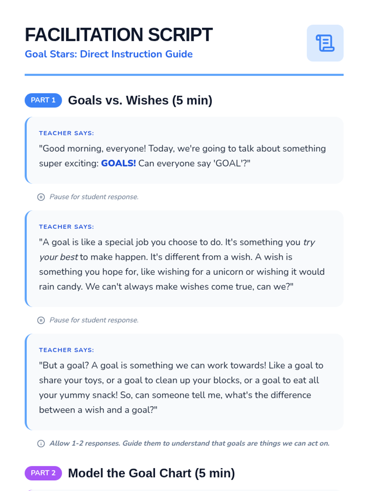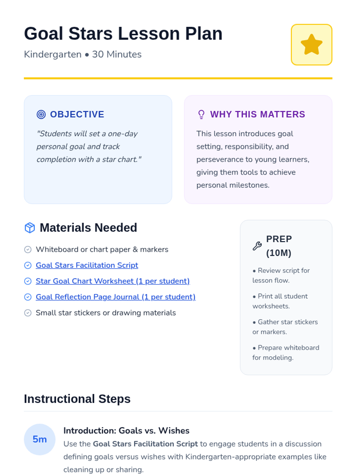 In this lesson, Kindergarten students will learn the difference between wishes and achievable goals, set a simple one-day personal goal, and track their success. Through modeling, individual practice, and reflection, they develop foundational skills in responsibility and perseverance.