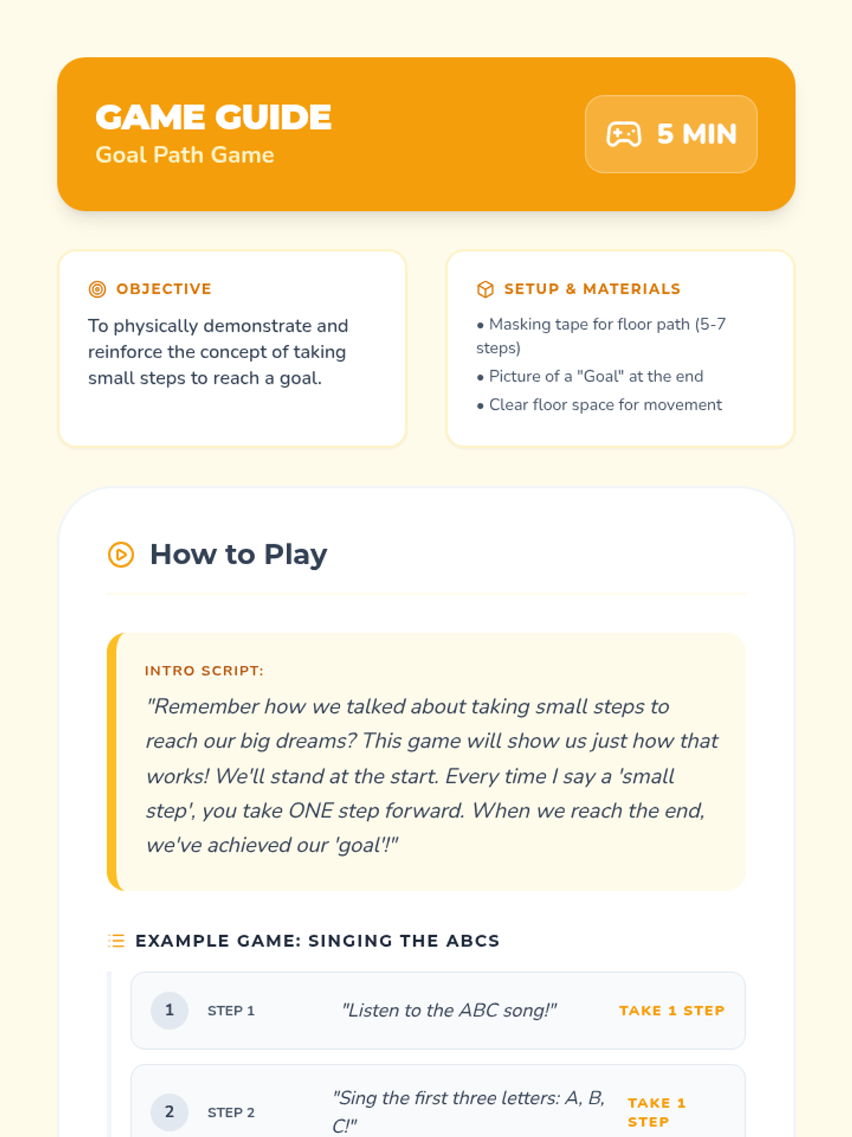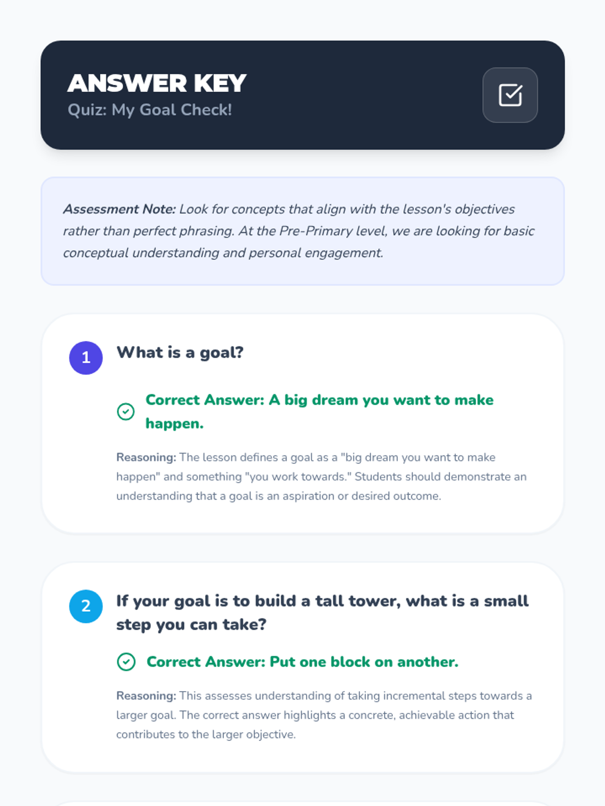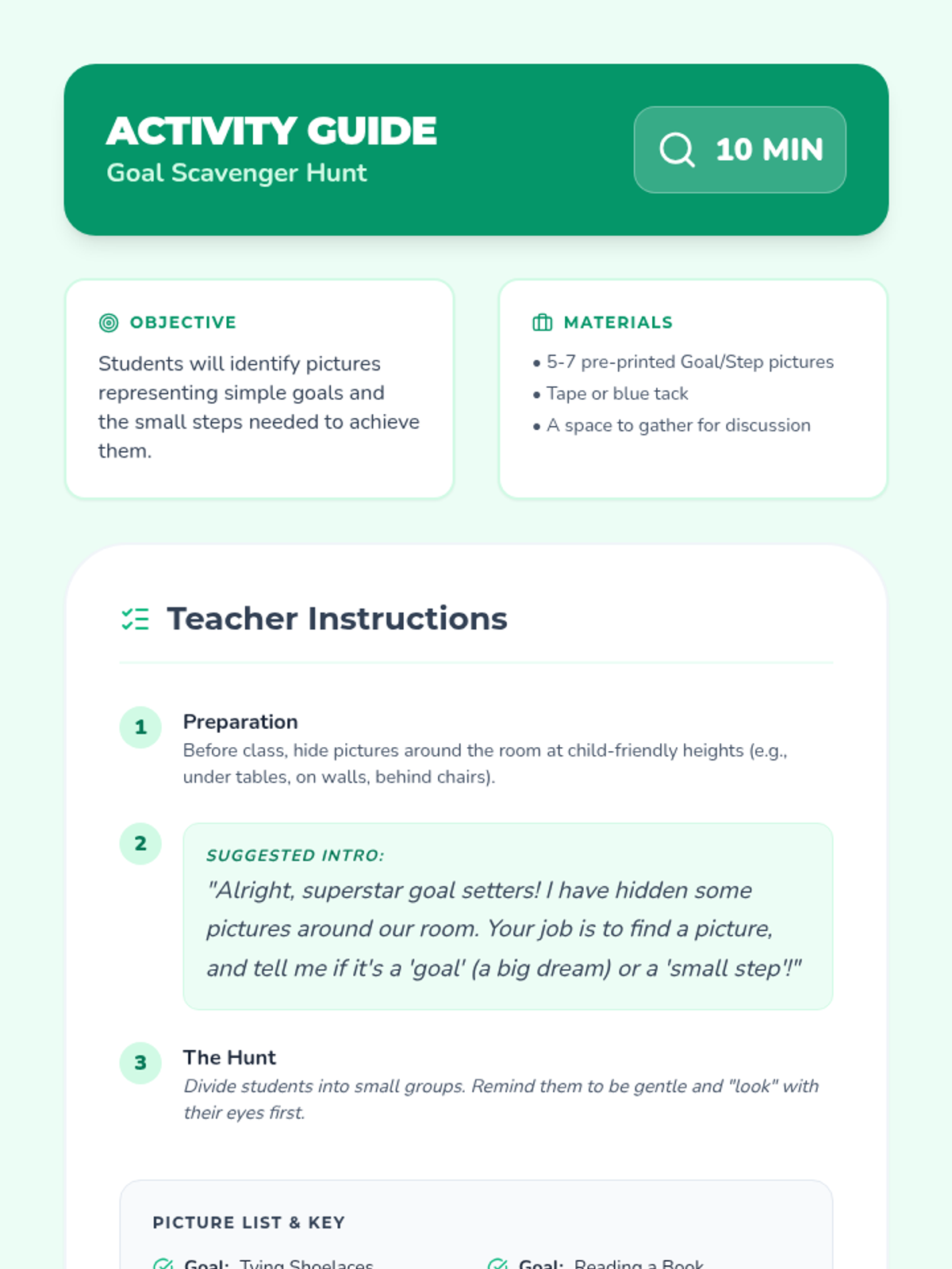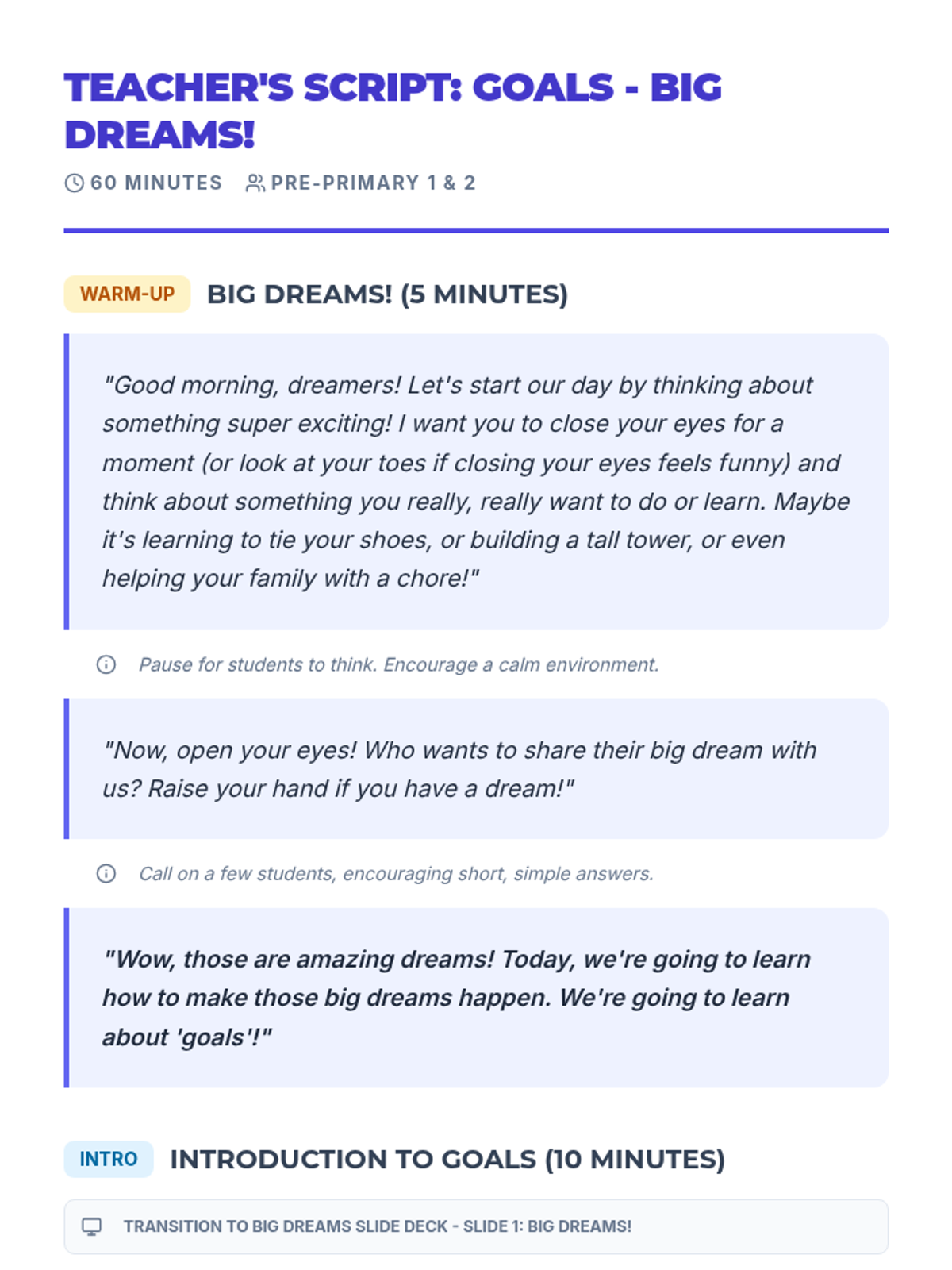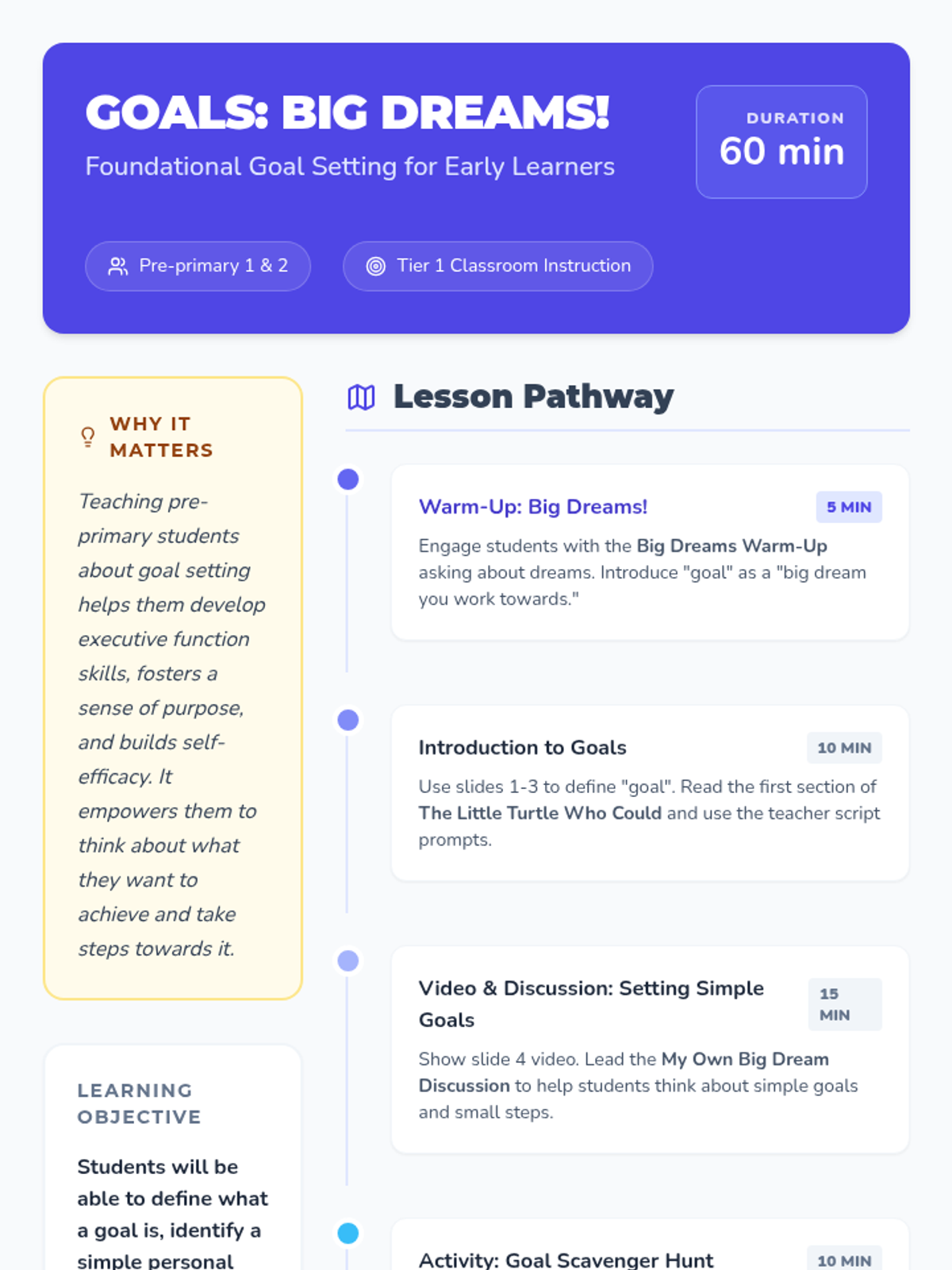 This lesson introduces Pre-primary 1 and 2 students to the concept of goal setting in a fun and relatable way. Students will learn what a goal is, why it's important, and how to set simple, achievable goals through stories, games, and creative activities.