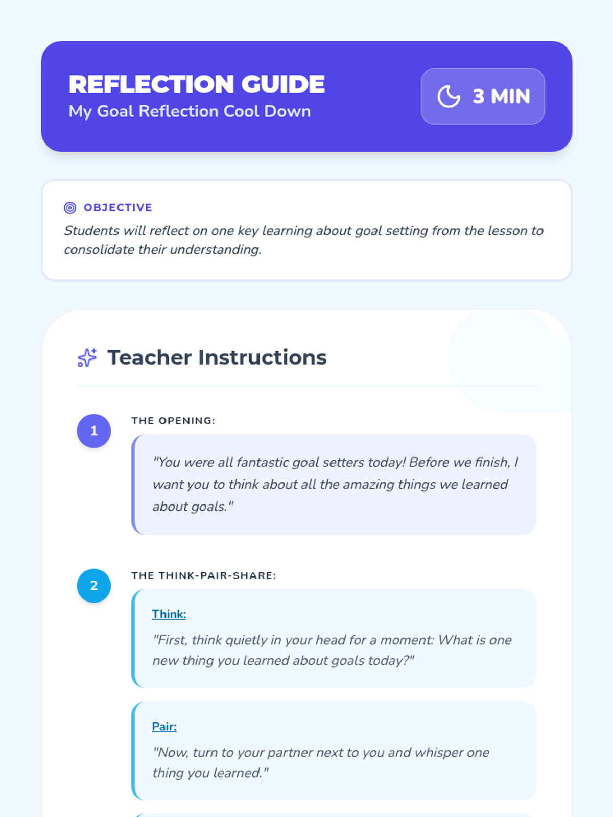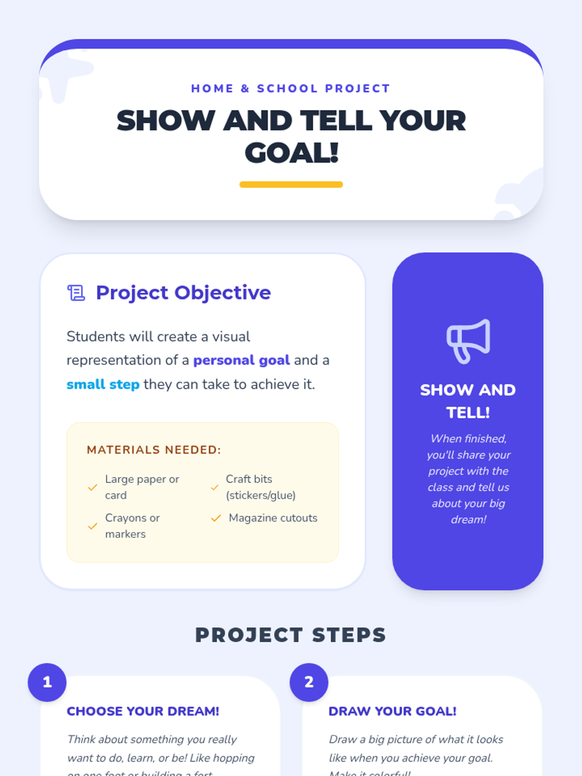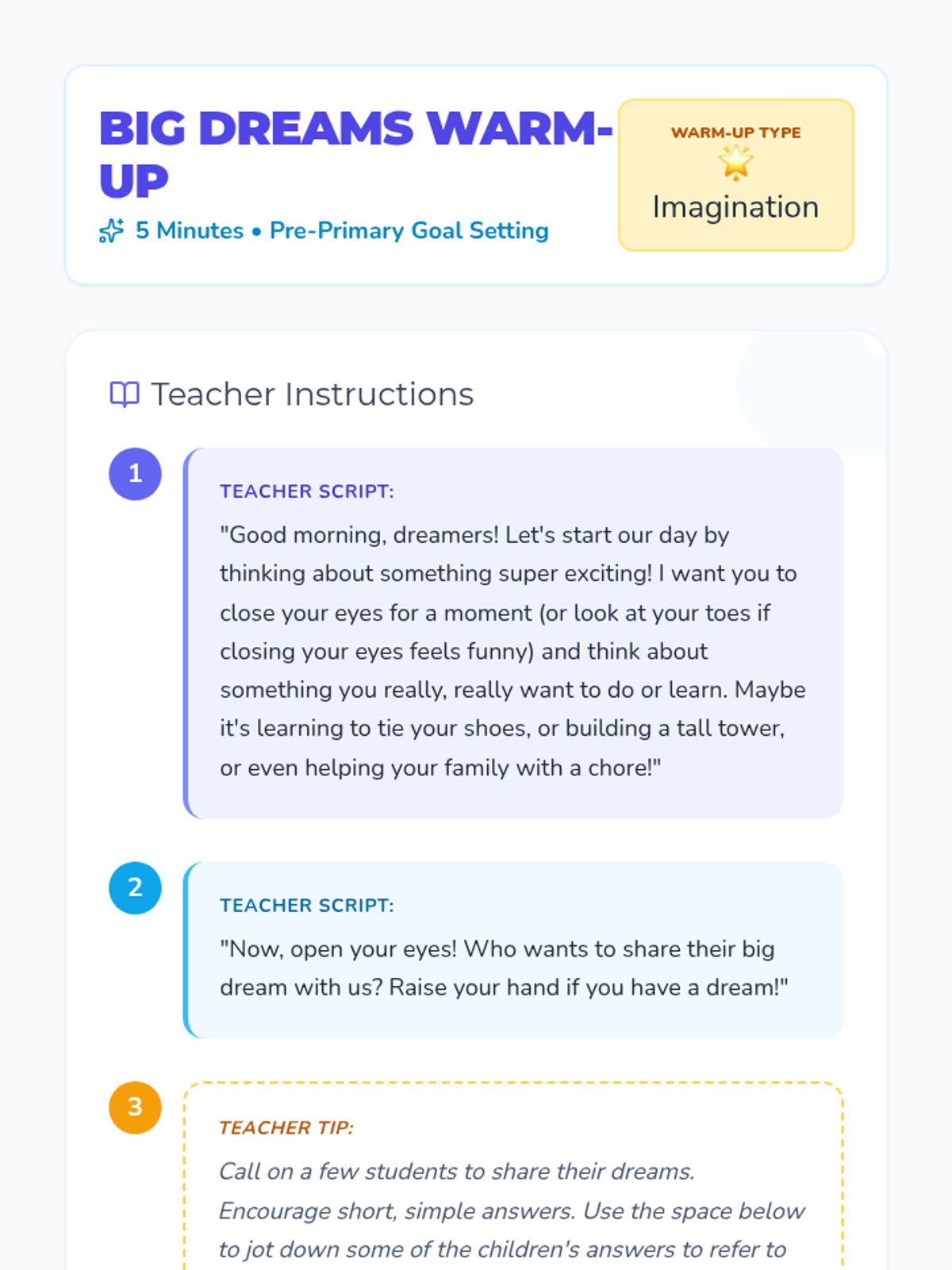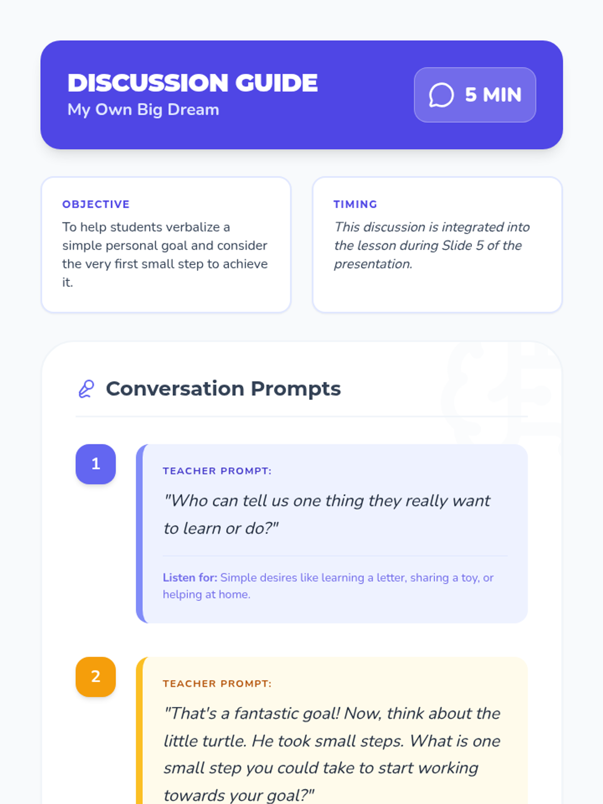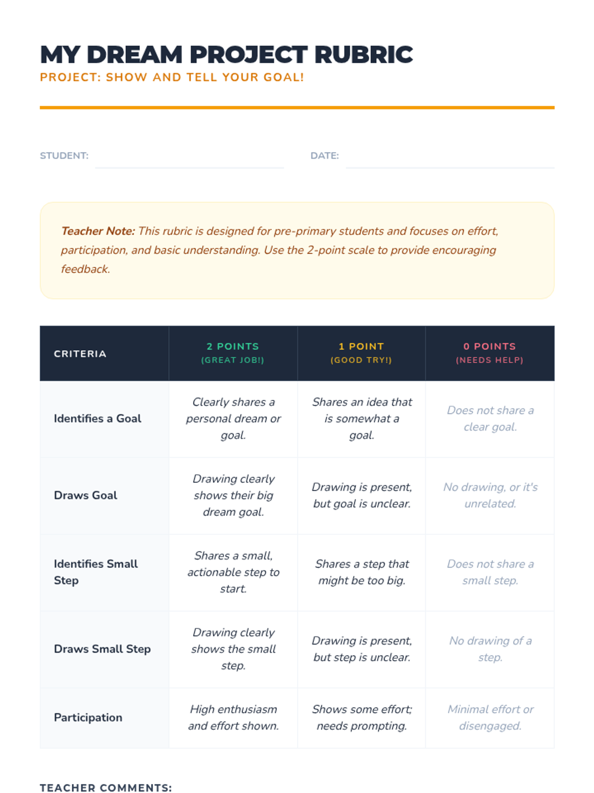 This lesson introduces Pre-primary 1 and 2 students to the concept of goal setting in a fun and relatable way. Students will learn what a goal is, why it's important, and how to set simple, achievable goals through stories, games, and creative activities.