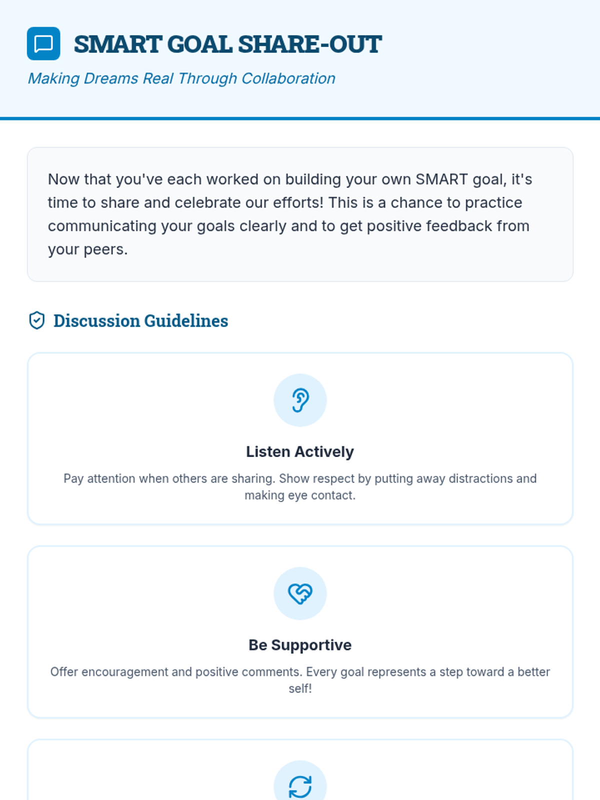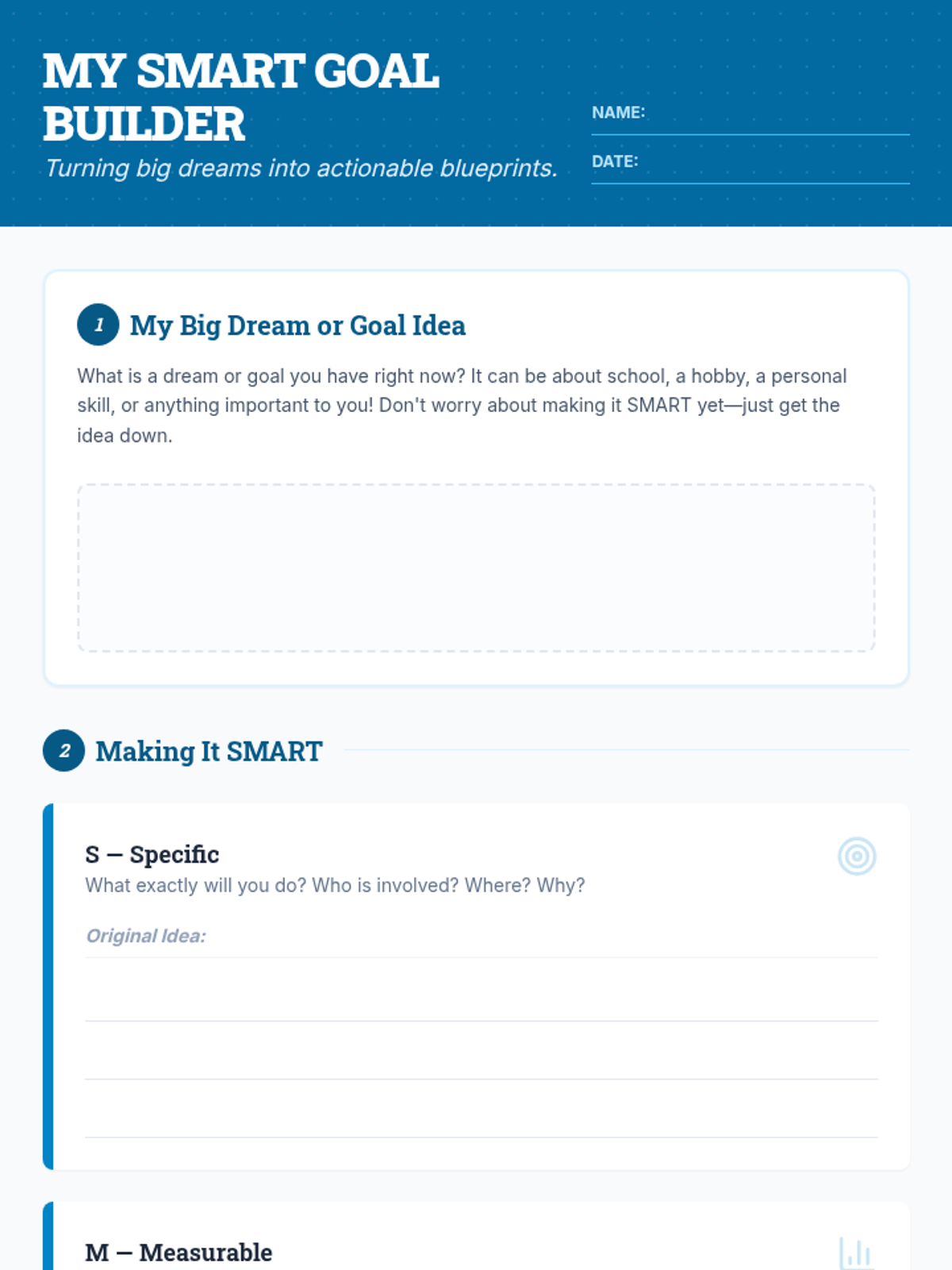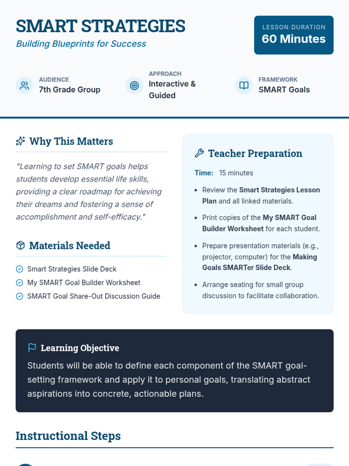 A 60-minute small group session for 7th graders to learn and apply the SMART goal-setting framework, turning big dreams into actionable plans.