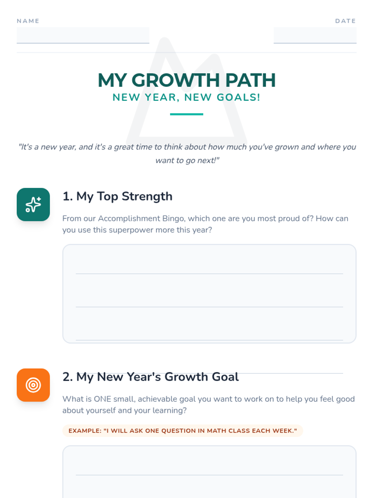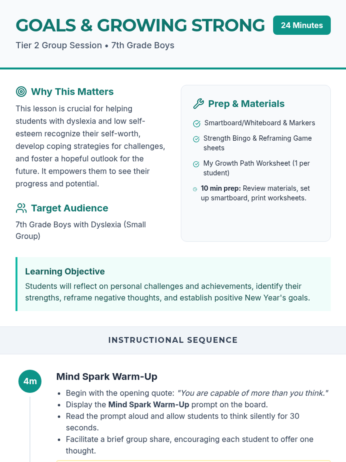 This lesson helps three 7th-grade boys with dyslexia and emotional concerns reflect on their school year, identify strengths, reframe challenges, and set empowering New Year's goals. This Tier 2 group session is designed for 24 minutes, focusing on building self-esteem and a growth mindset.
