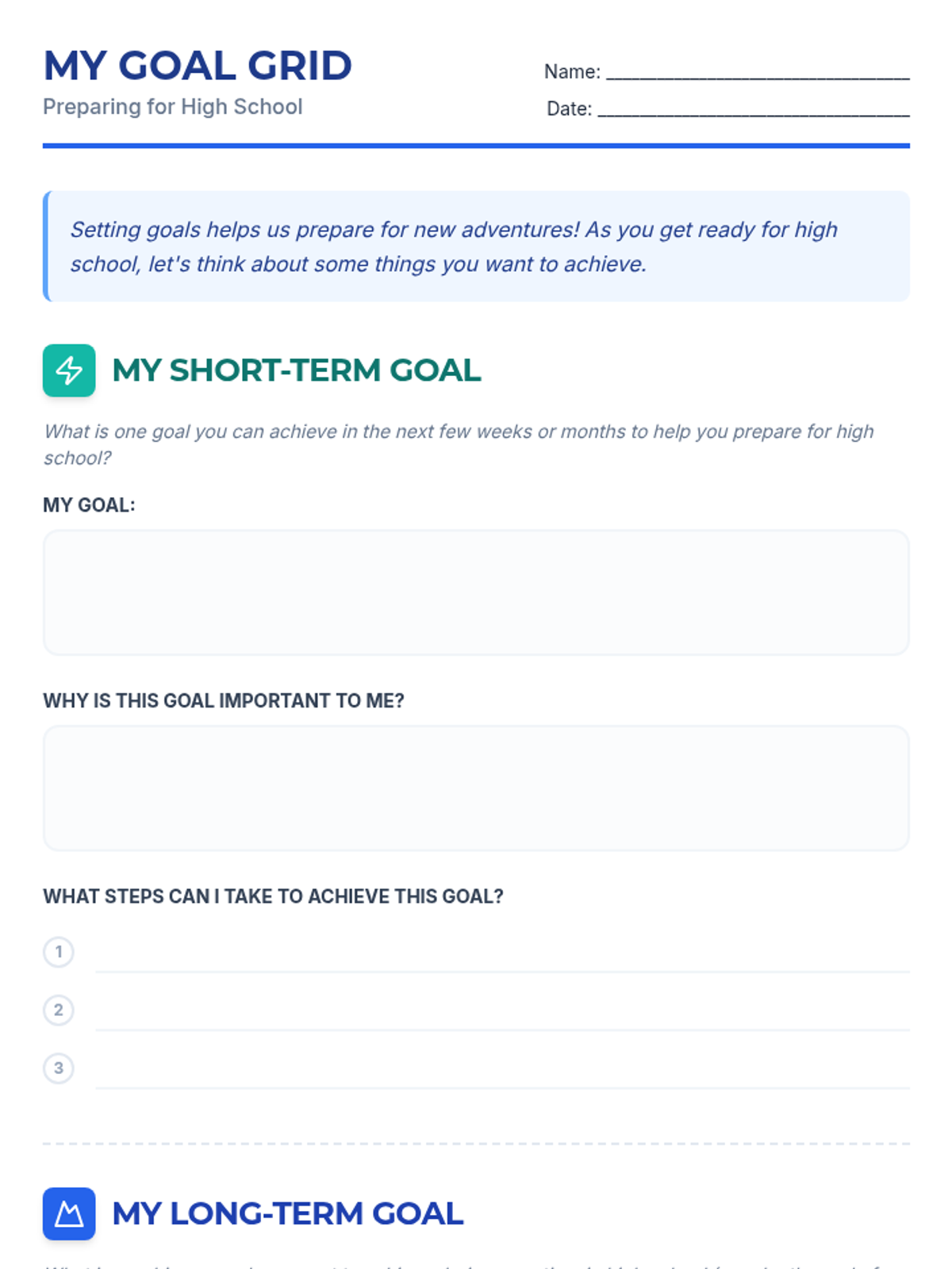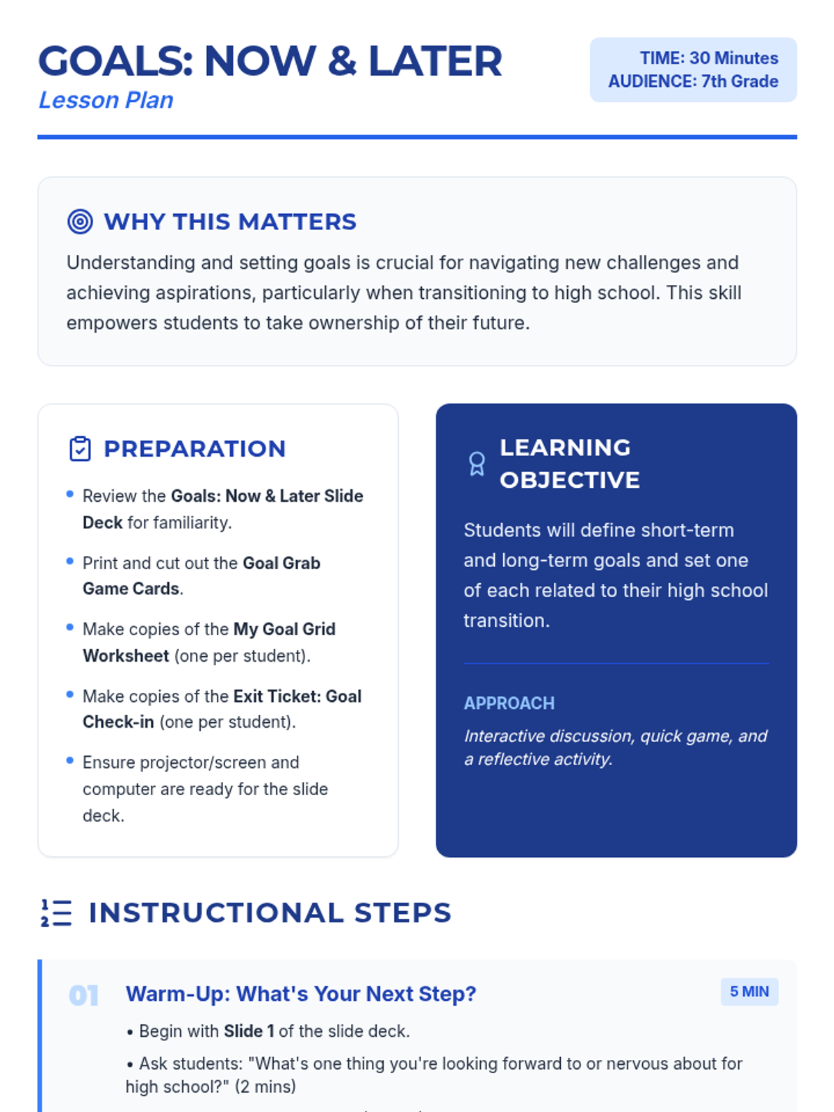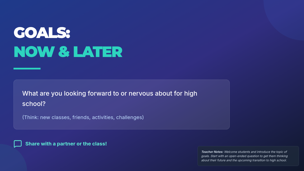 A 30-minute session for 7th graders to differentiate between short-term and long-term goals as they prepare for high school. Students will define, categorize, and set their own goals for the future transition.