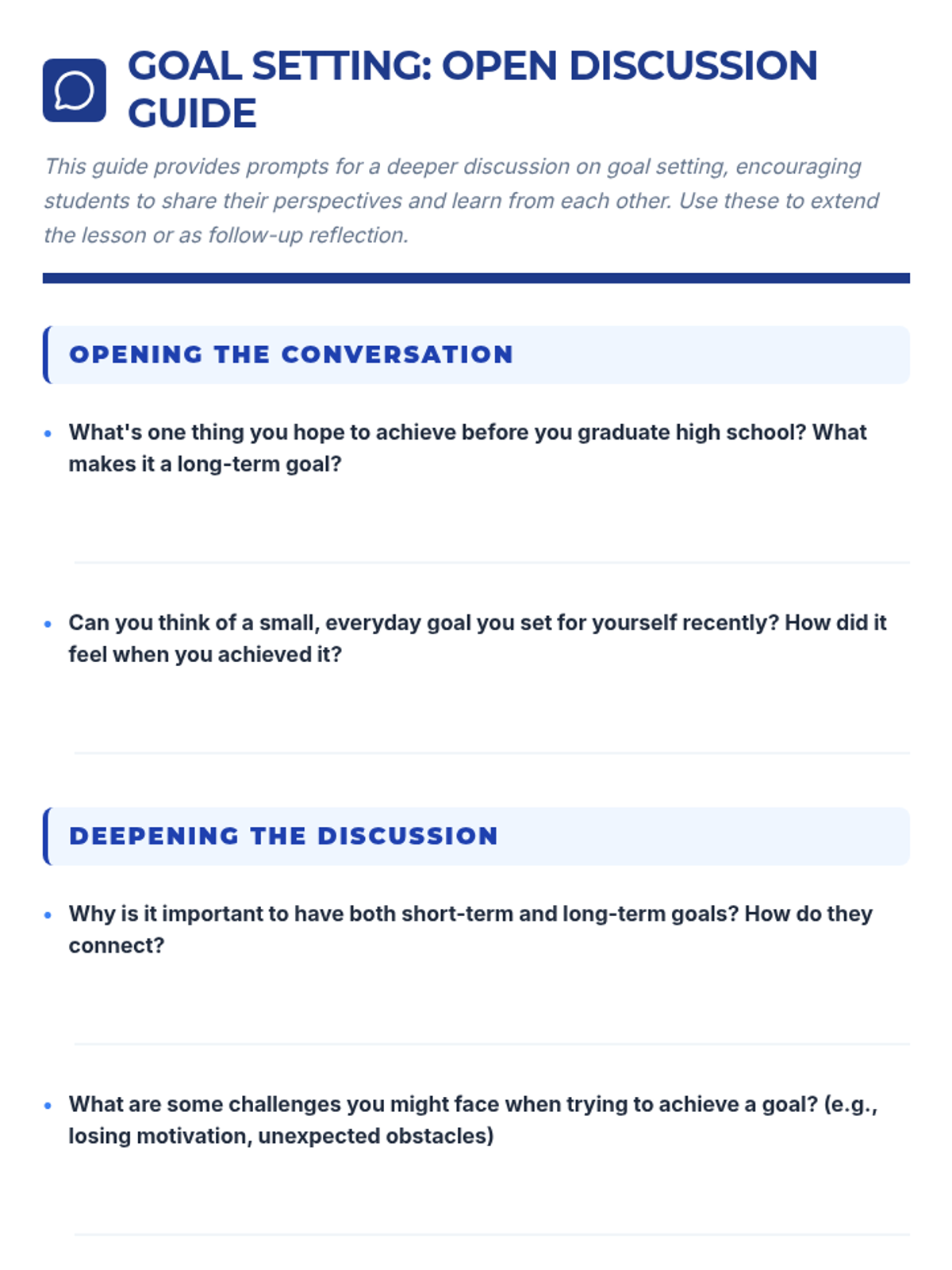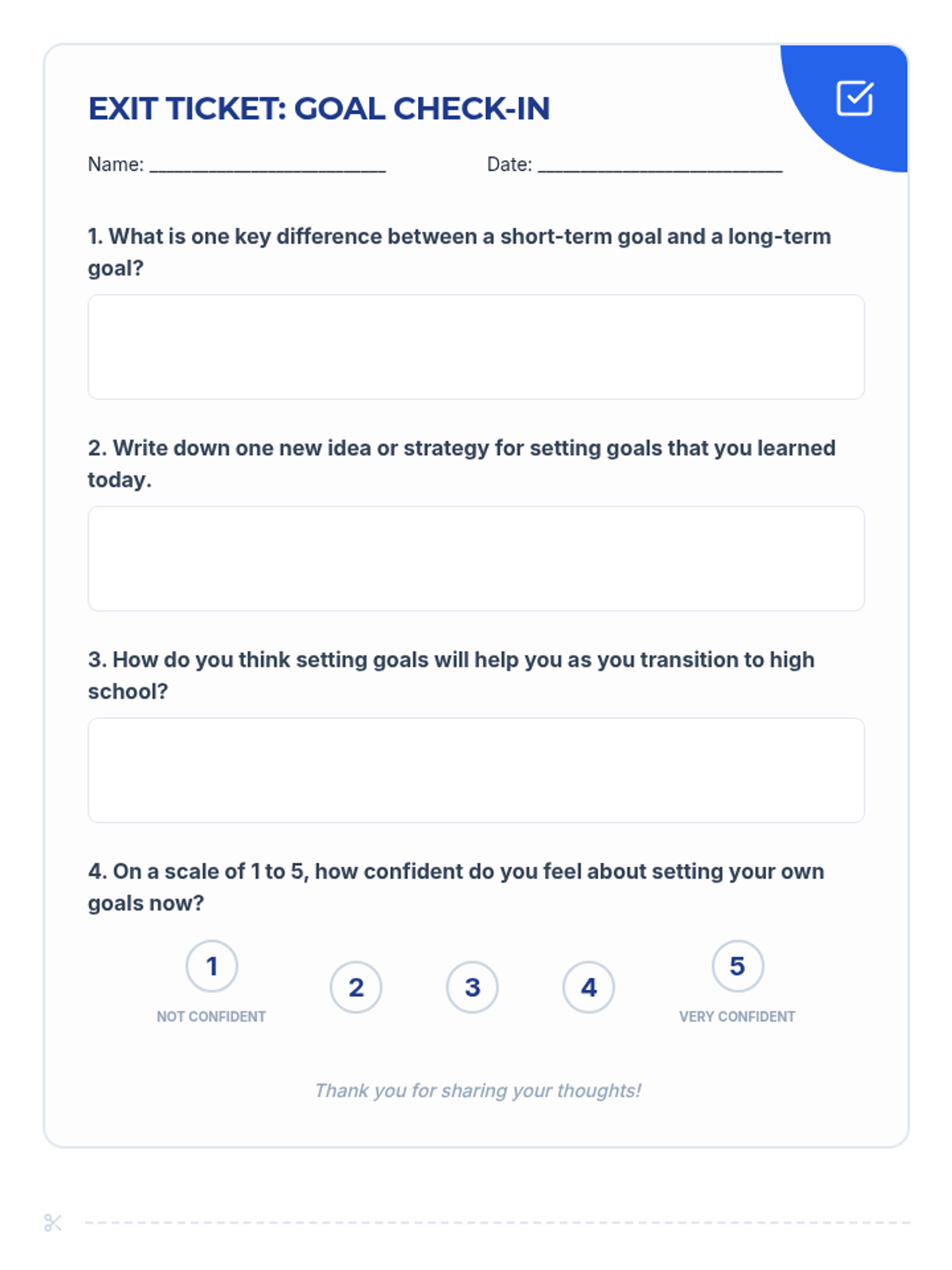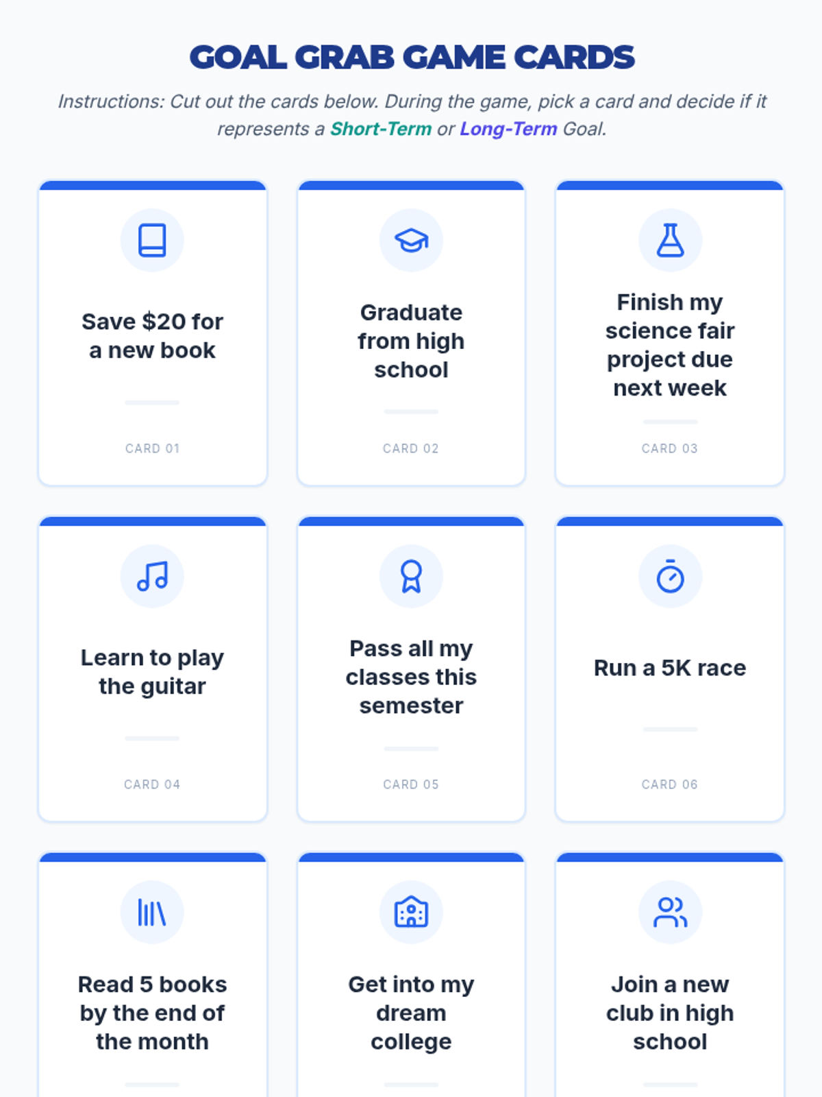 A 30-minute session for 7th graders to differentiate between short-term and long-term goals as they prepare for high school. Students will define, categorize, and set their own goals for the future transition.