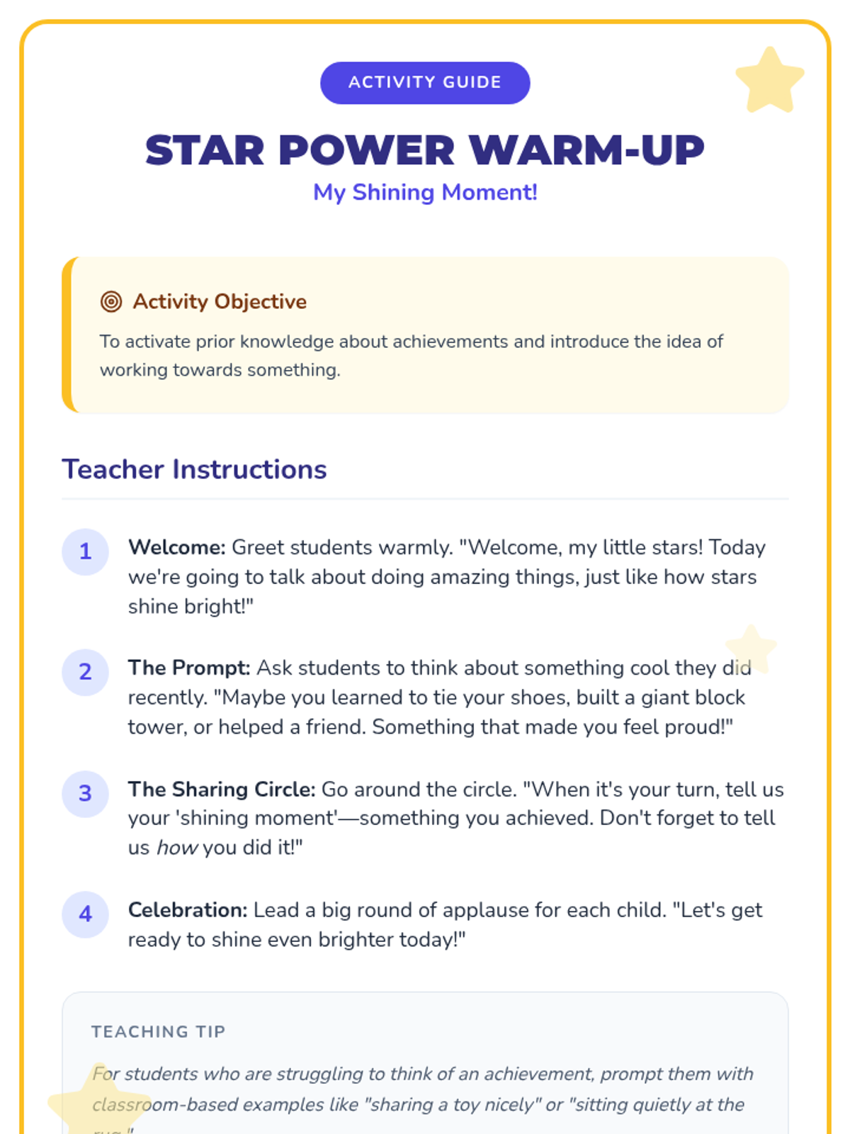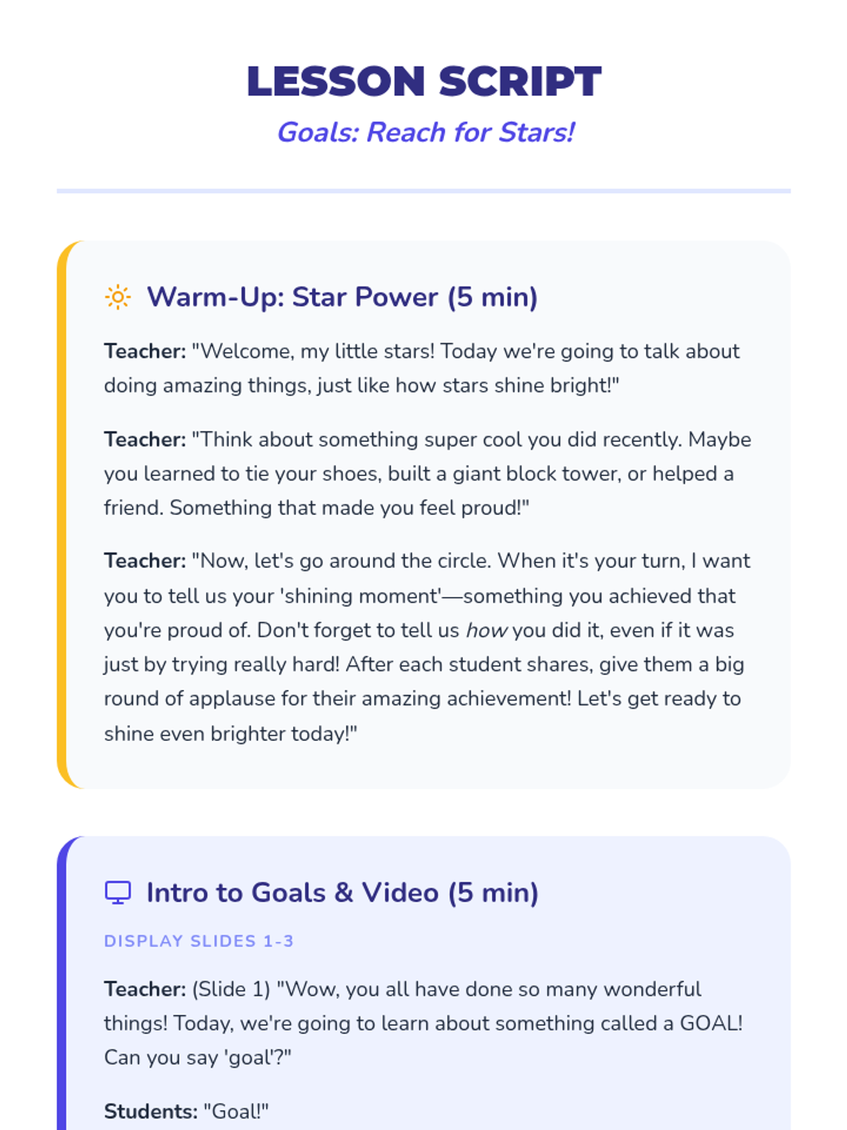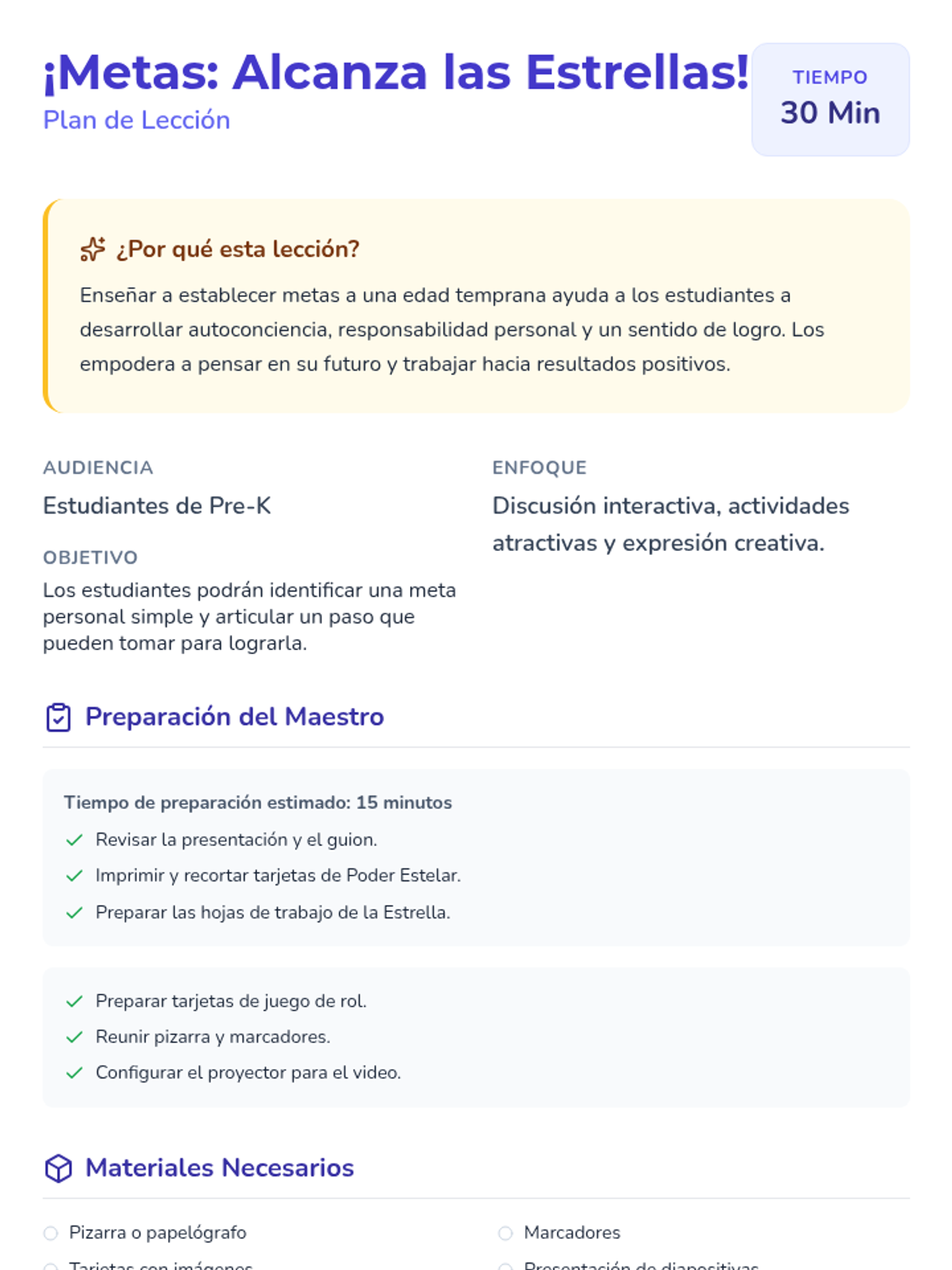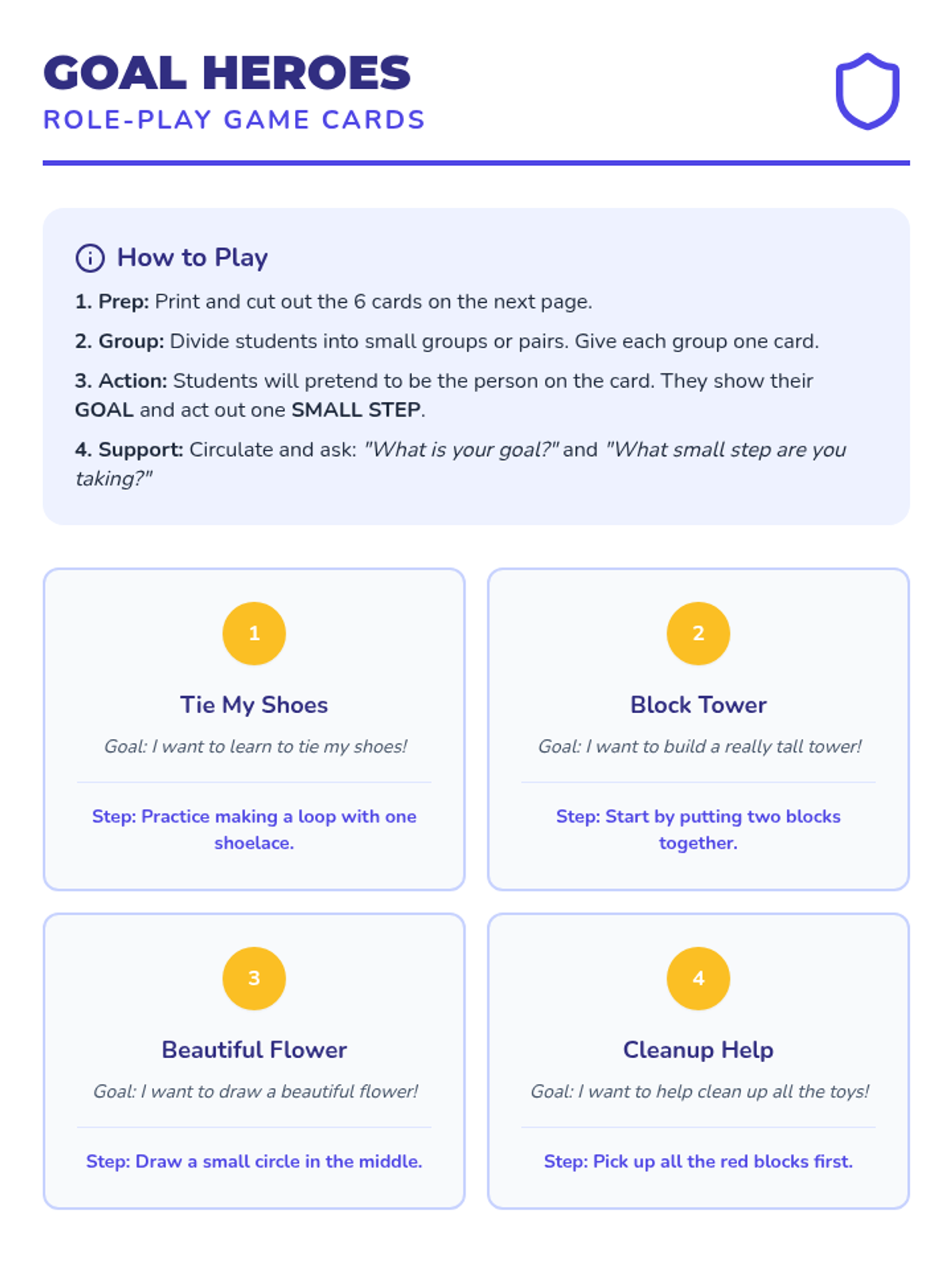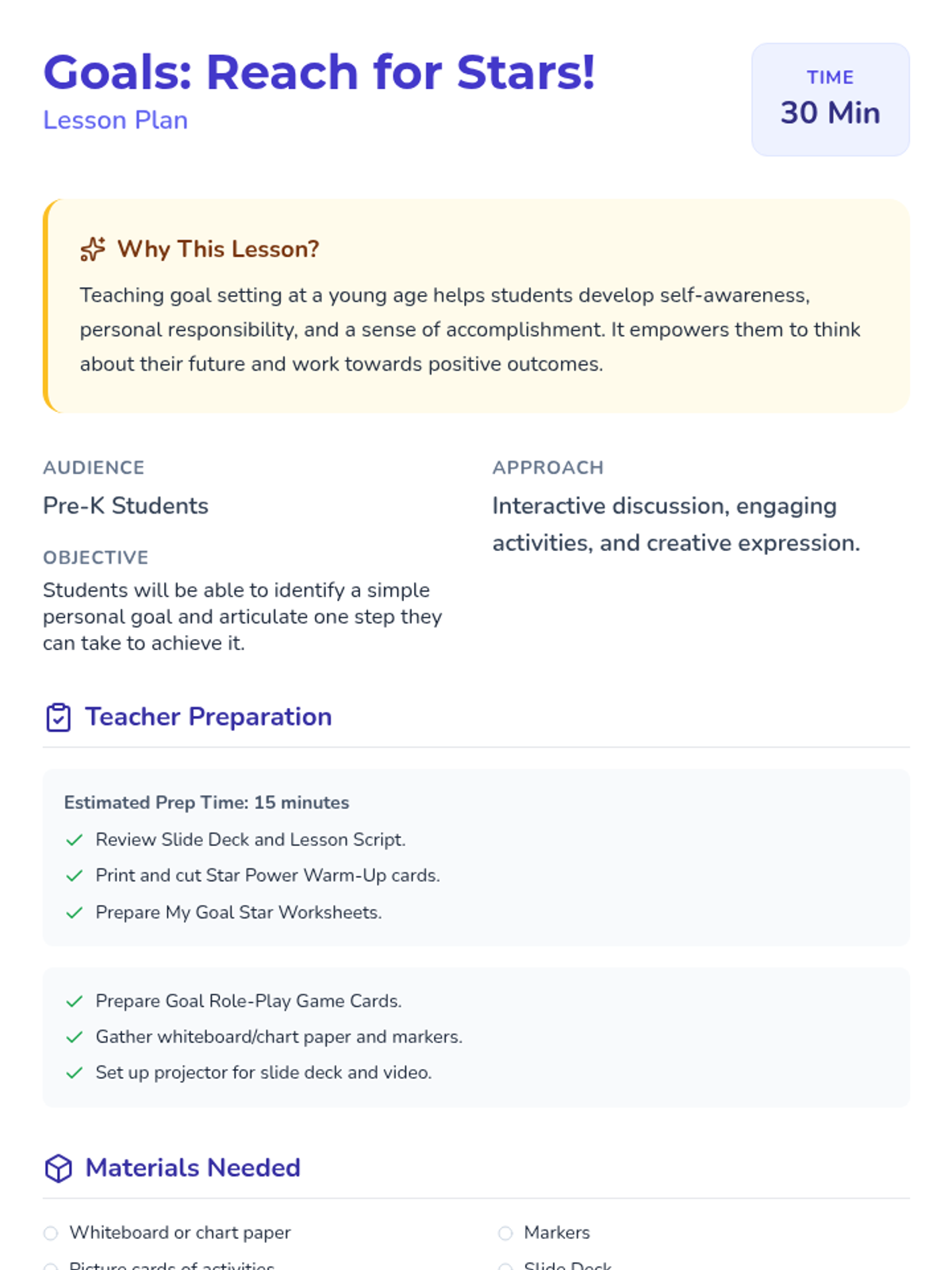 A 30-minute Pre-K lesson that introduces students to the concept of goal setting using the ASCA model. Through interactive role-play and creative drawing, students learn to identify simple personal goals and the small steps needed to achieve them.