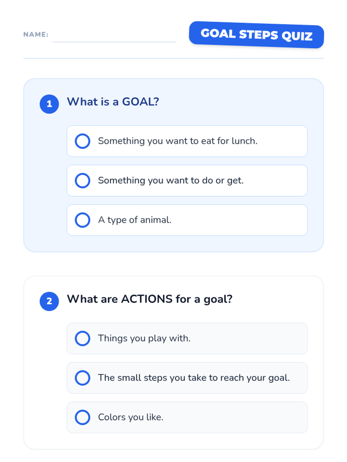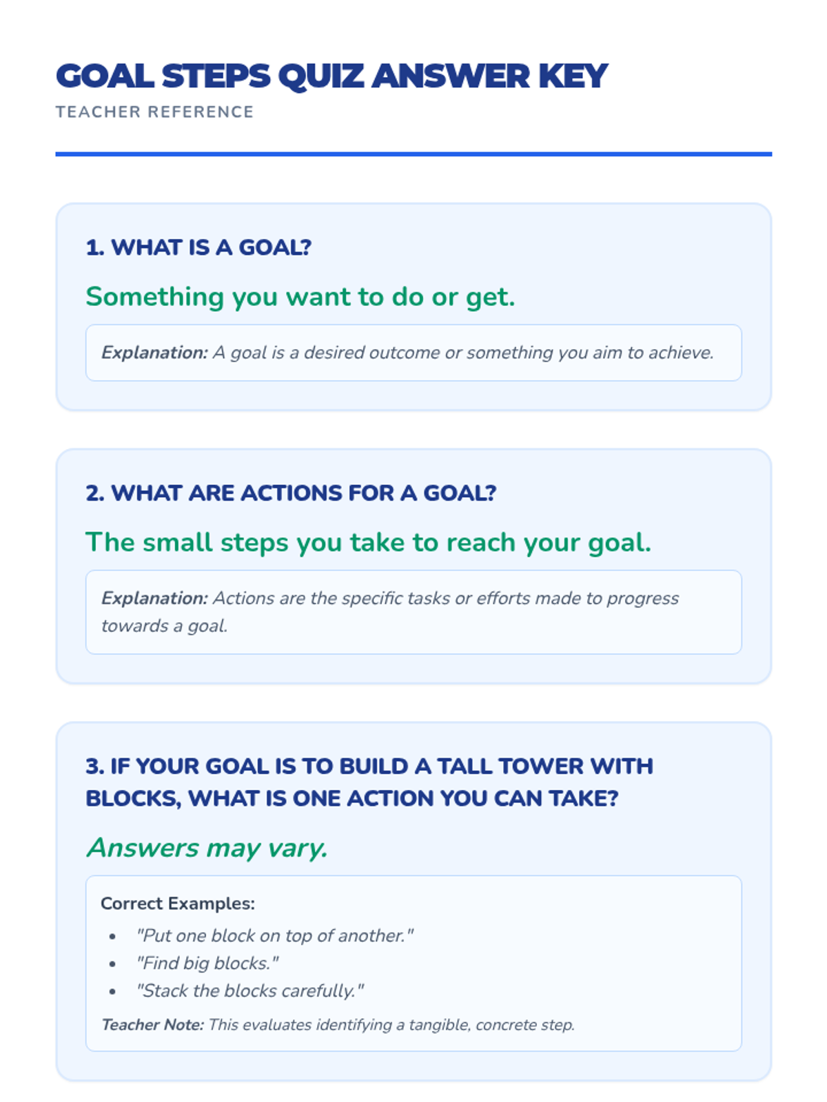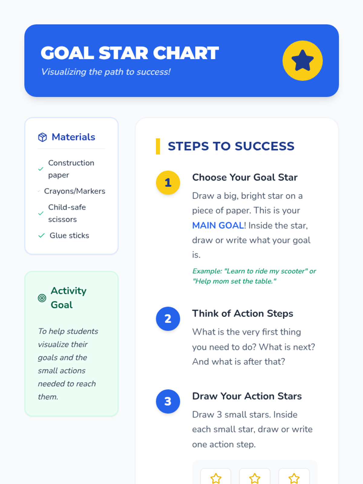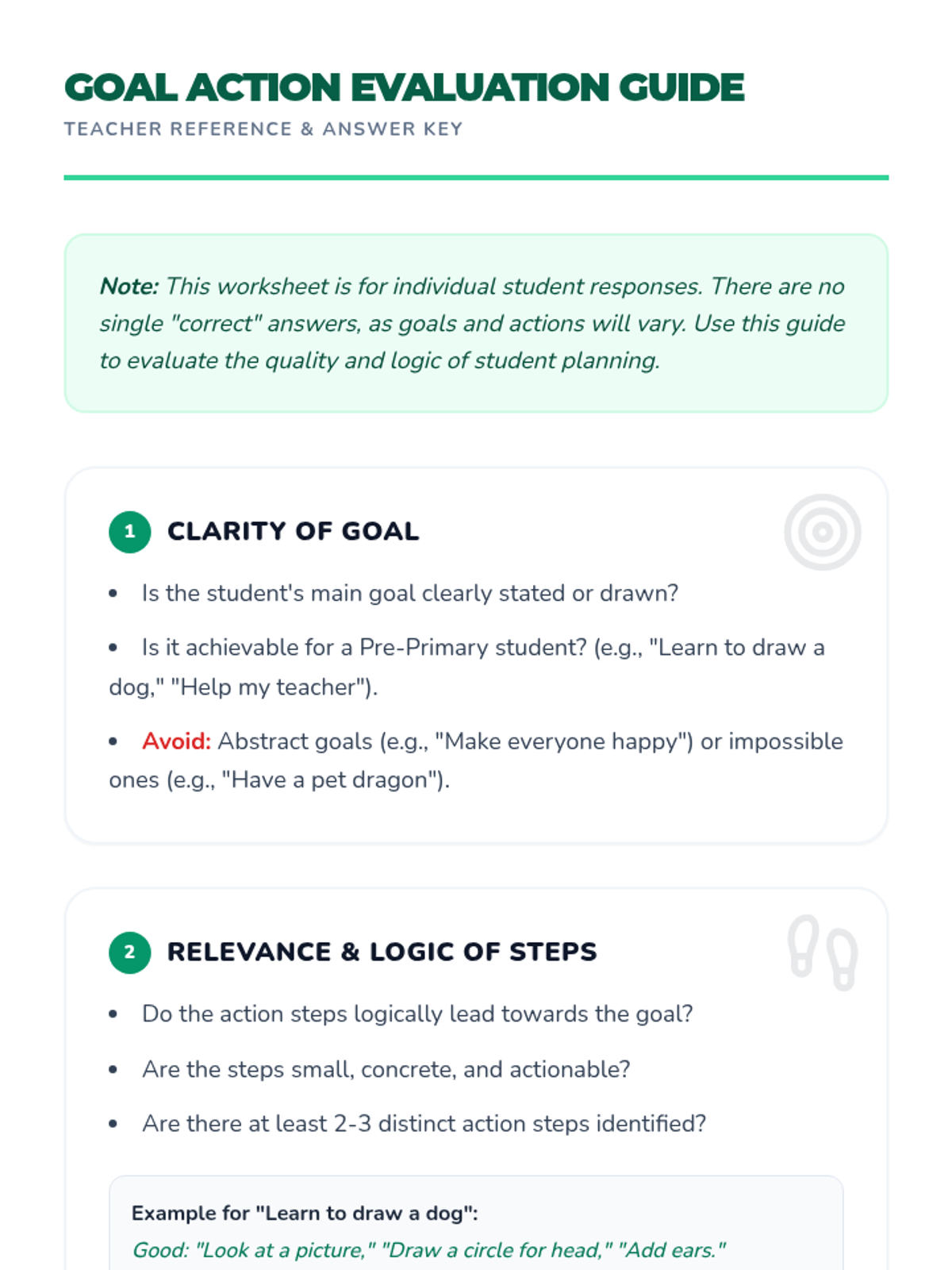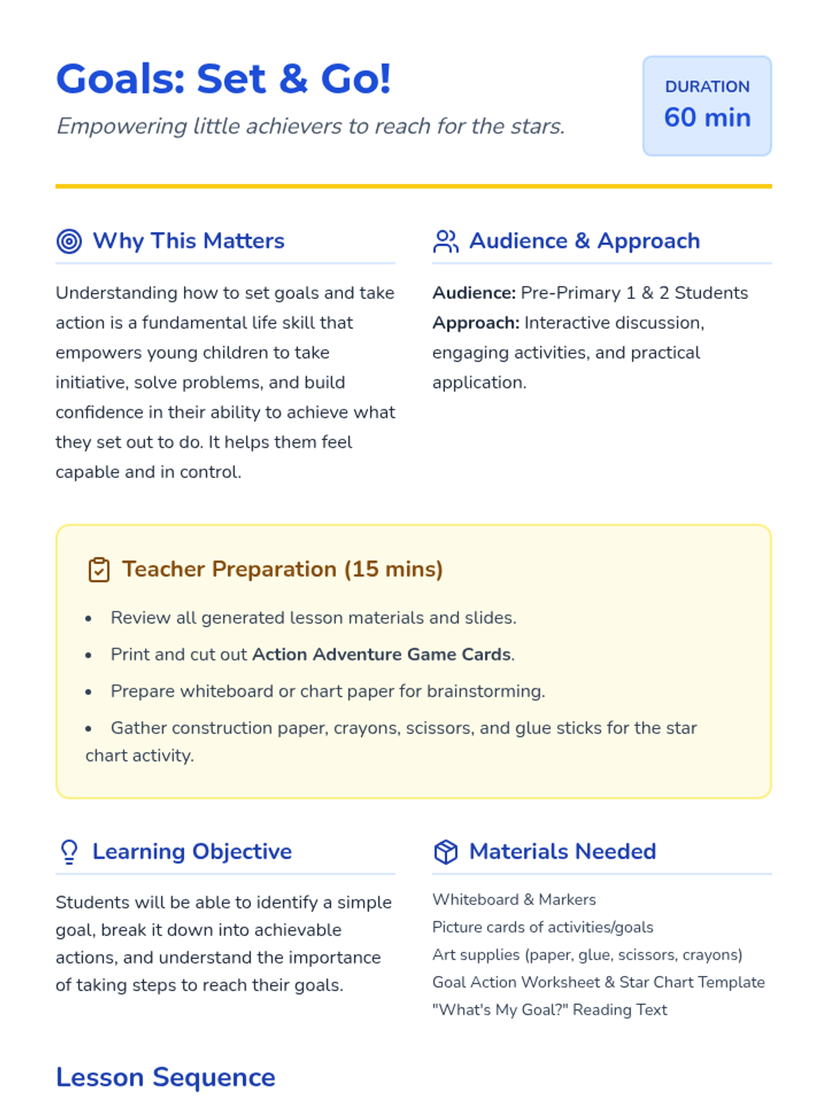 This lesson introduces Pre-Primary 1 & 2 students to the concept of setting simple goals and taking actionable steps to achieve them. Students learn to break down desired outcomes into smaller, manageable actions, fostering self-efficacy and accomplishment.