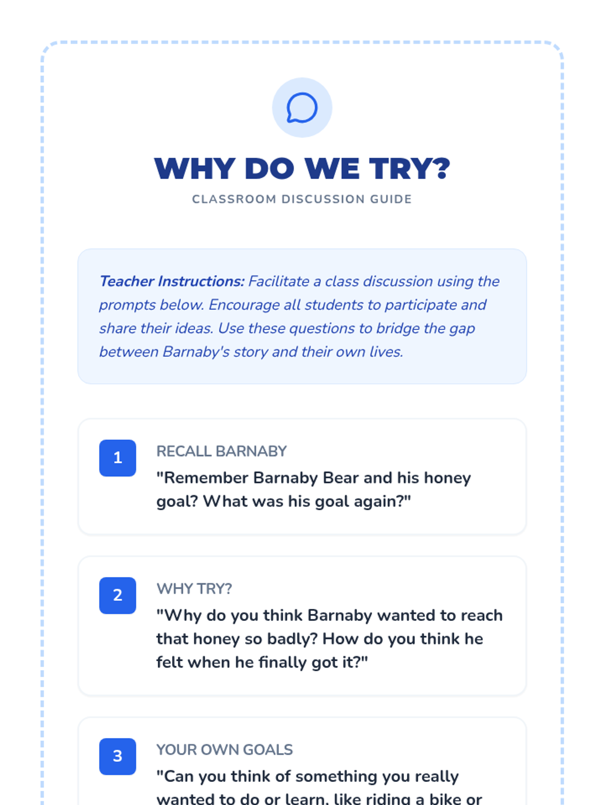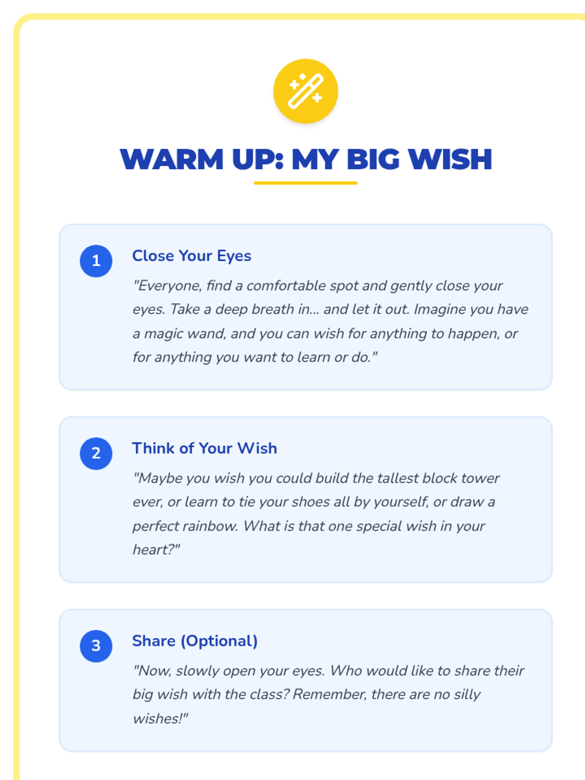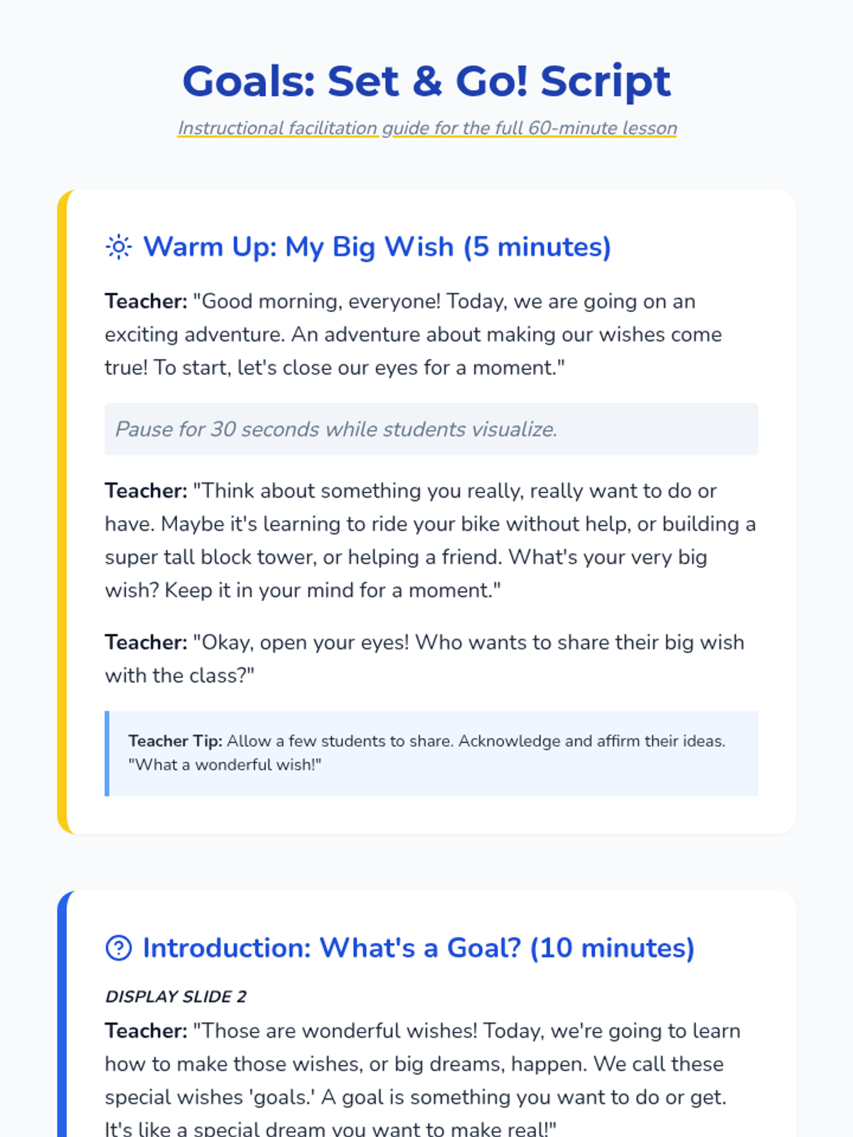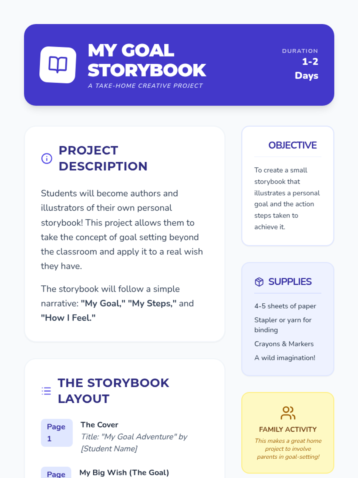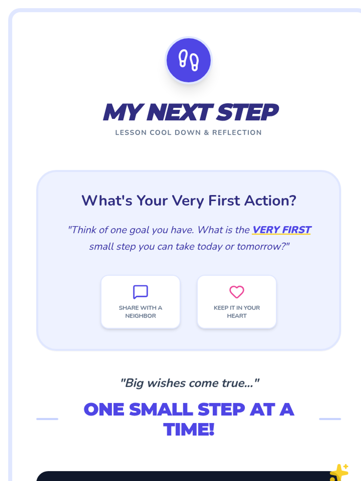 This lesson introduces Pre-Primary 1 & 2 students to the concept of setting simple goals and taking actionable steps to achieve them. Students learn to break down desired outcomes into smaller, manageable actions, fostering self-efficacy and accomplishment.