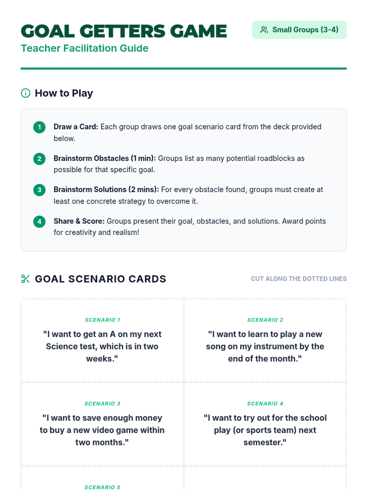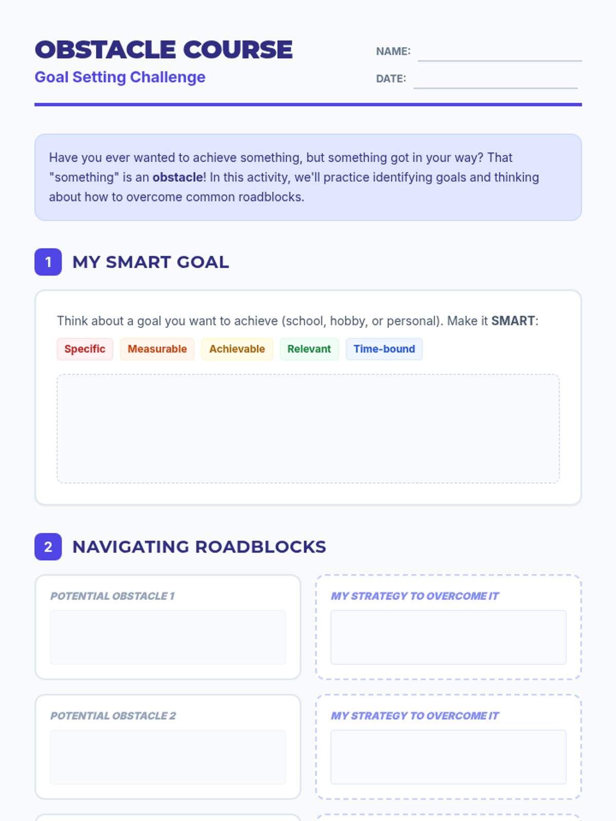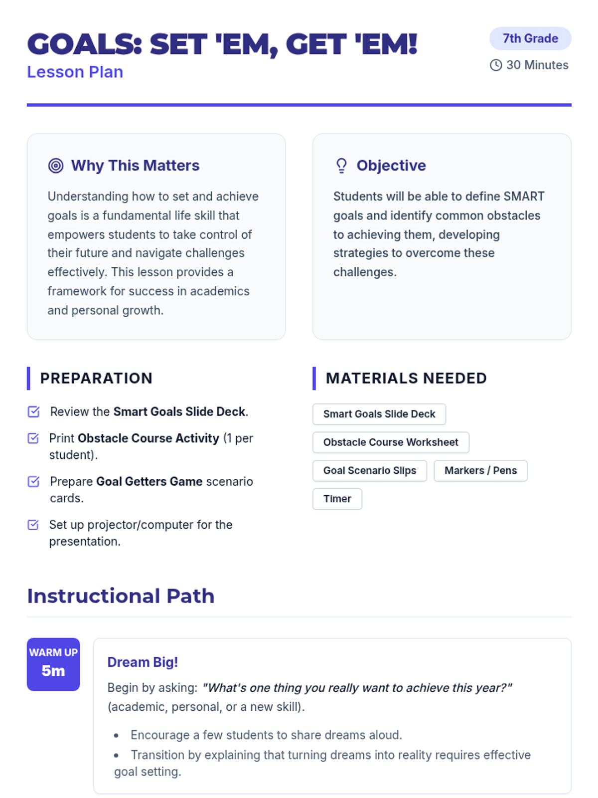 A 30-minute lesson for 7th graders to learn SMART goal setting and strategies for overcoming obstacles to achieve success.