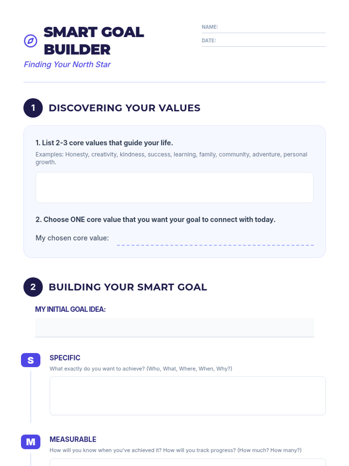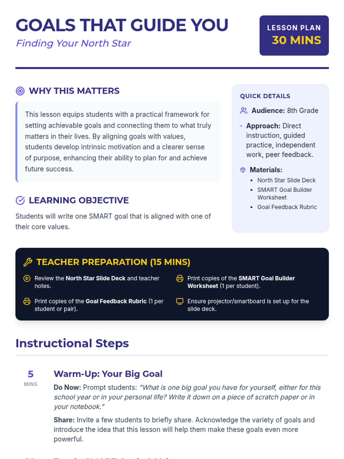 This lesson helps 8th-grade students learn to write effective SMART goals aligned with their personal values, equipping them with a framework for achieving aspirations.
