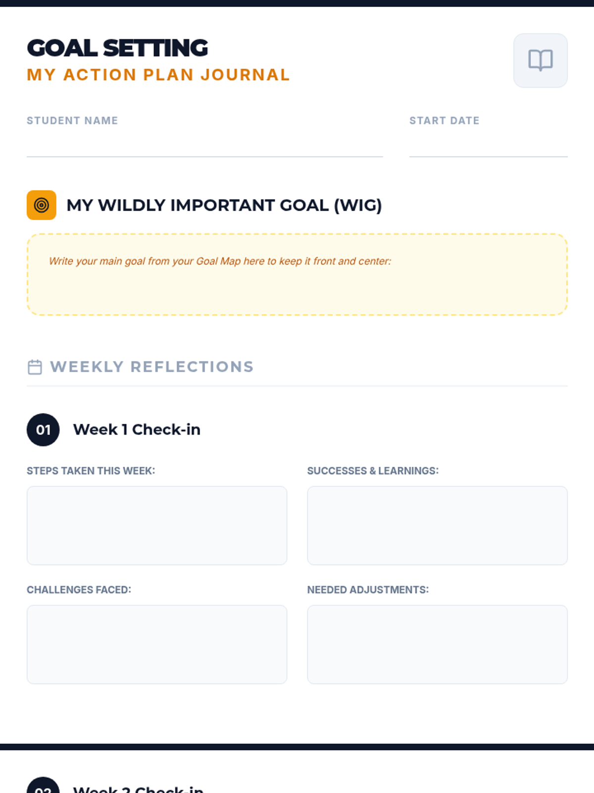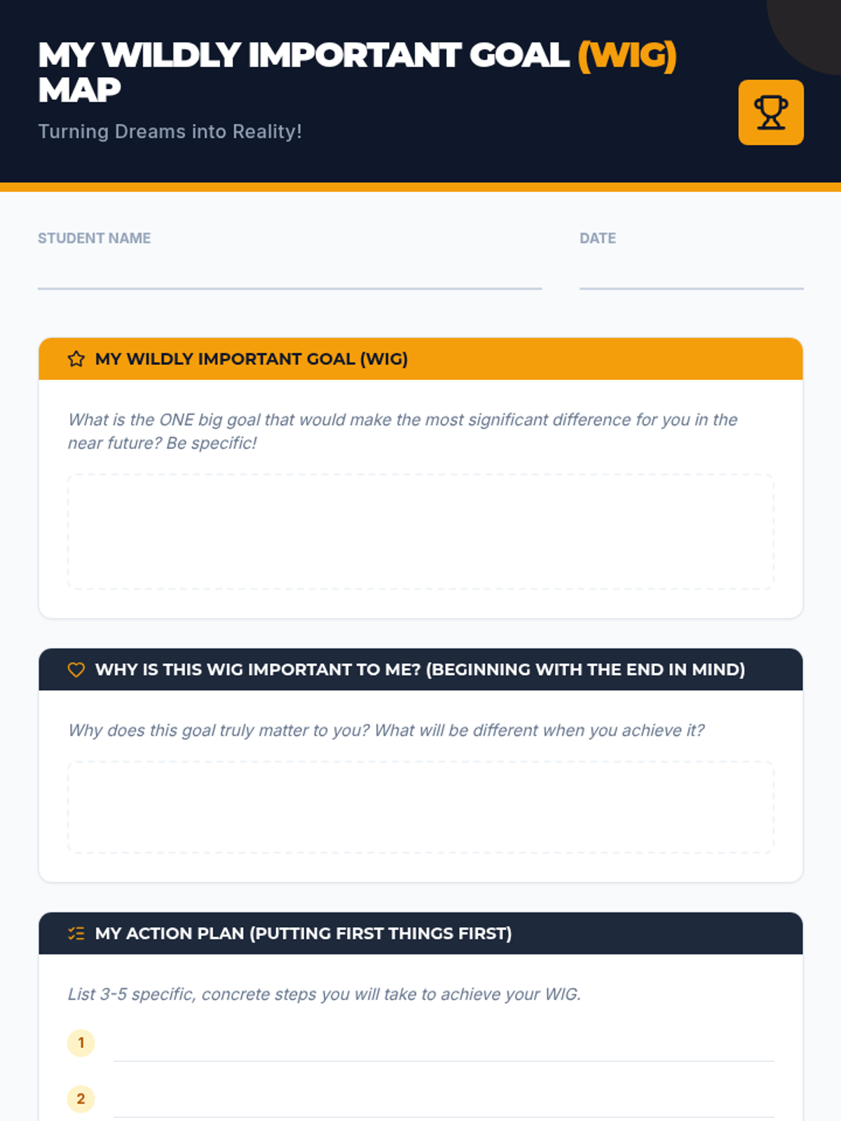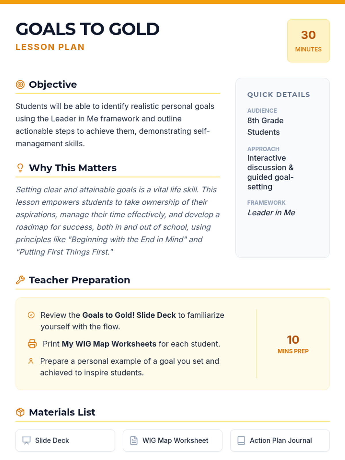 An interactive 30-minute lesson for 8th graders on setting 'Wildly Important Goals' (WIGs) using the Leader in Me framework. Students learn to break down big dreams into actionable steps with lead measures and accountability plans.