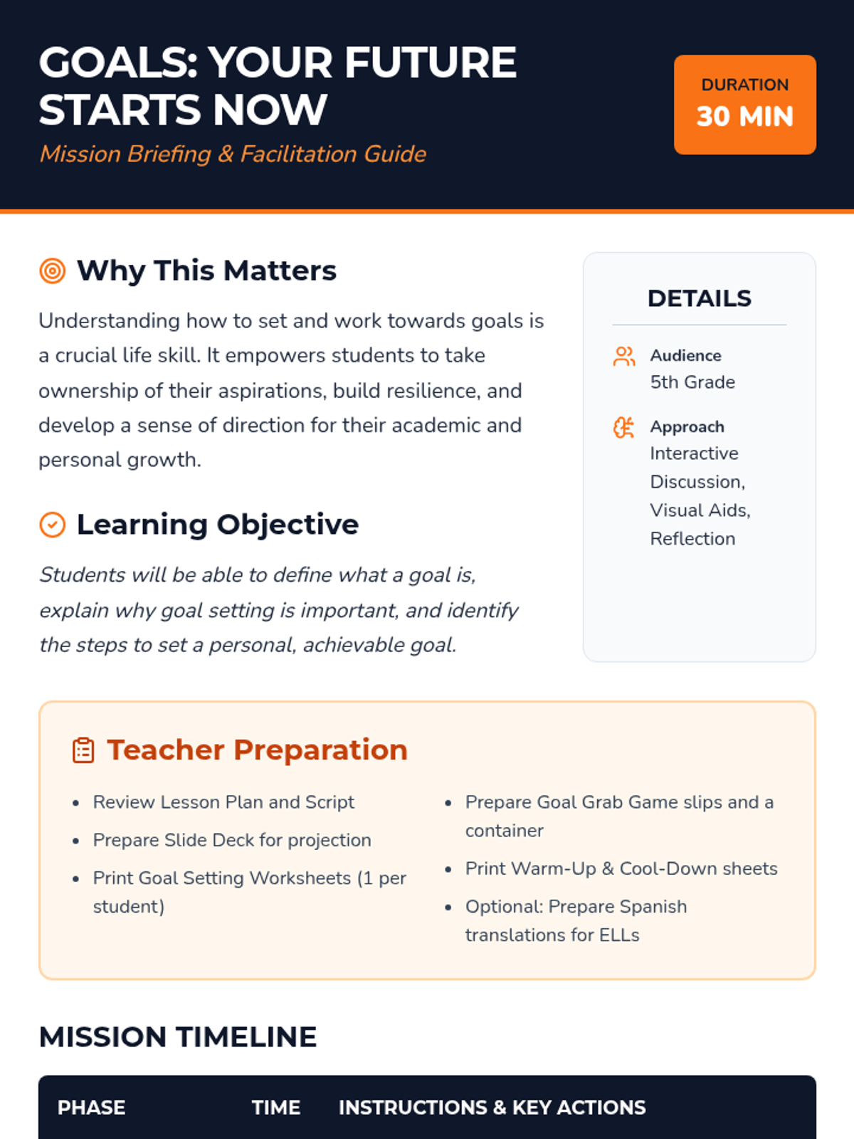 A 30-minute interactive lesson for 5th graders introducing the concept of goal setting using a simple framework to turn dreams into achievable plans.