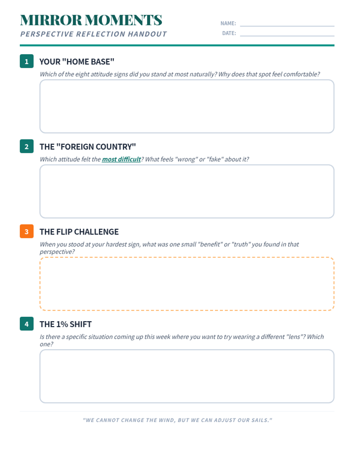 A session for adults focusing on identifying current perspectives, exploring the impact of different attitudes through interactive scenarios, and challenging oneself to adopt new viewpoints.